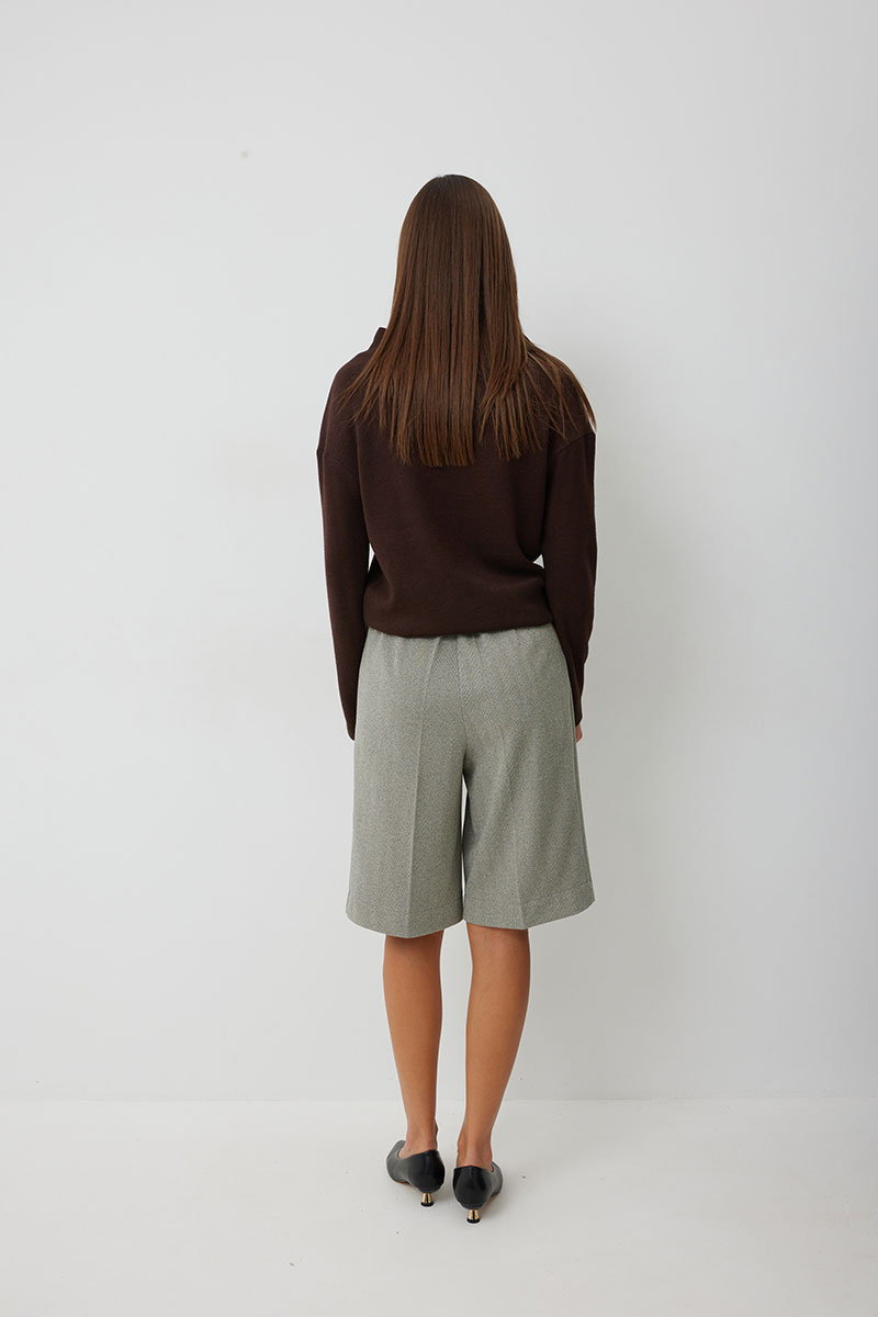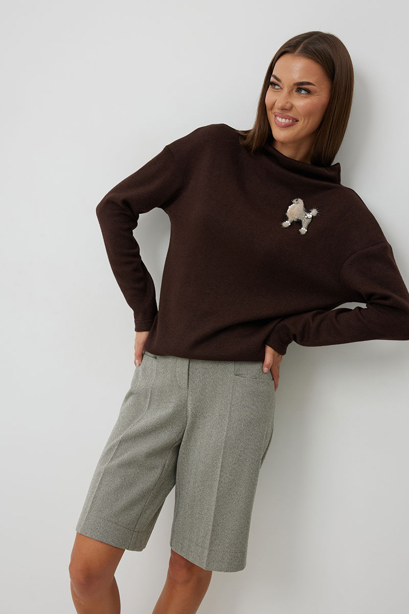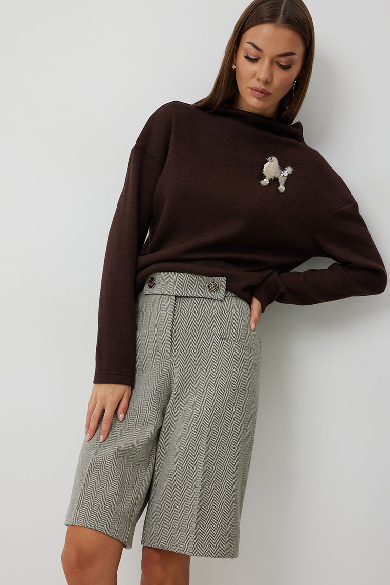 Блузон женский с цельнокроеной горловиной типа "хомут". Линия плеча и проймы спущены. Рукав втачной, одношовный. Блузон декорирован авторской брошью. Декоративные элементы и фурнитура могут отличаться от заявленных на фото.