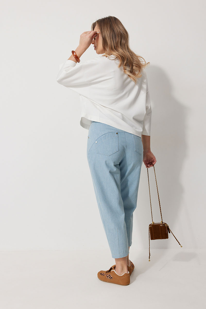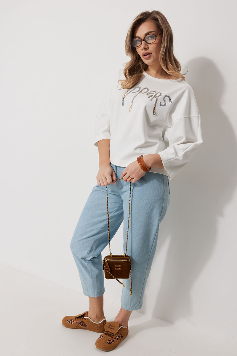 Джемпер женский прямого силуэта «летучая мышь» с округлой горловиной и спущенной линией плеча. По переду в области груди расположена авторская вышивка с пришивным декором. Рукав двухшовный 3/4 соединен с отрезным бочком полочки и спинки.