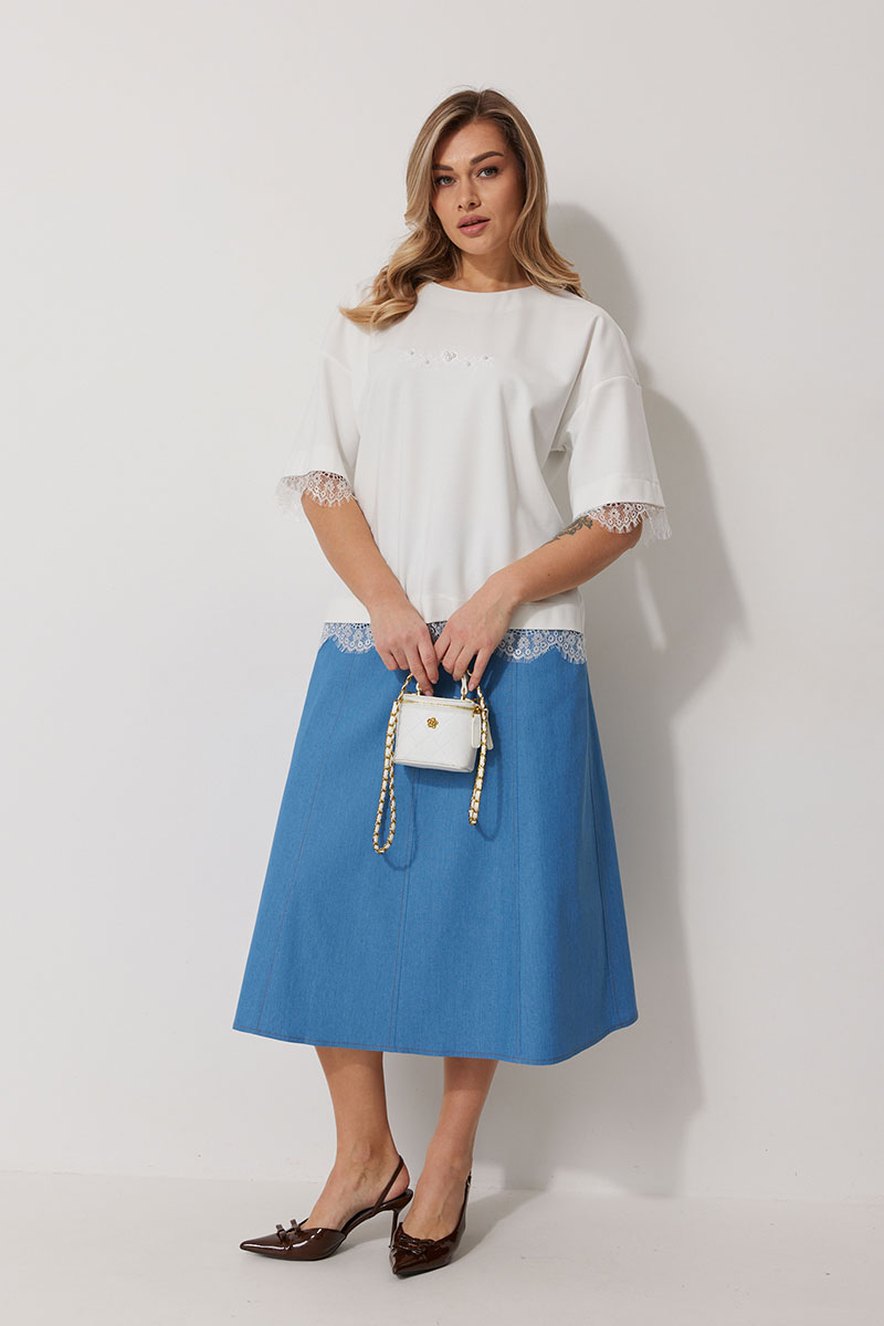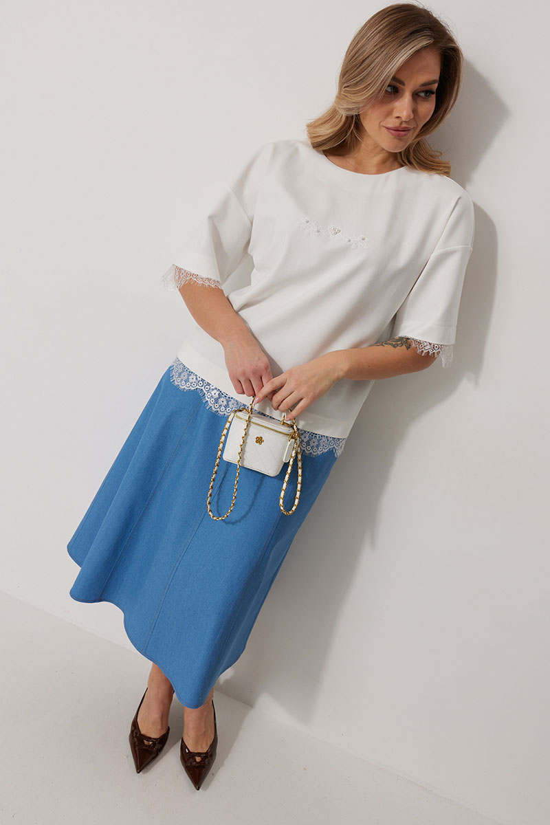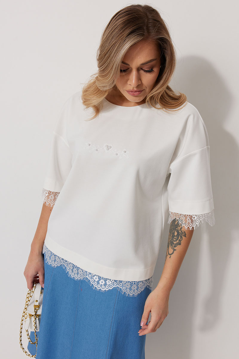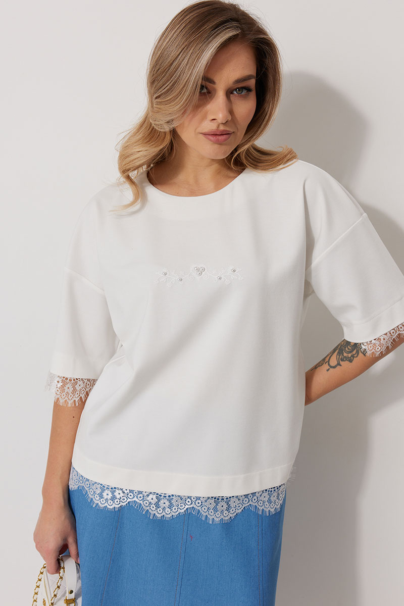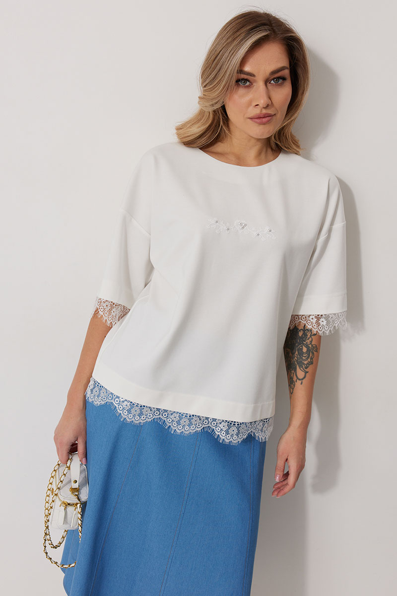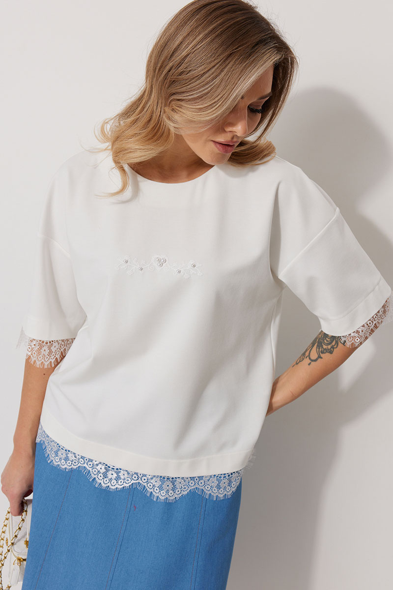 Джемпер женский прямого силуэта со спущенной линией плеча. По переду авторская печать декорированная бусинами. Горловина округлой формы, обработана обтачкой. Рукав втачной одношовный, 3/4 длины. Низ изделия и низ рукава обработаны притачным ажурным кружевом.