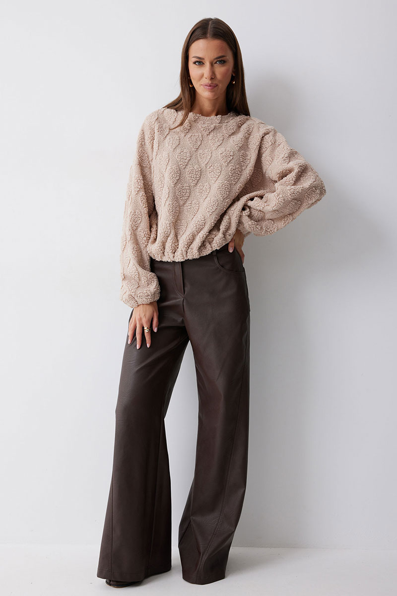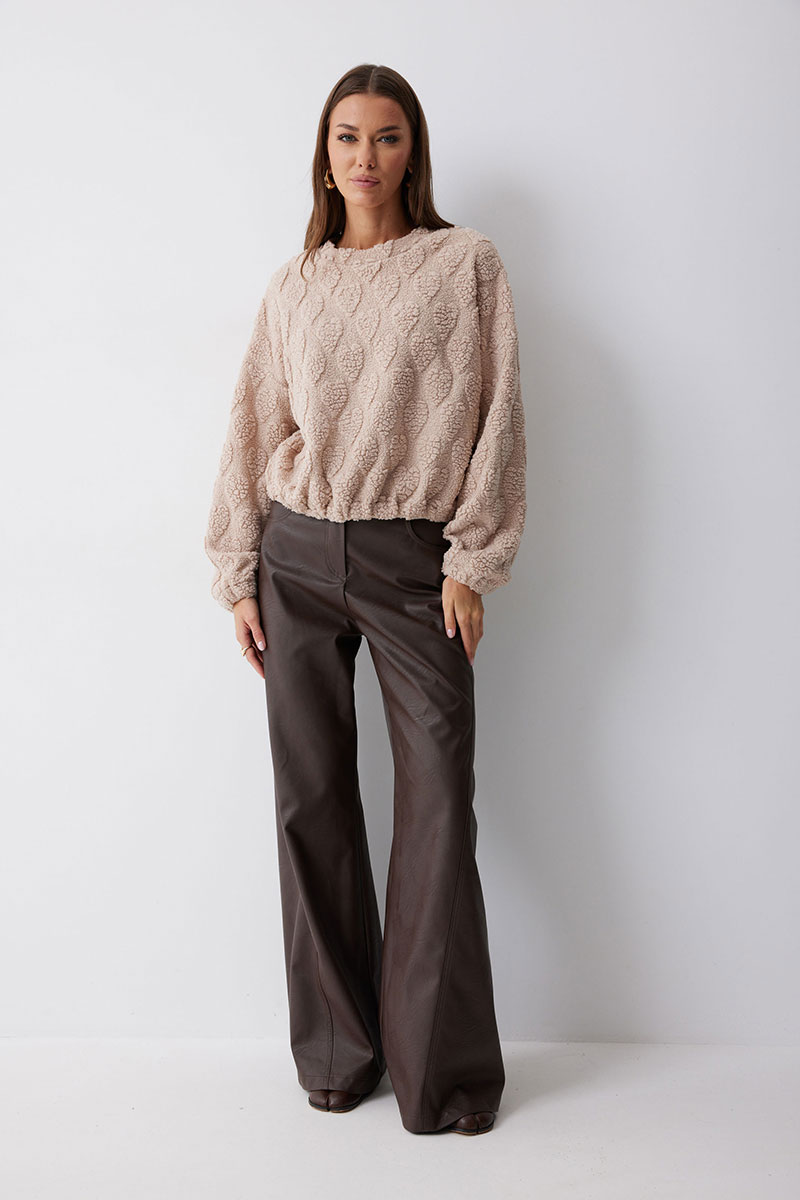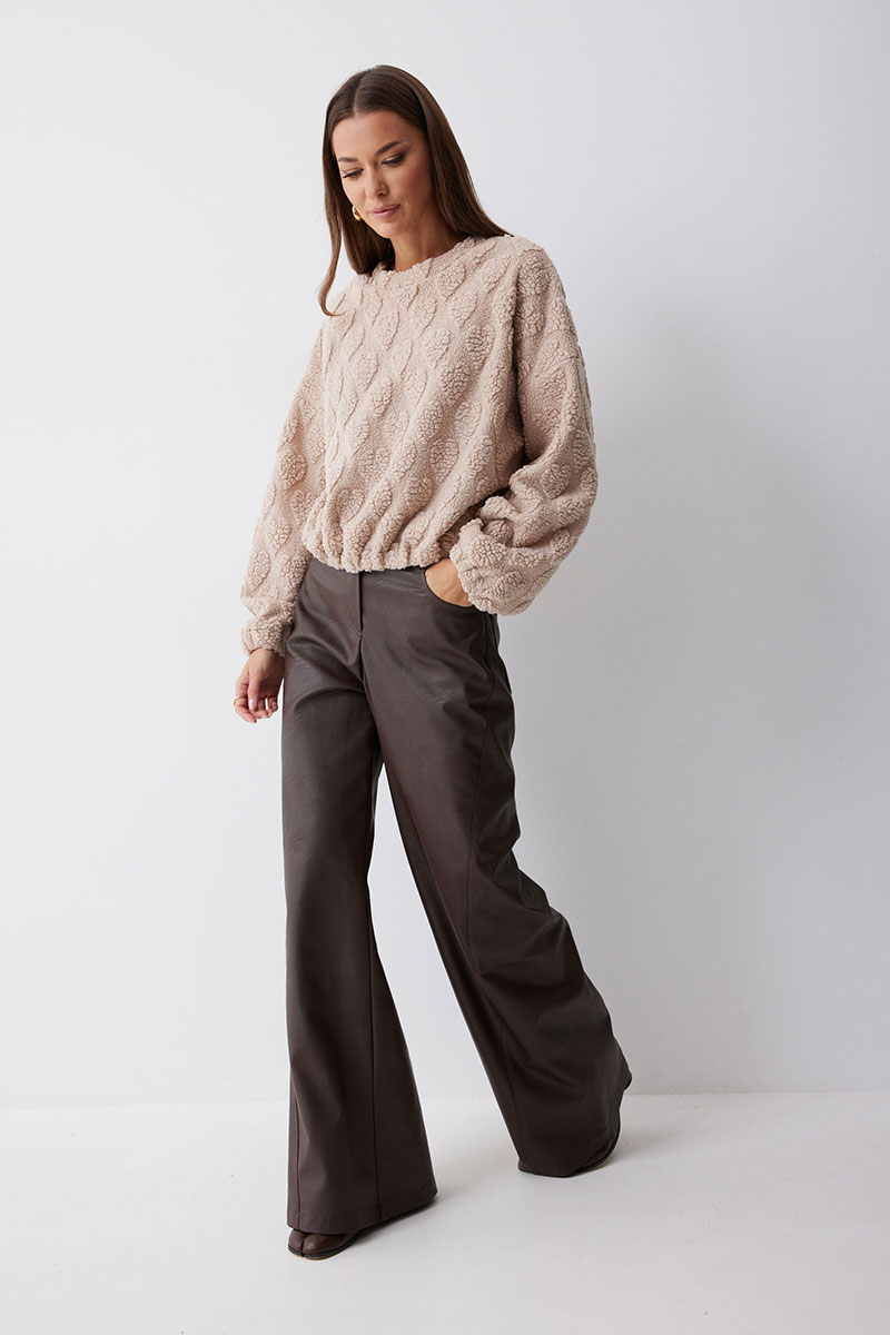 Укороченный джемпер прямого силуэта из трикотажного полотна. Горловина округлая. Рукав со спущенной линией плеча, по низу резинка. По низу джемпера резинка.