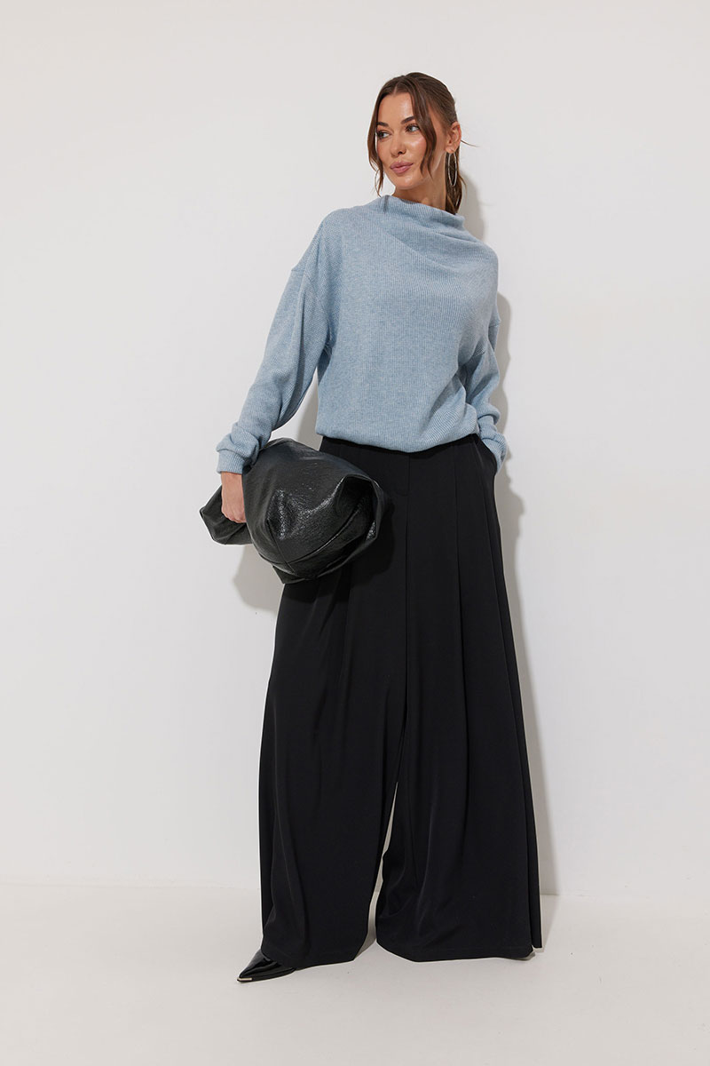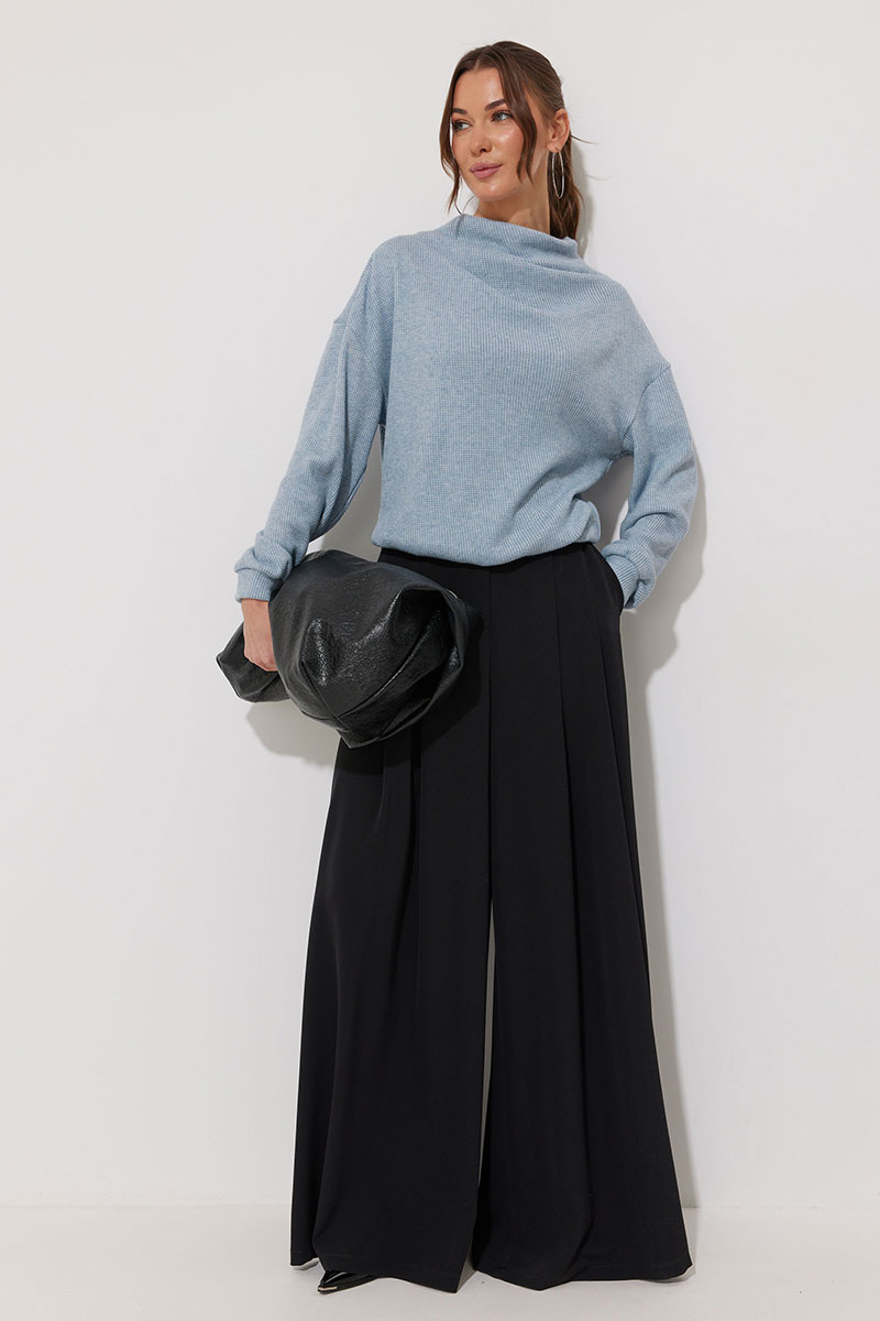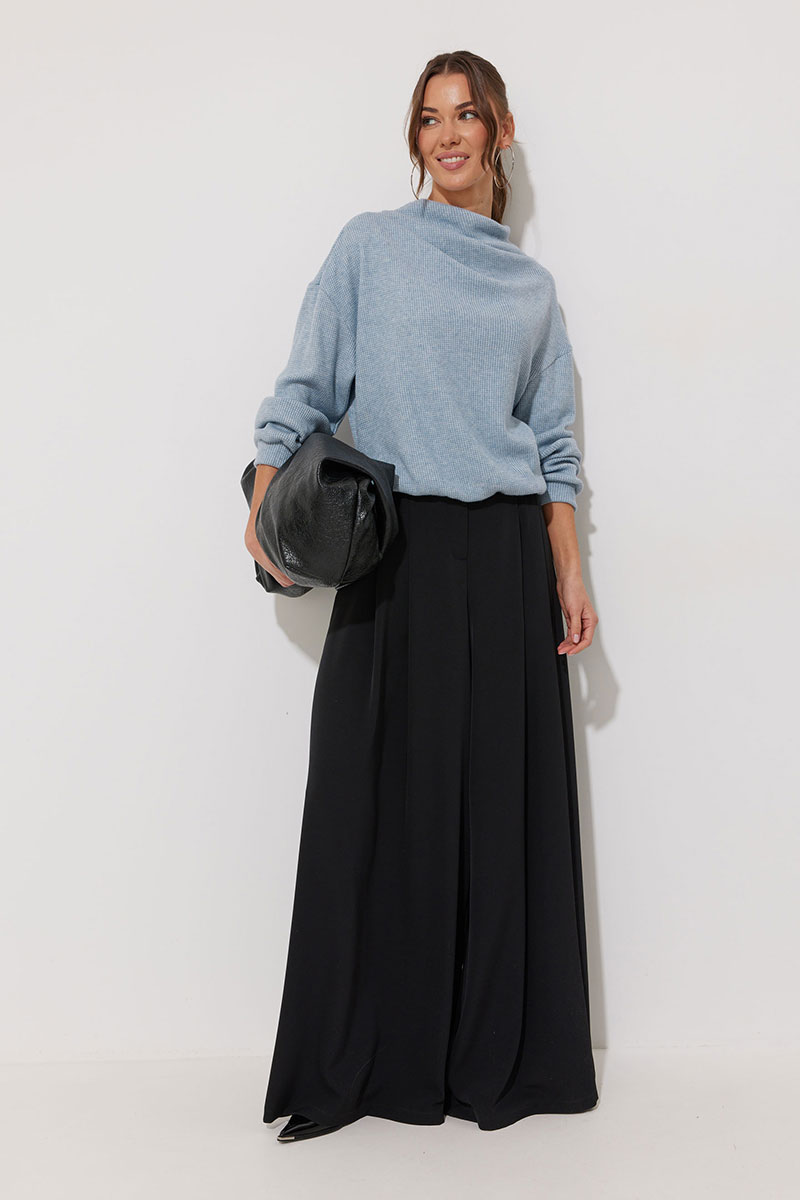Джемпер из трикотажного полотна , прямого, слегка расширенного силуэта, со спущенной линией плеча. По горловине цельнокроеная стойка. На стойке и плече две складки. Рукав длинный с манжетой с резинкой. По низу джемпера пояс с резинкой.