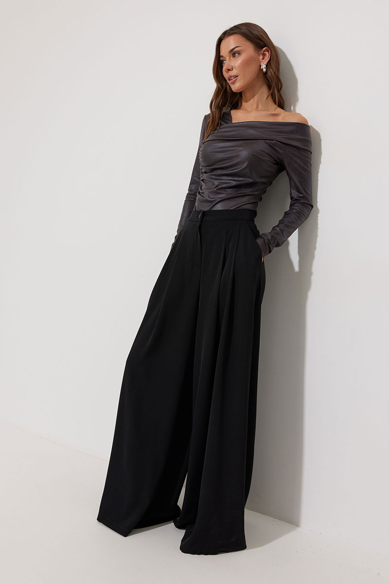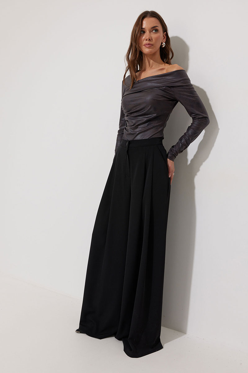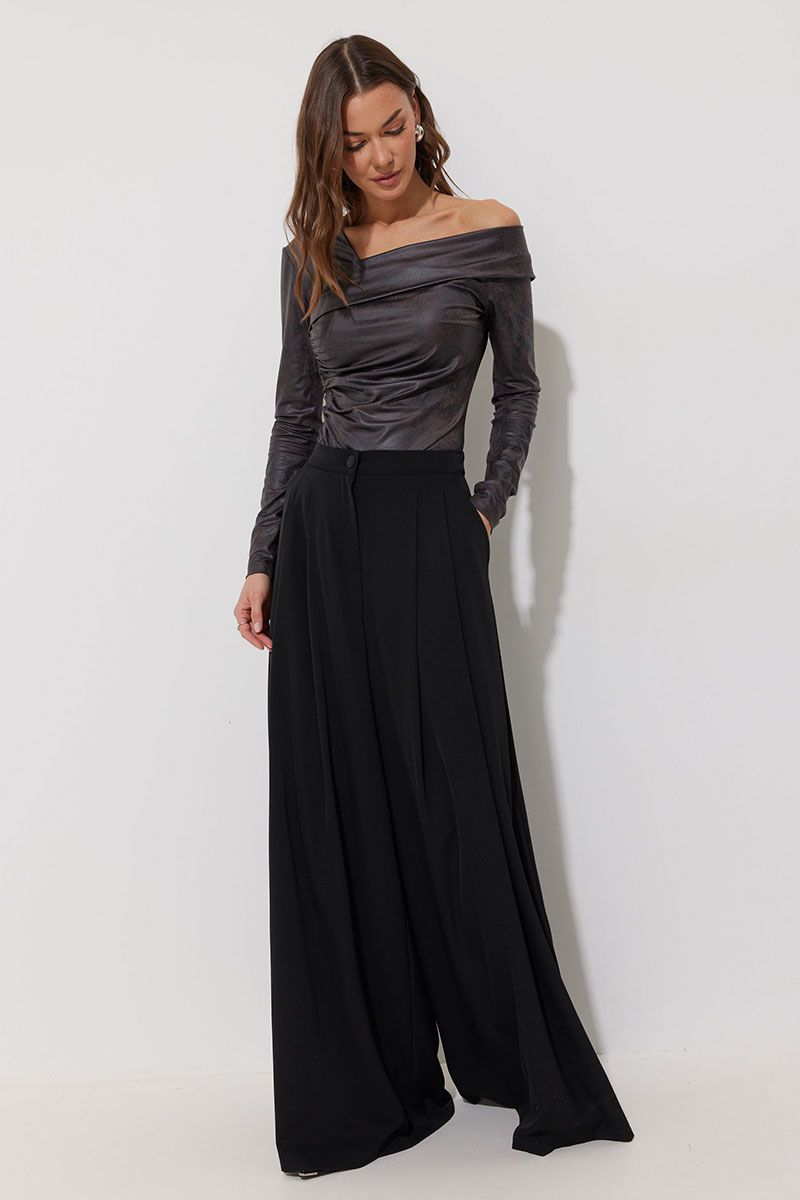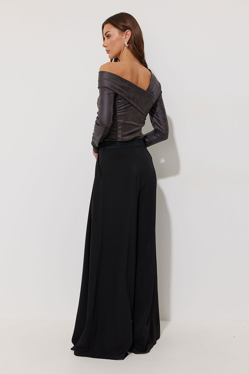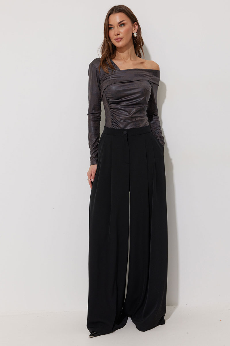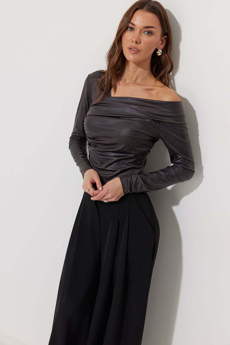 Ассиметричный джемпер прилегающего силуэта из трикотажного полотна. Верхняя часть джемпера с ассиметричным вырезом. Рукав одношовный втачной. По переду нагрудная вытачка и рельеф со сборкой.