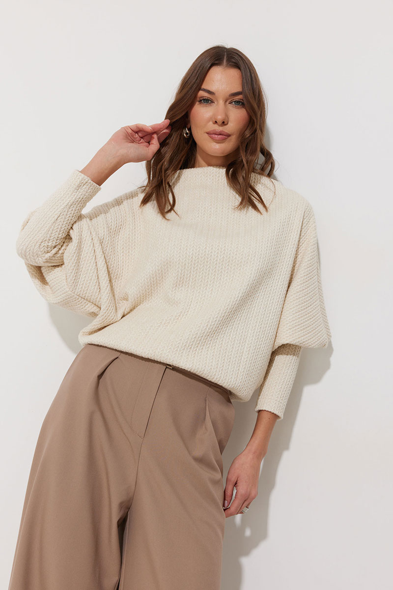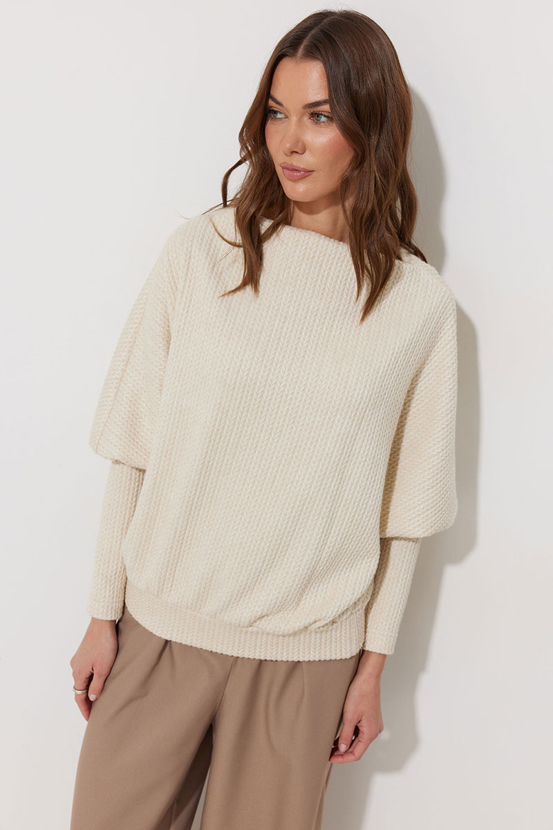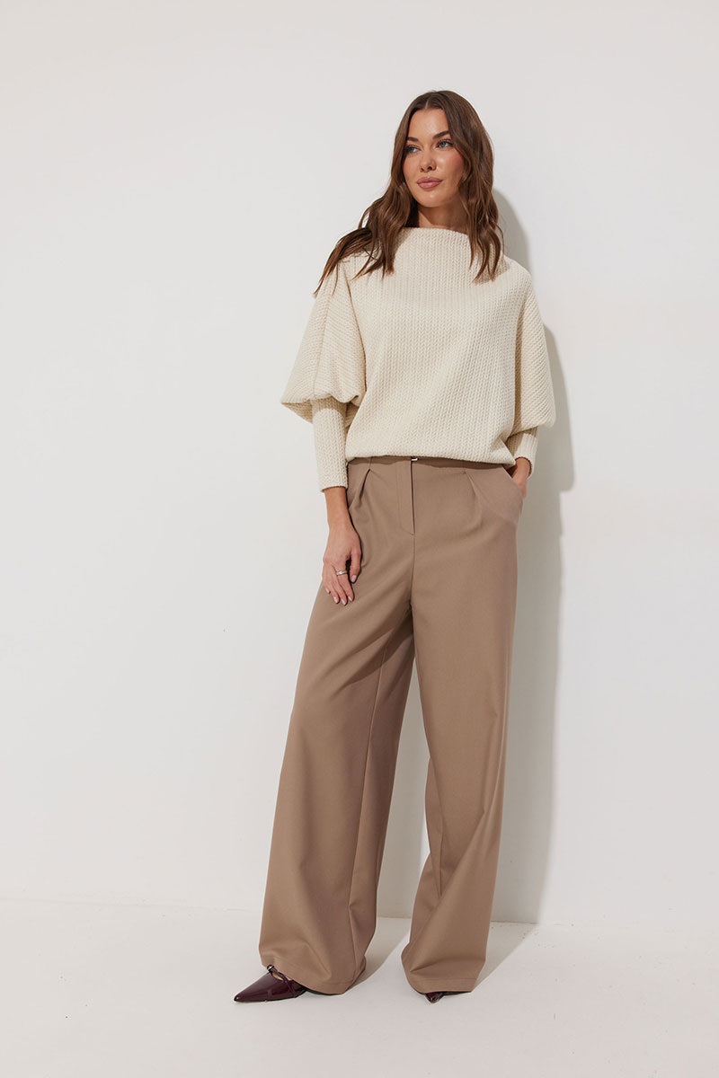 Джемпер полуприлегающего силуэта из трикотажного полотна. Горловина - цельнокроеная стойка. Рукав цельнокроеный, с подрезом и узкой длинной манжетой. По низу джемпера – притачная планка.
