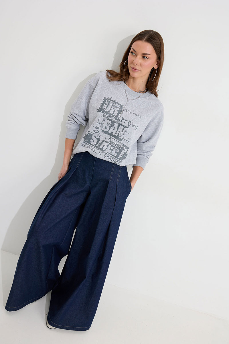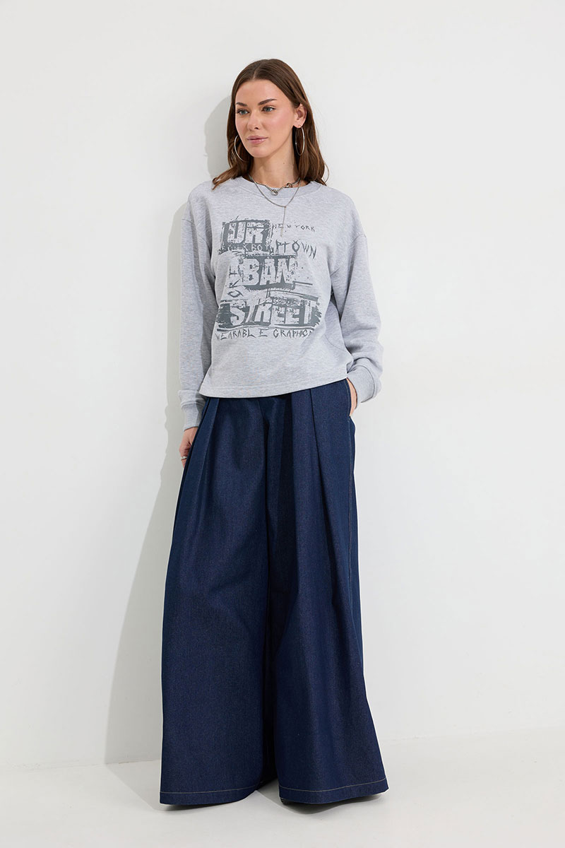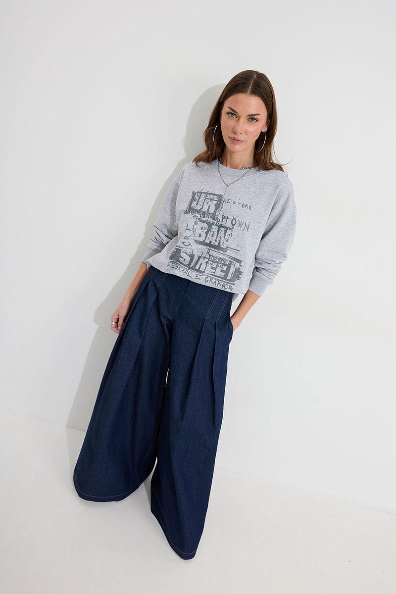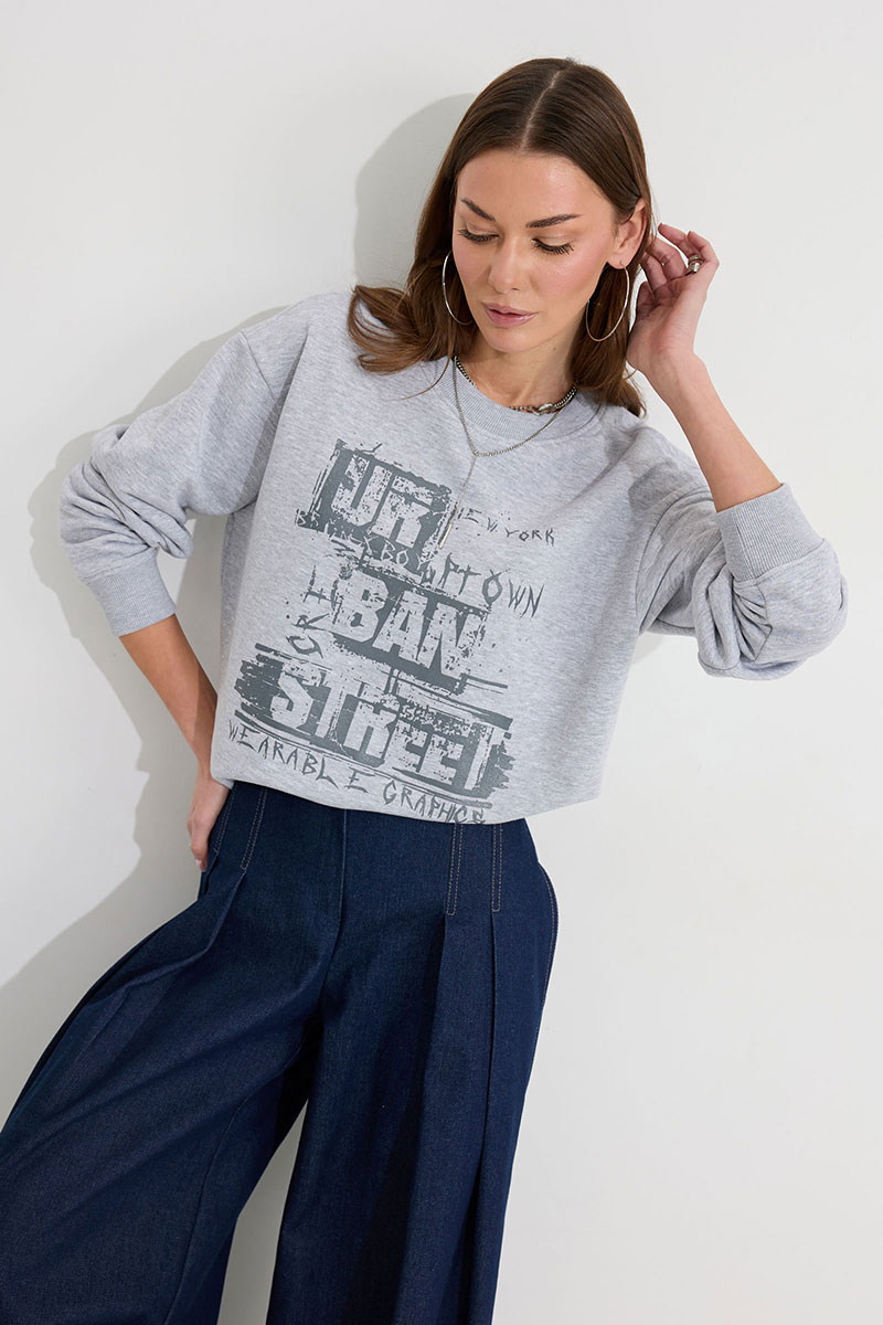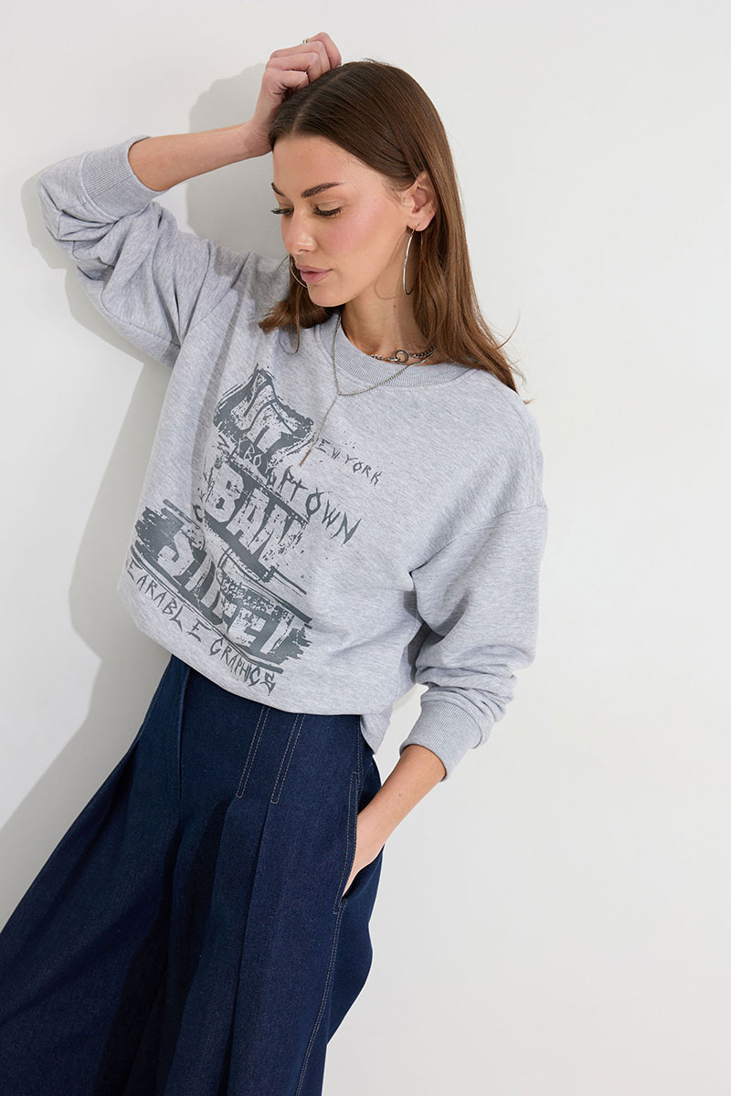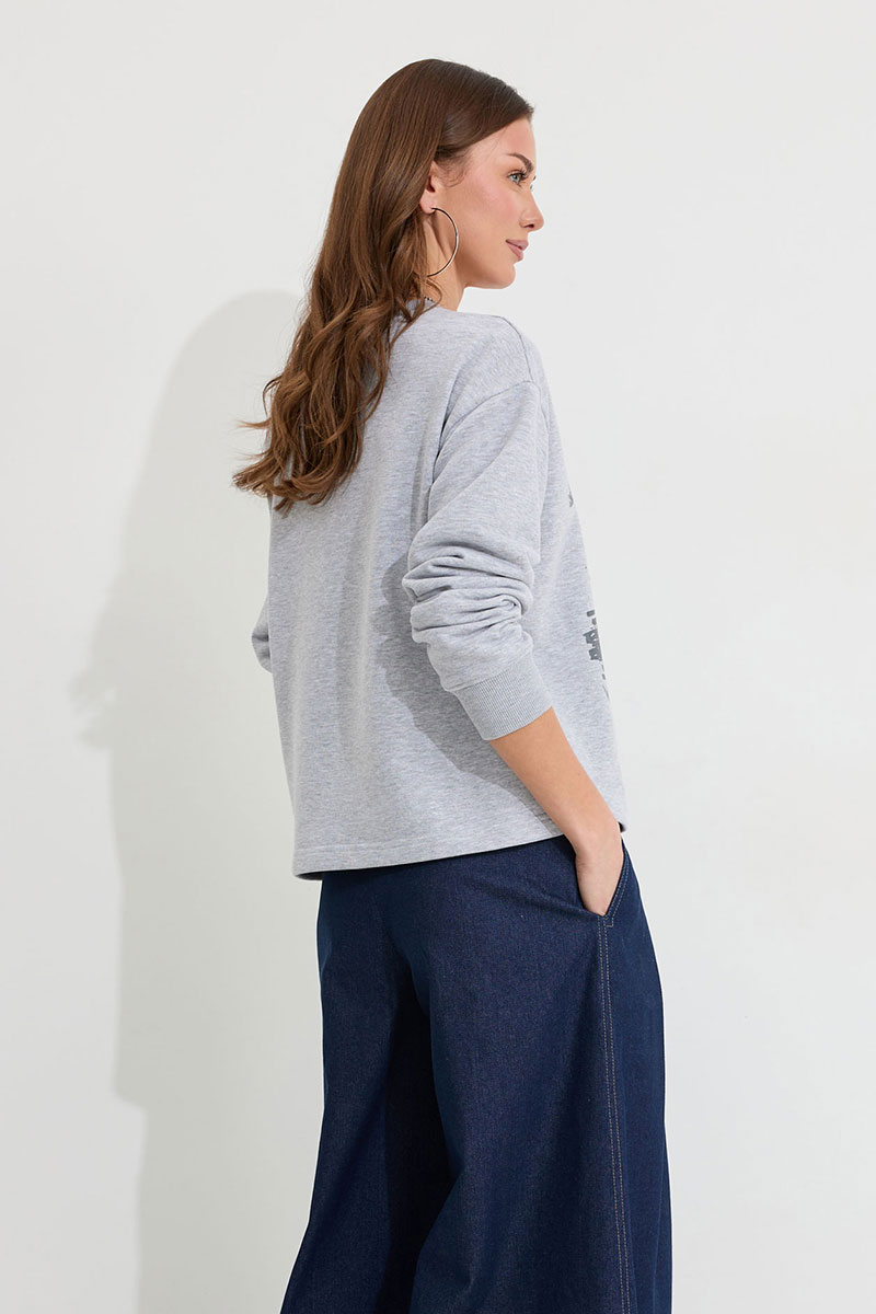 Джемпер прямого силуэта из трикотажного полотна. Горловина округлая. Рукав со спущенной линией плеча, по низу манжета. По переду дизайнерская печать.