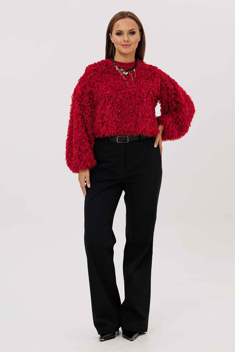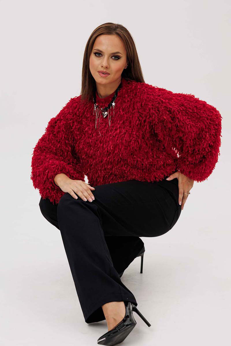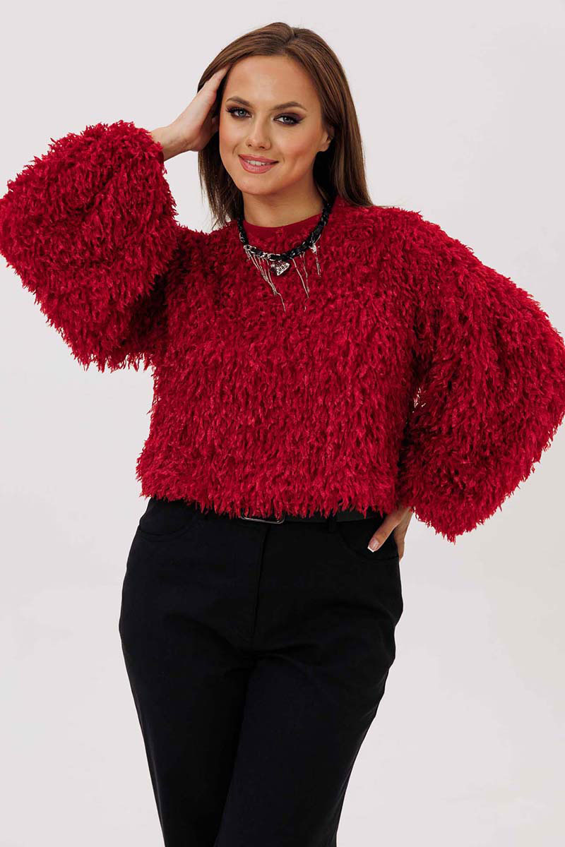 Джемпер женский свободного силуэта из трикотажной ткани "травка". Рукав широкий, со спущенным плечом, по окату заложенные складки, понизу складки и трикотажный манжет. Воротник-стойка на трикотажной бейке. Джемпер на трикотажной подкладке.