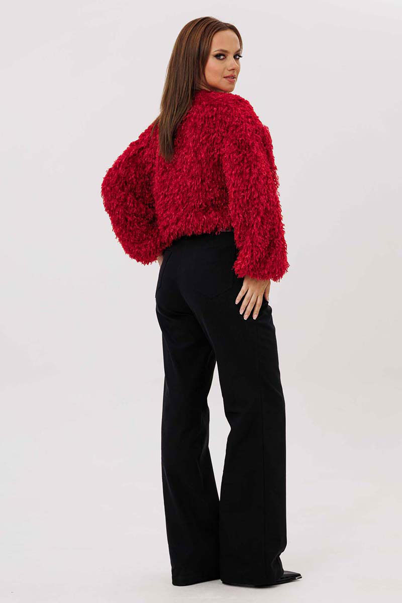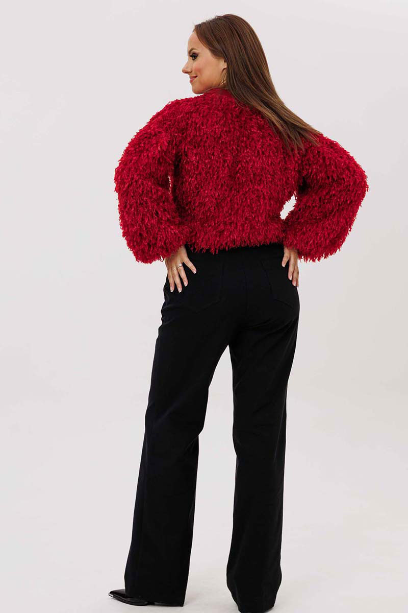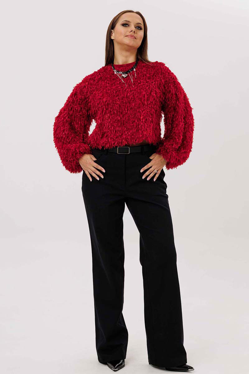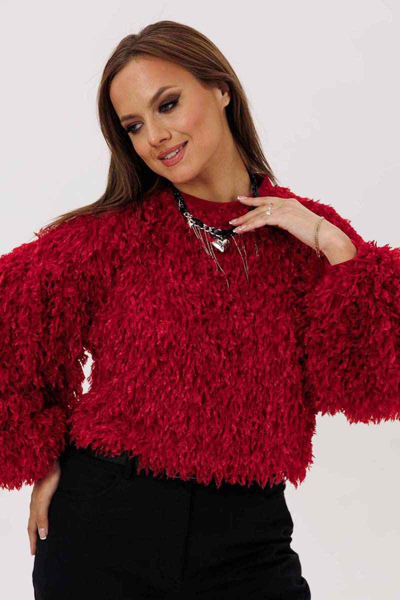 Джемпер женский свободного силуэта из трикотажной ткани "травка". Рукав широкий, со спущенным плечом, по окату заложенные складки, понизу складки и трикотажный манжет. Воротник-стойка на трикотажной бейке. Джемпер на трикотажной подкладке.