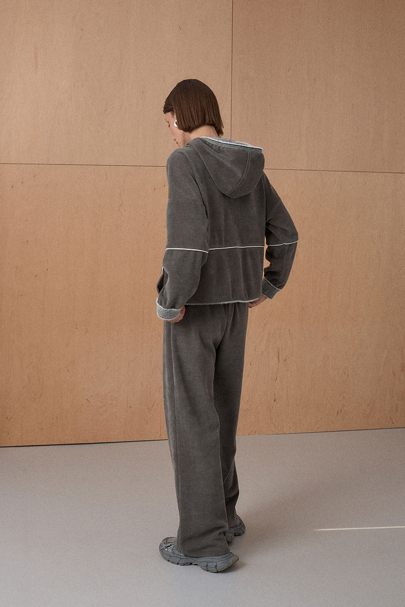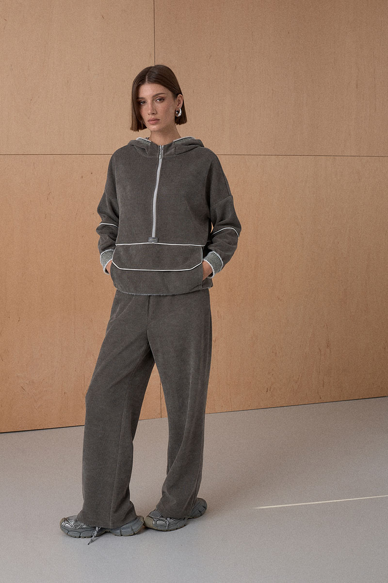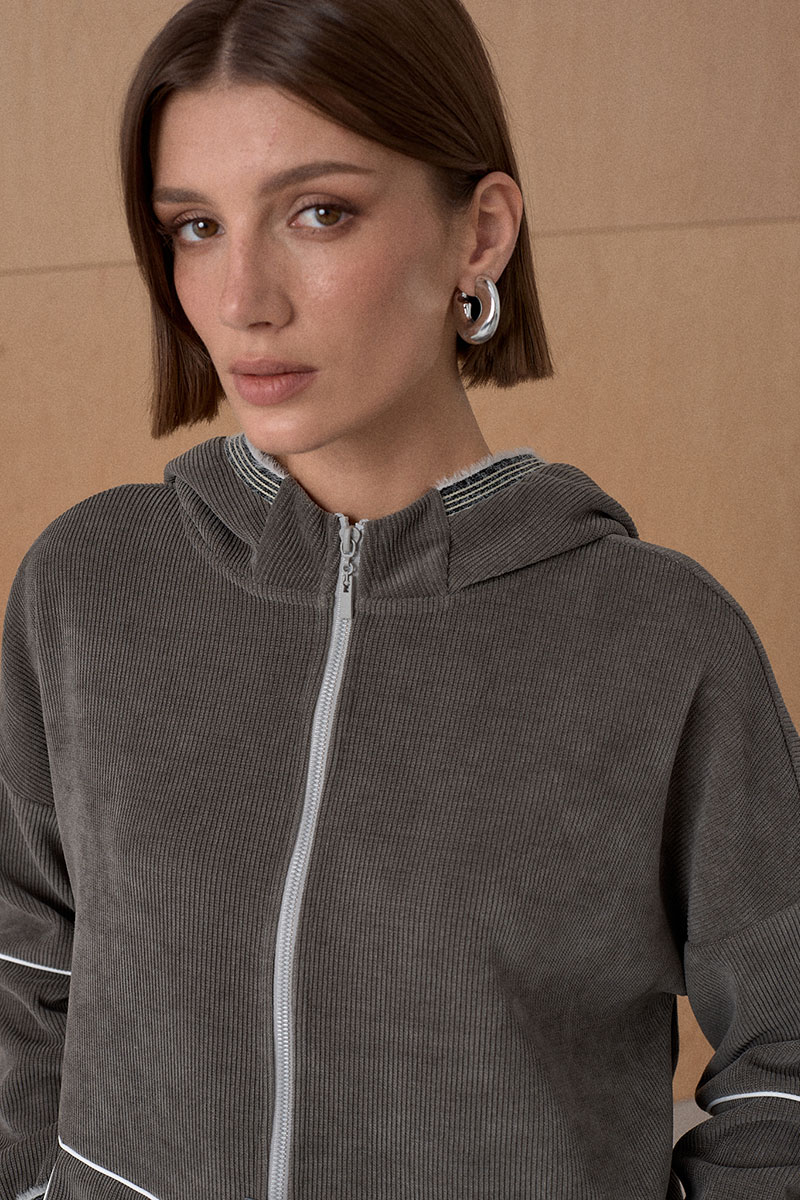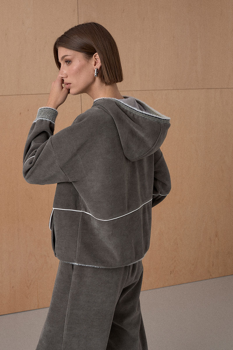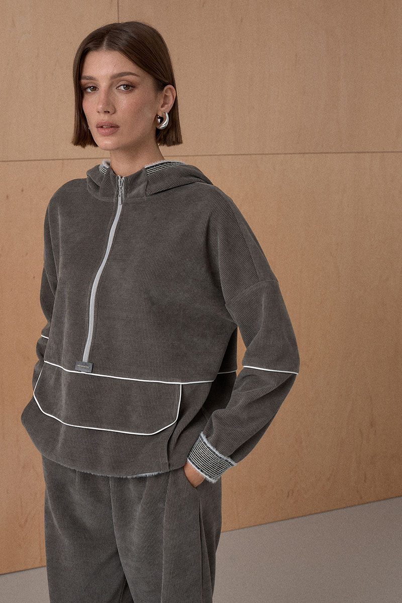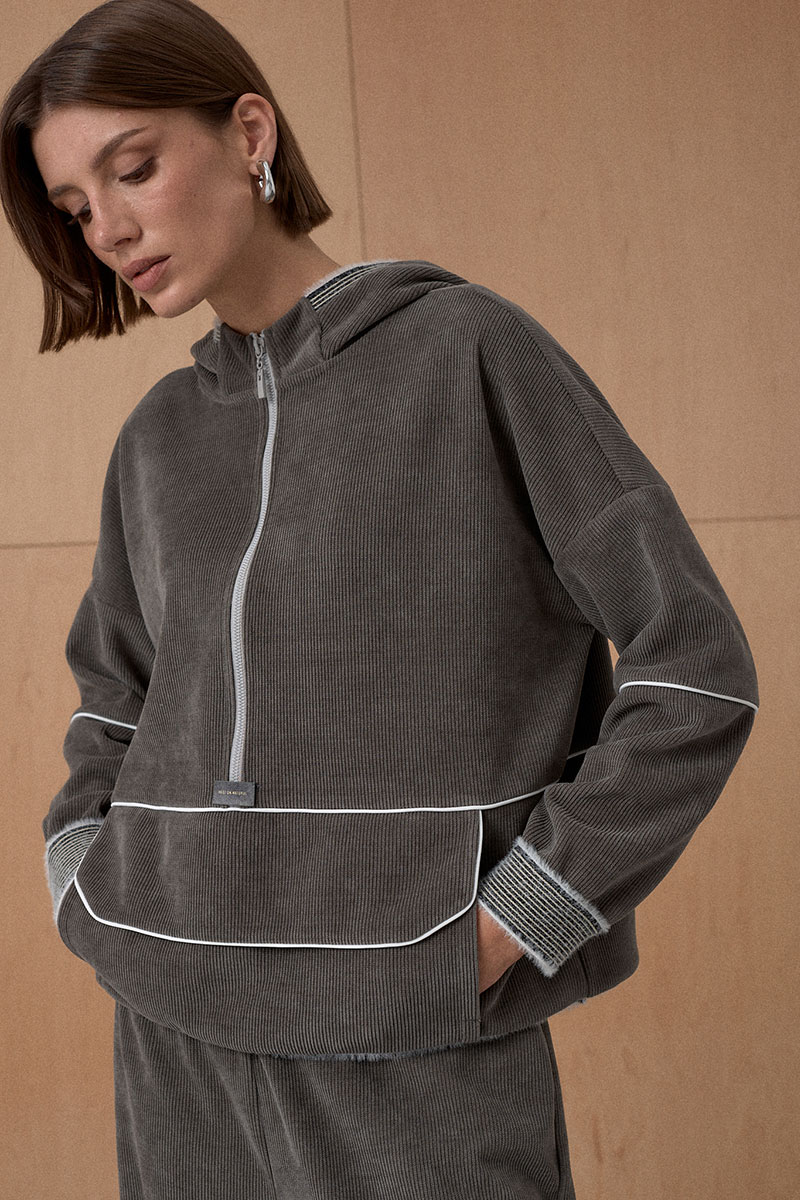Джемпер из фактурной ткани. На молнии и передним карманом. Джемпер с капюшоном.