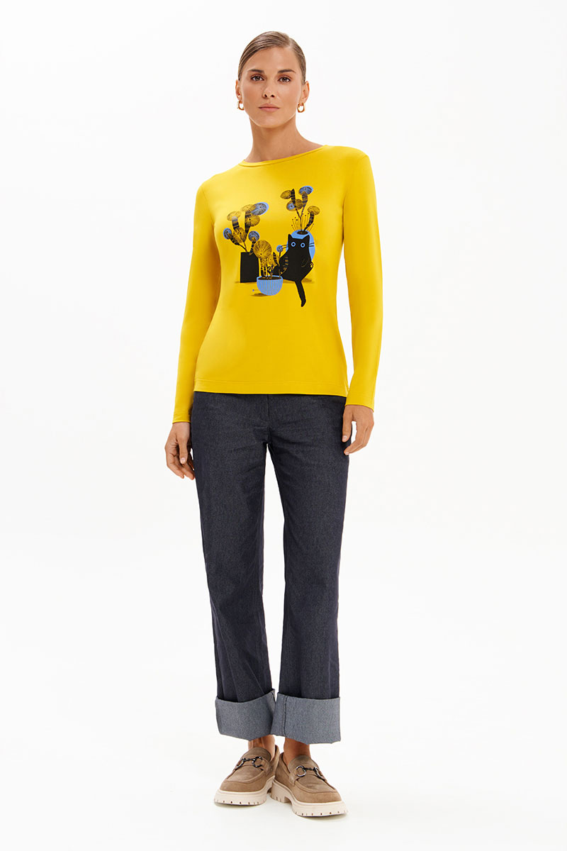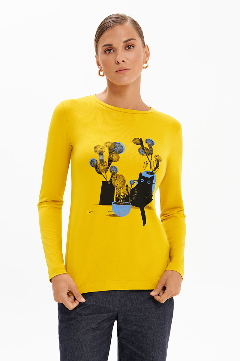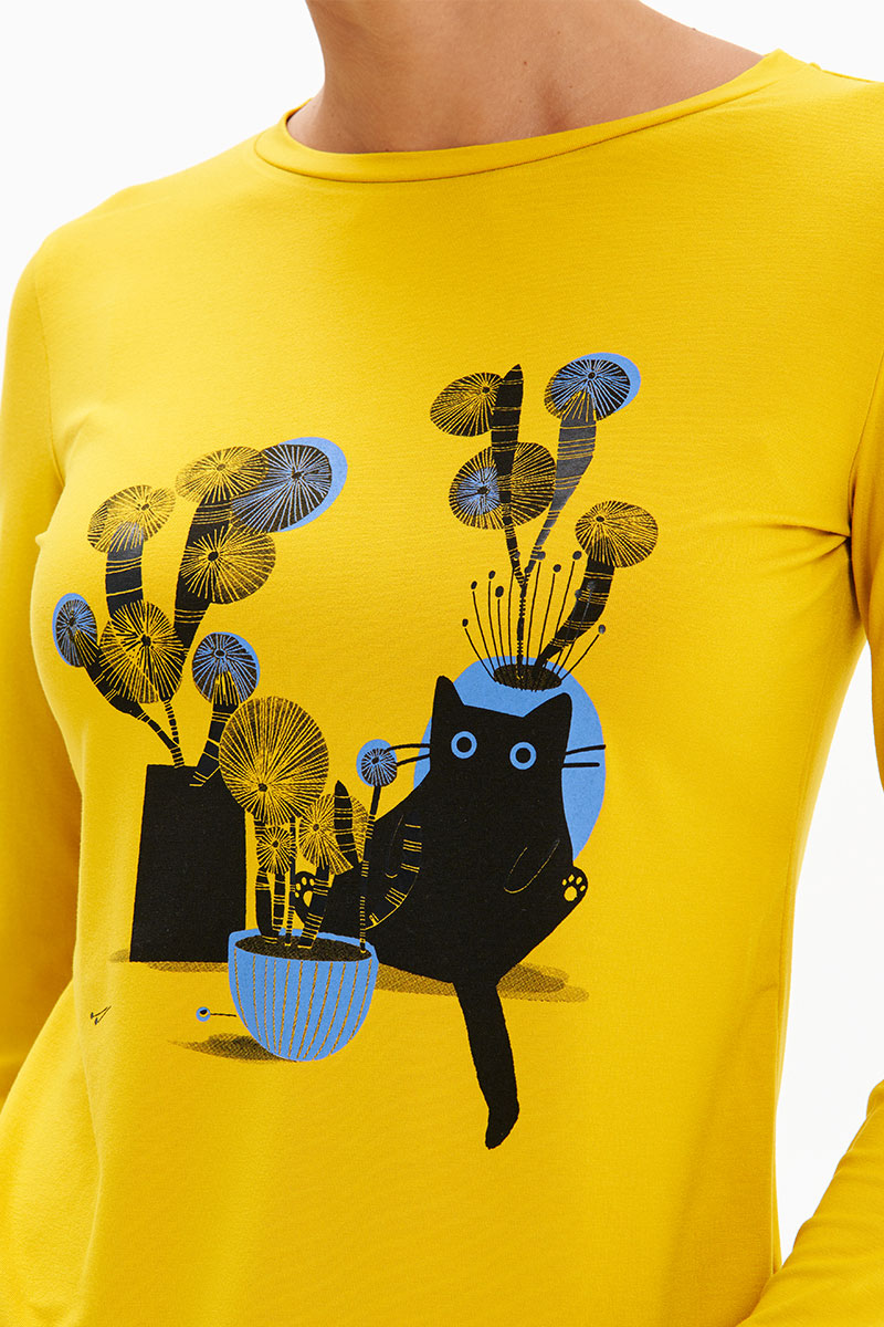 Тёплый и пряный оттенок карри делает этот лонгслив с забавным принтом невероятно стильным и атмосферным. Насыщенный цвет идеально подходит для золотой осени, создавая яркий и позитивный акцент в образе. Принт с задумчивым котом в окружении тропических листьев добавляет нотку игривости и эклектики. Свободный крой обеспечивает максимальный комфорт, делая его идеальным для активного дня в городе или неспешного отдыха на выходных. Этот лонгслив заряжает оптимизмом и прекрасно комбинируется с базовыми вещами нейтральных оттенков, позволяя рисунку раскрыться во всей своей красоте. С любовью и заботой о Вас, команда брендов NELVA и FRIDAY by NELVA!