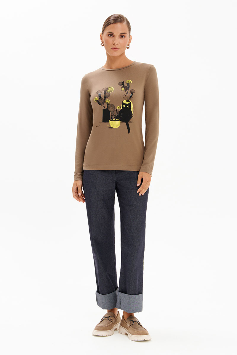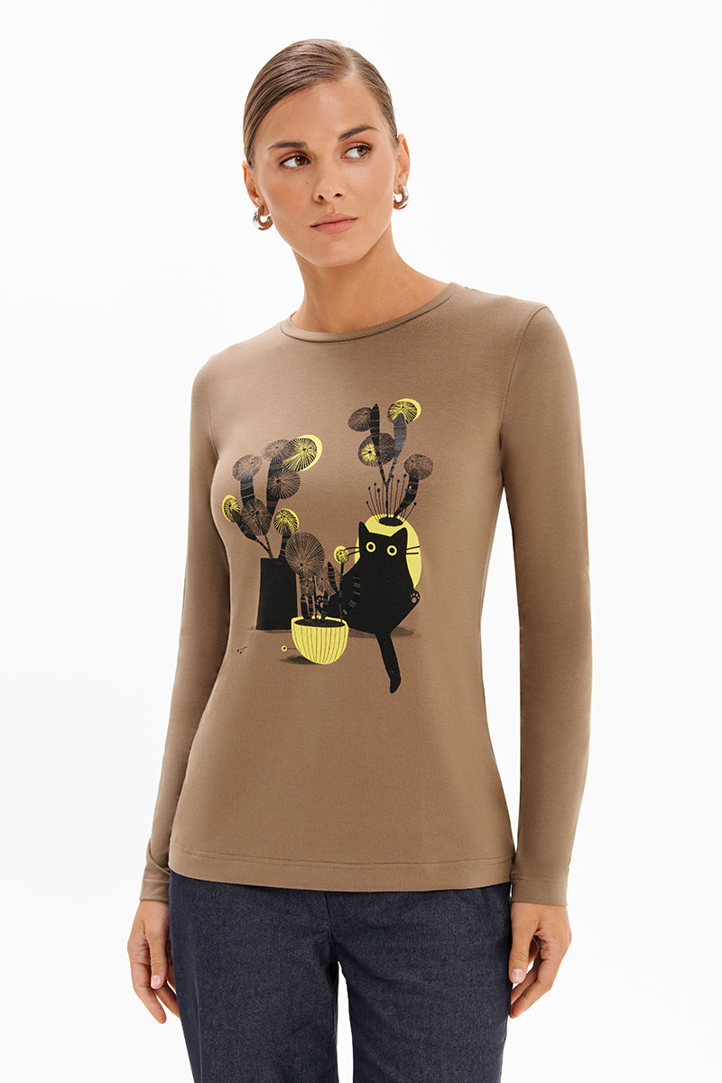 Насыщенный и благородный оттенок табака придаёт этому лонгсливу с принтом особую глубину и винтажный шарм. Этот цвет ассоциируется с уютными библиотеками, кожей и дорогим деревом, добавляя образу интеллектуальности и основательности. Игривый контраст с милым сюжетом — котом среди растений — создаёт intriguing баланс между серьёзностью и лёгкостью. Лонгслив прямого кроя из мягкого материала станет выразительным элементом вашего осенне-зимнего гардероба, который прекрасно дополнит образы в стиле casual и smart casual. С любовью и заботой о Вас, команда брендов NELVA и FRIDAY by NELVA!