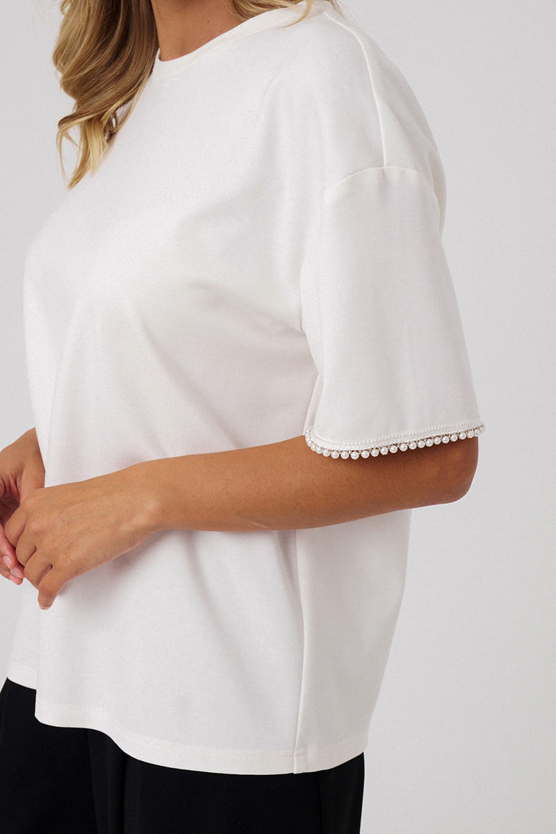 Женский джемпер молочного цвета из мягкого трикотажного полотна, созданный для комфортной повседневной носки. Модель характеризуется удобной посадкой и современным дизайном. Чуть расширенная горловина обеспечивает свободу движений и ощущение легкости, а немного опущенная линия плеча придает образу расслабленность и актуальность. Рукава втачные, длиной до локтя, низ рукава украшен декоративной тесьмой с бусинами, добавляющей изящный акцент. Этот джемпер станет прекрасным выбором для создания уютных и стильных повседневных образов.