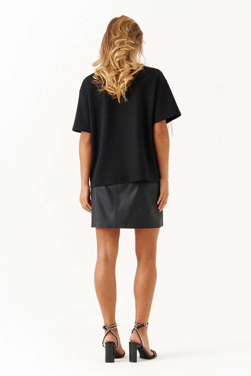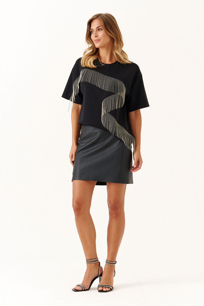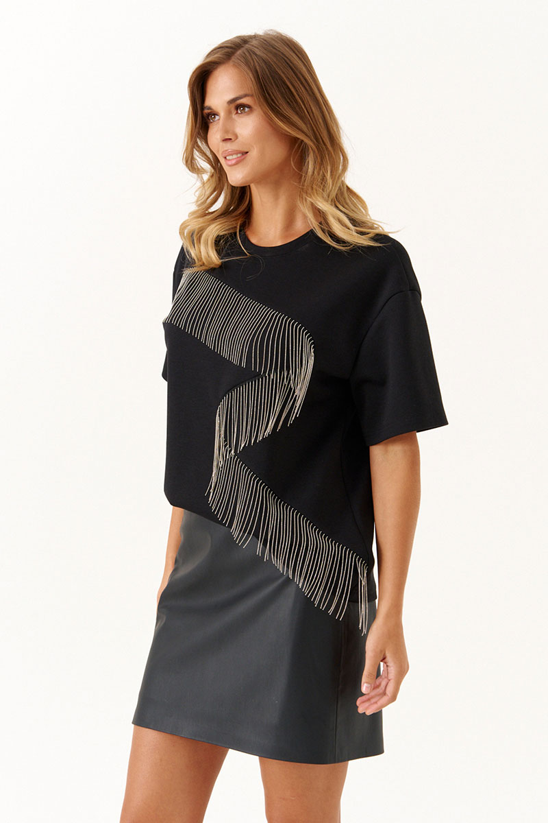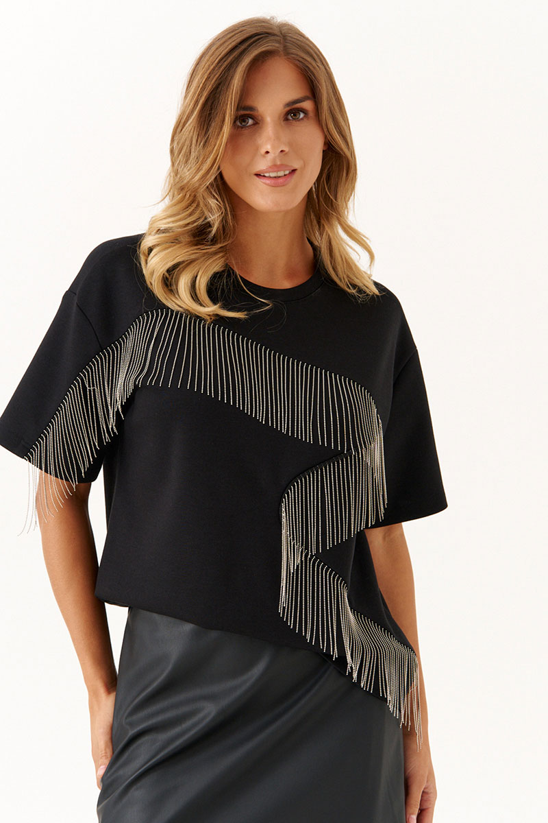 Это женский джемпер, выполненный из мягкого трикотажного полотна, идеально подходящего для повседневной носки. Модель отличается комфортной посадкой и стильным дизайном. Горловина чуть расширенная, что создает приятное ощущение свободы и легкости при ношении. Перед с фигурным швом, в который вставлена тесьма с цепью, которая переходит на рукав. Данный декор добавляет образу расслабленности и современного стиля. Линия плеча немного опущена. Рукава втачные длиной до уровня локтя. Этот джемпер чёрного цвета отлично подойдет для повседневных образов, сочетая уют и стиль.