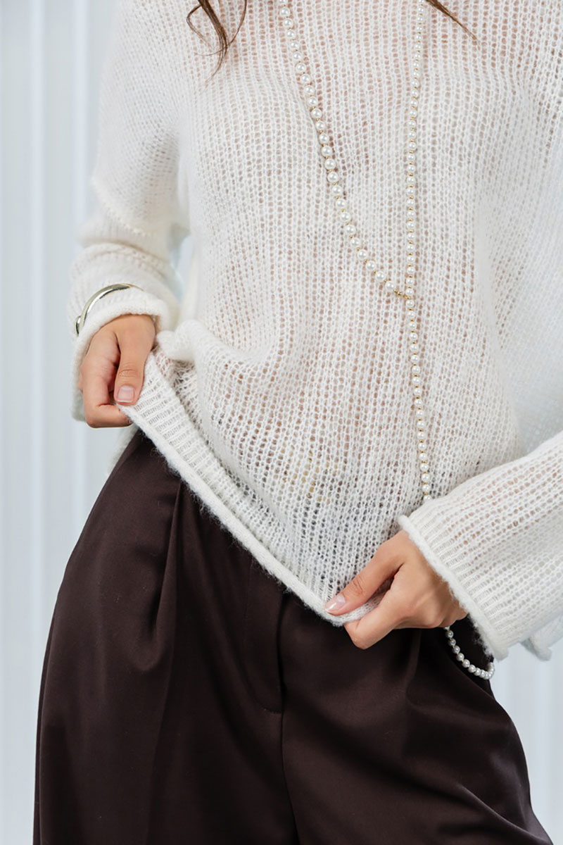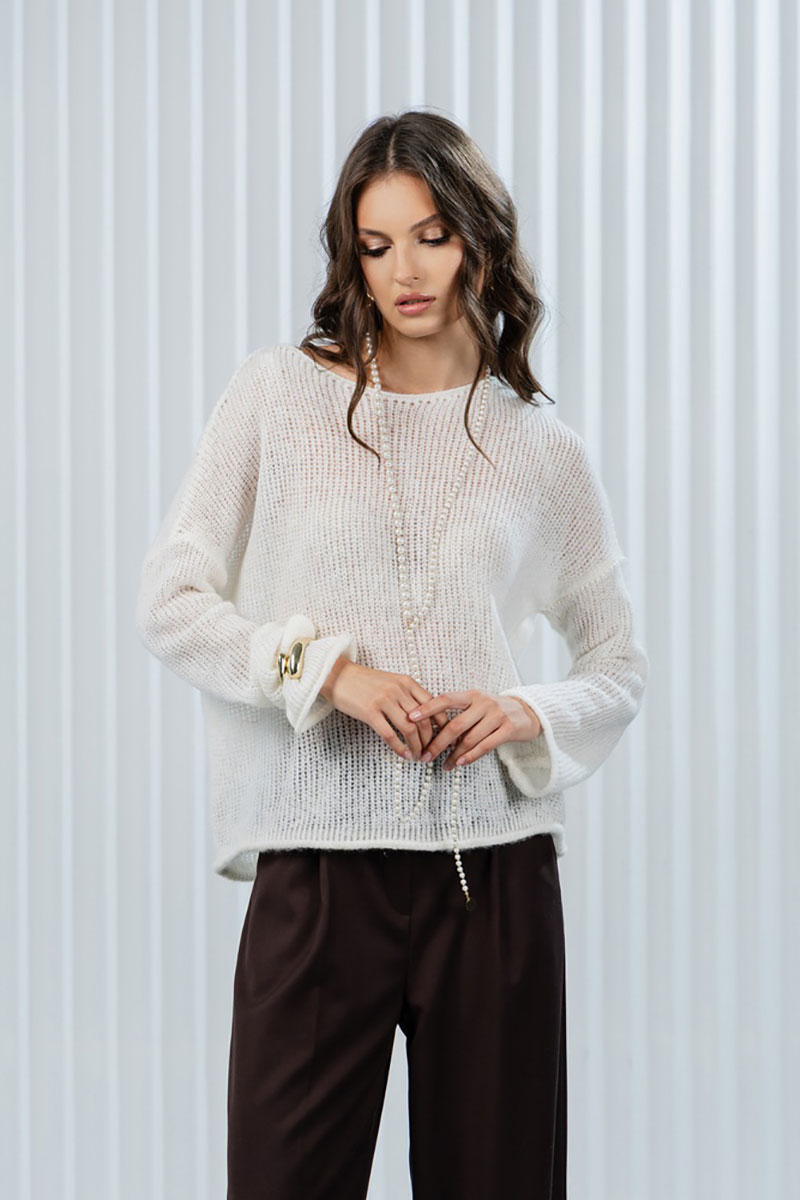 Ажурный вязаный узор — добавляет изысканности и лёгкости, делая джемпер универсальным для разных стилей.