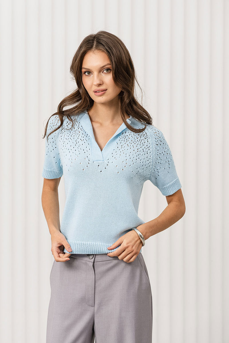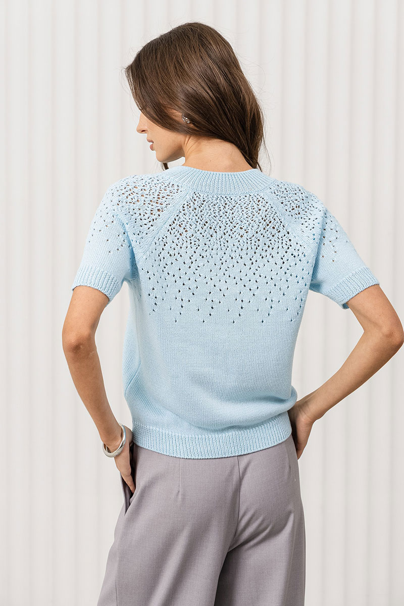 Джемпер прямого силуэта связан из пряжи, в состав которой входит 50% хлопка, 50% ПАН. Джемпер очень мягкий и приятный к телу, вывязан переплетением кулирная гладь, переходящая к плечевому поясу в ажур. Рукав реглан, длиной до локтя. Круглая горловина и разрез по переду обработаны накеттлеванной бейкой. Низ изделия, низ рукава и бейка горловины связаны переплетением ластик 1*1.