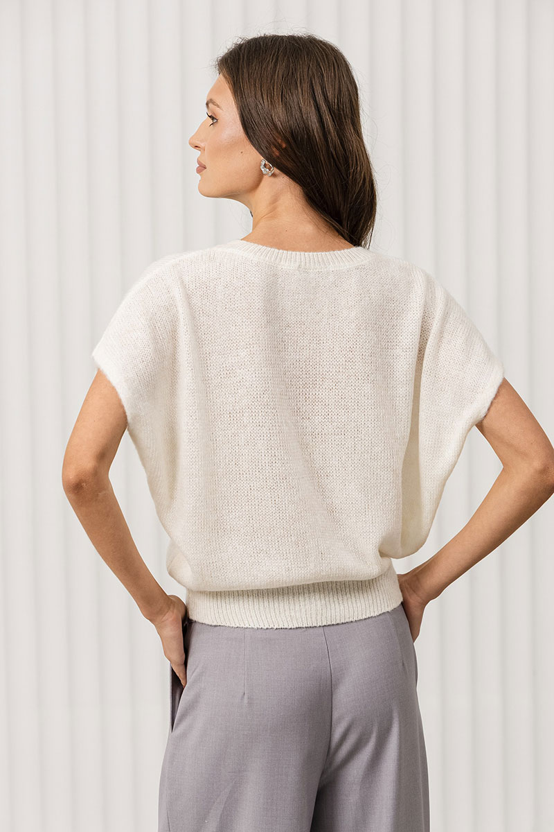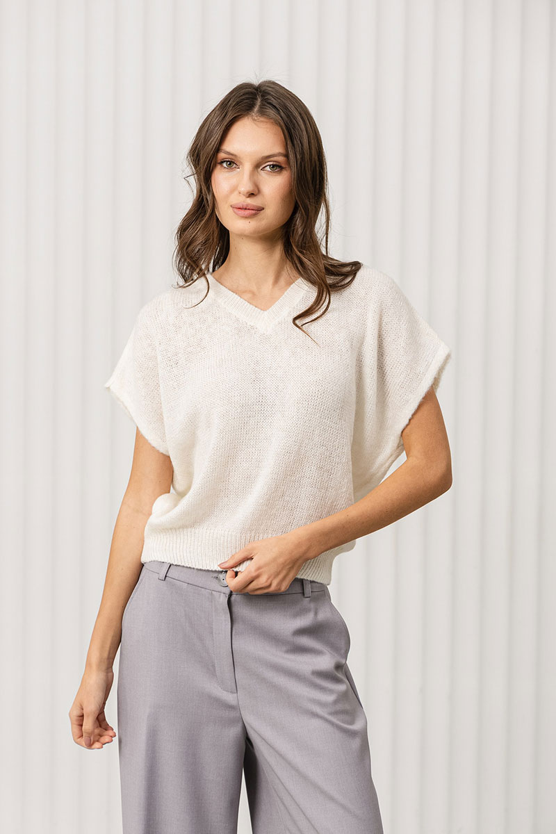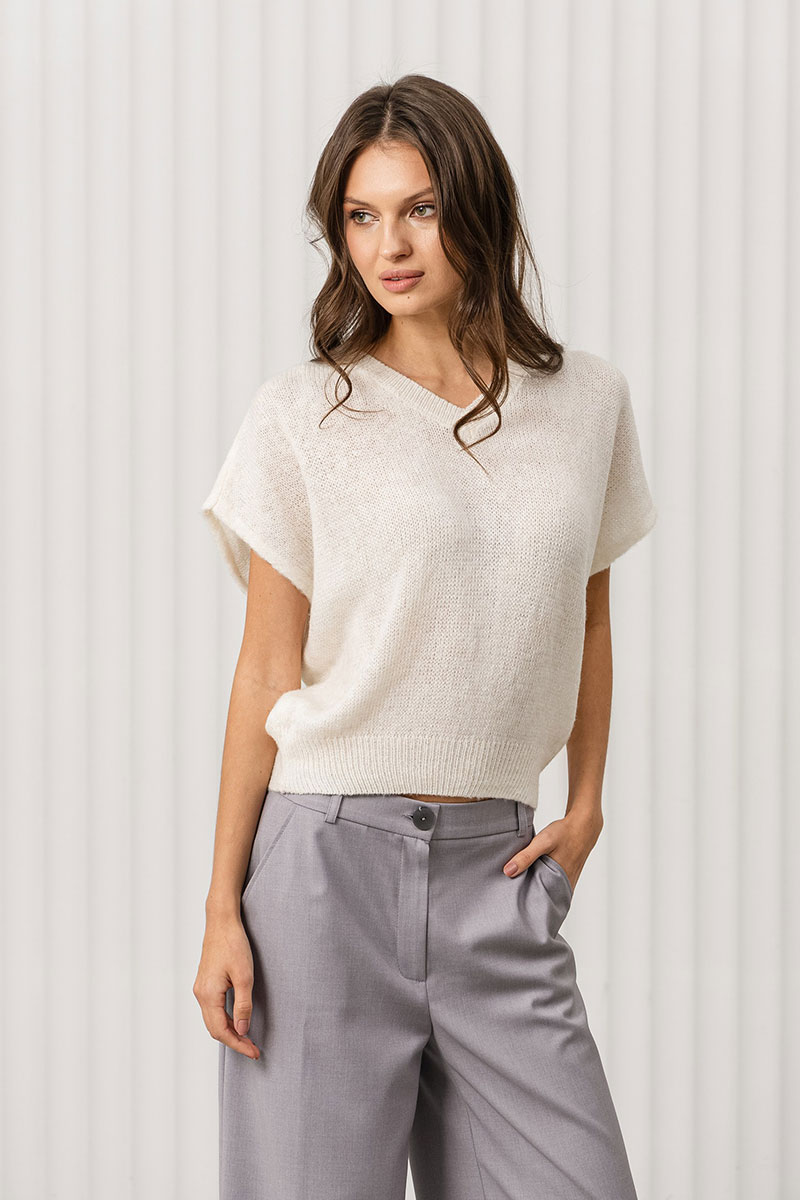 Джемпер прямого силуэта с цельновывязанным рукавом немного выше уровня локтя. Джемпер очень мягкий и приятный к телу, вывязан переплетением кулирная гладь.Низ изделия связан переплетением ластик 1*1. Вырез горловины V-образный обработан накеттлеванной бейкой.