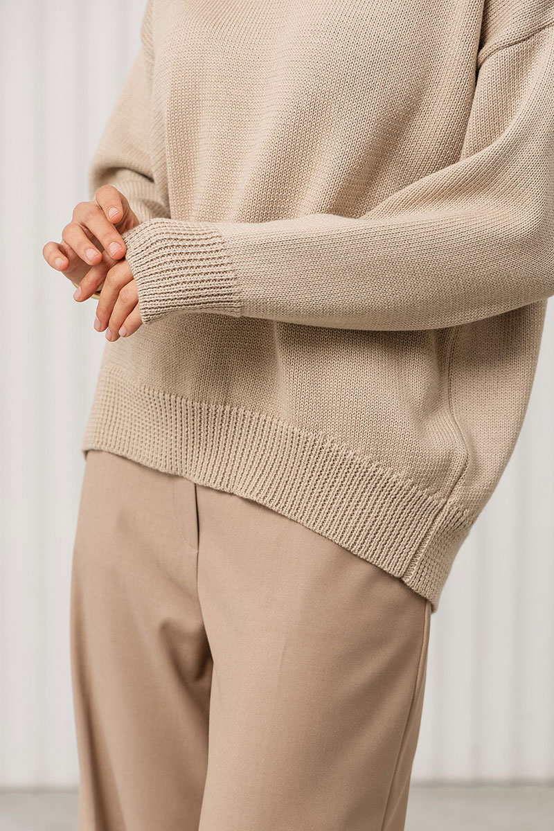 Джемпер отлично сочетается с брюками классического кроя, как на фото, джинсами или юбками. Для завершения образа подойдут туфли на каблуке, лодочки или стильные ботинки. Дополните образ минималистичными аксессуарами, такими как тонкий браслет или серьги.