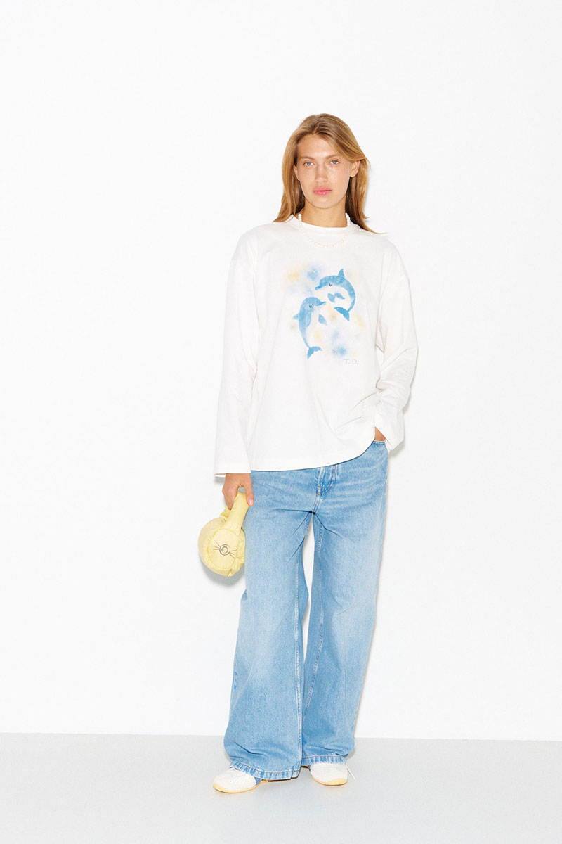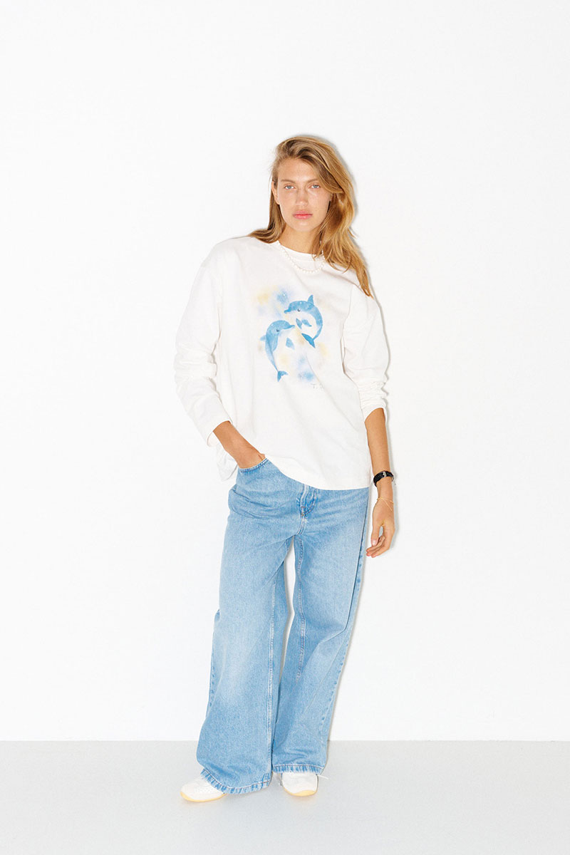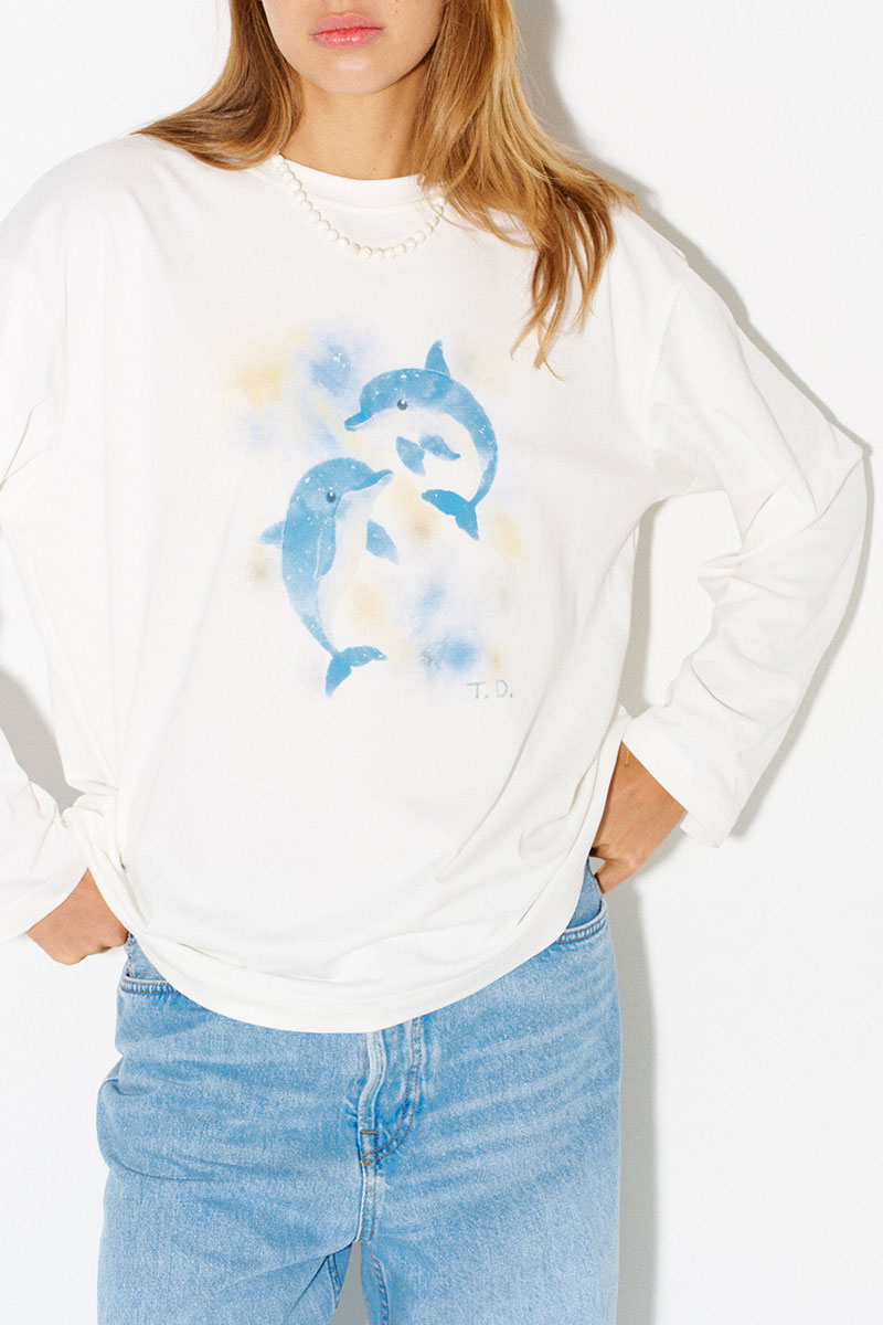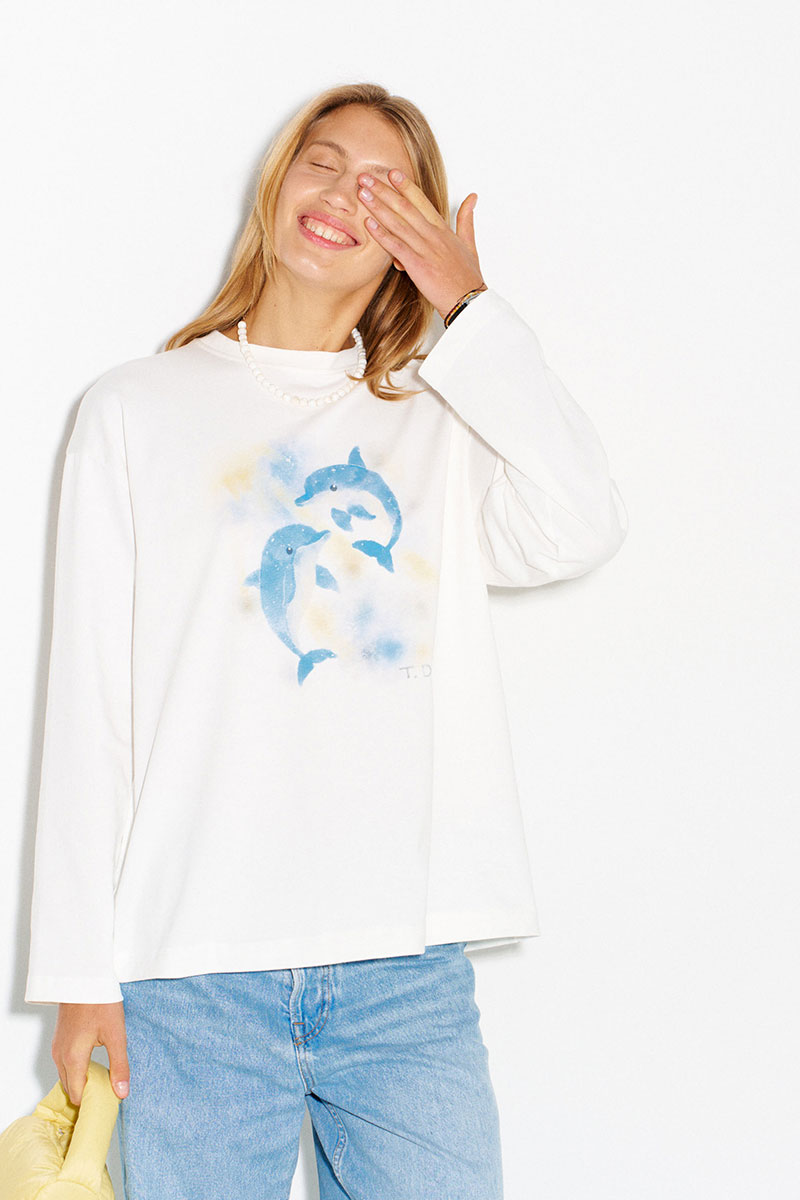 Хлопковый лонгслив с принтом в молочном цвете.