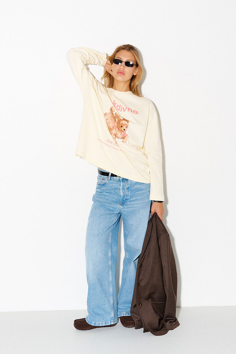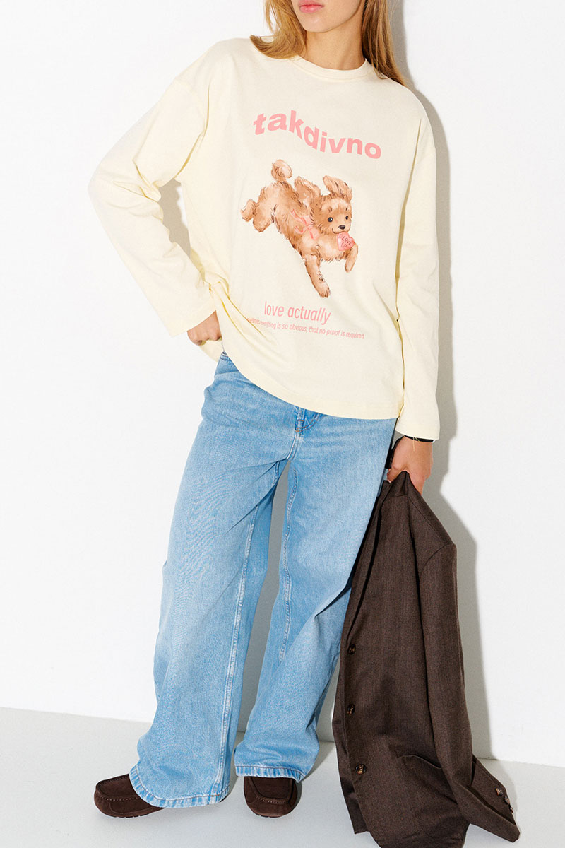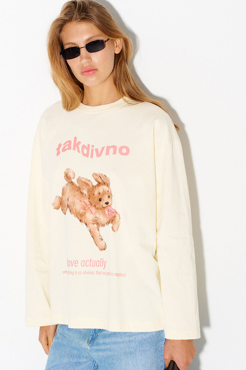 Хлопковый лонгслив в сливочном цвете с принтом счастливого щенка и надписью на английском: «Love actually. Sometimes everything is so obvious, that no proof is required» («Реальная любовь. Иногда всё настолько очевидно, что не требует доказательств»).