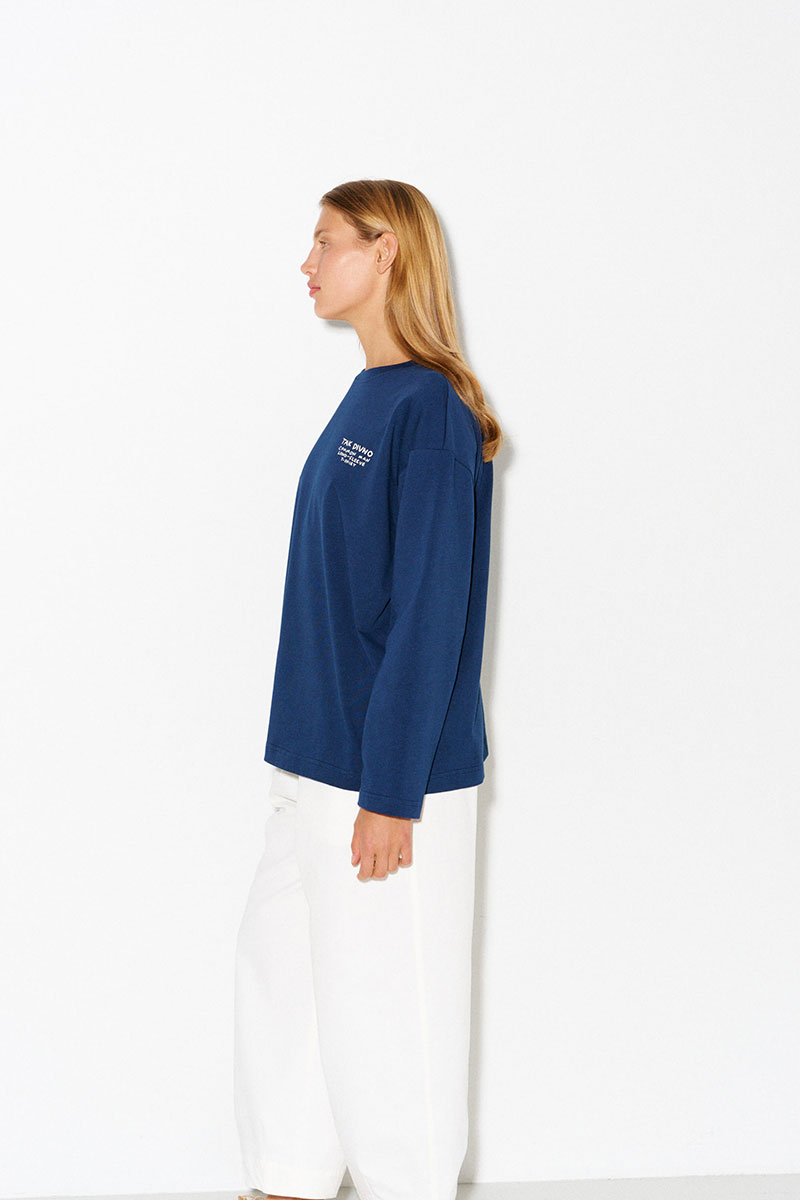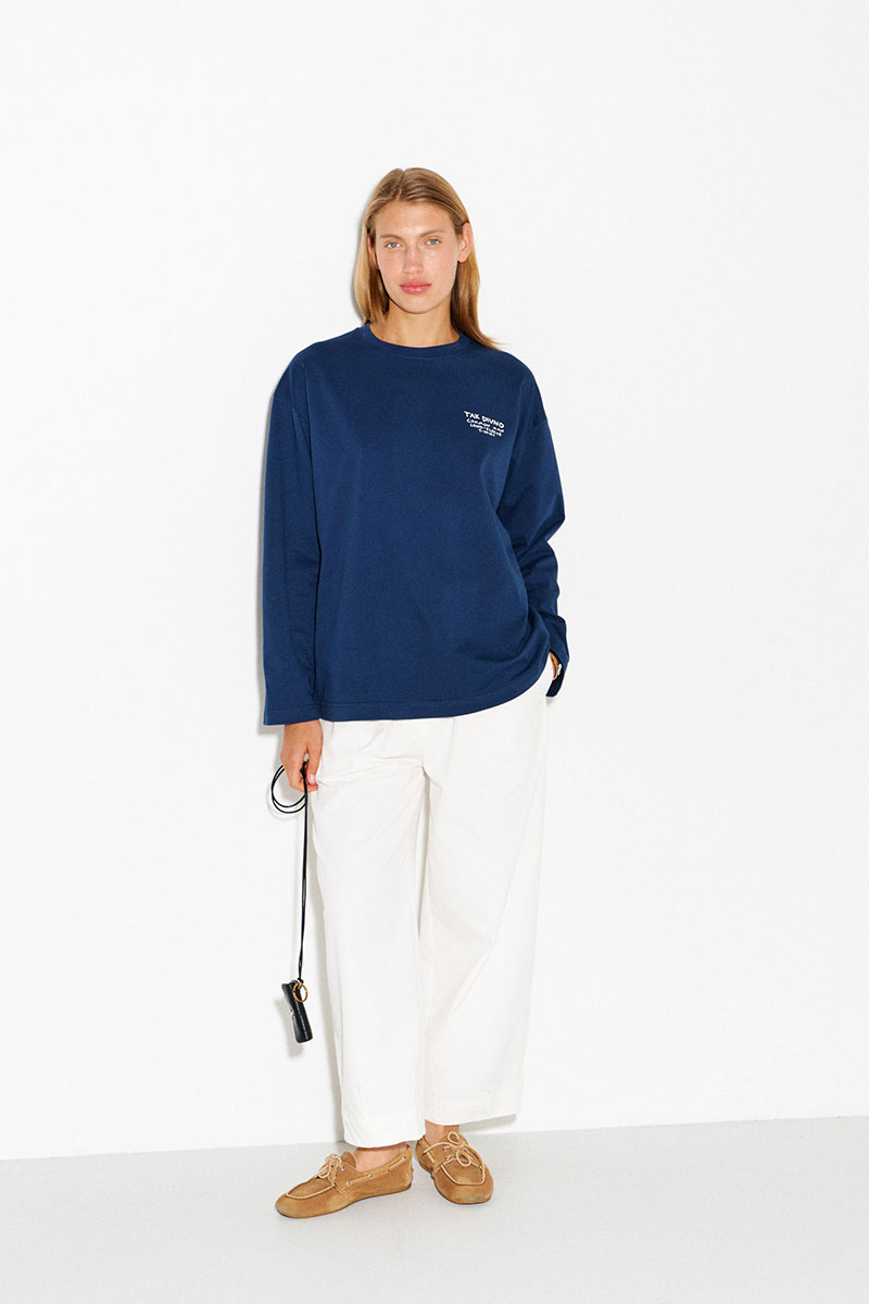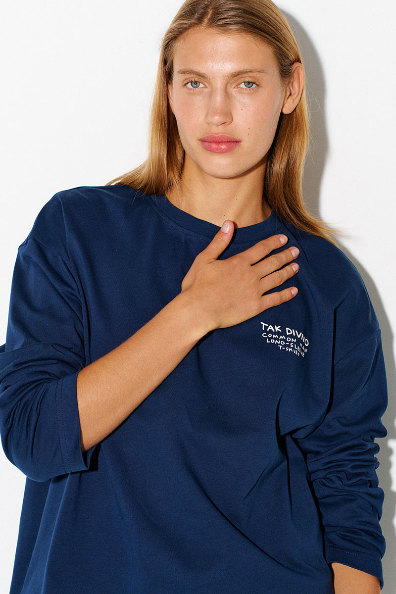 Базовый лонгслив из 100% хлопка в синем цвете с надписью «Сommon man long-sleeve t-shirt» («Лонгслив простого человека»).