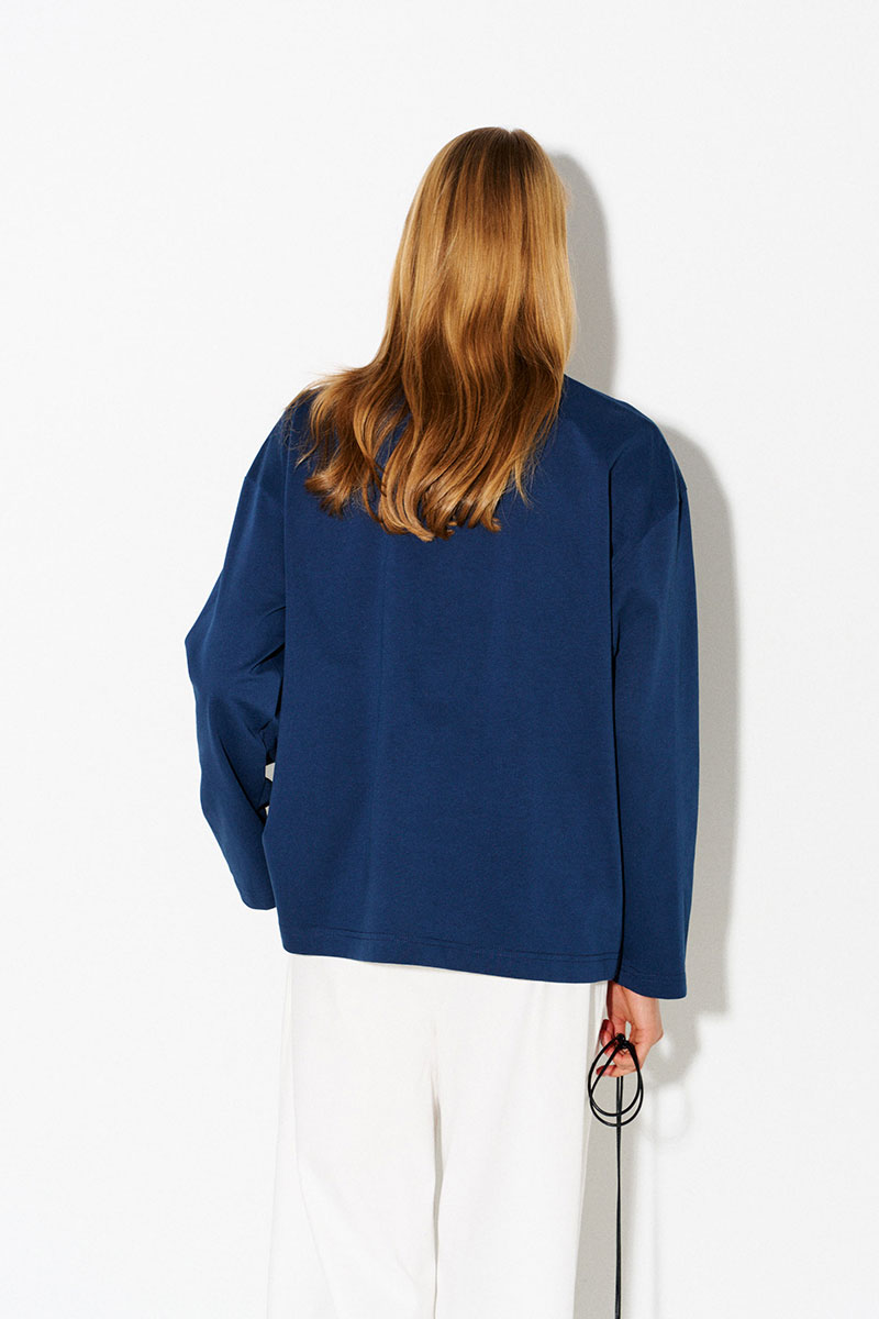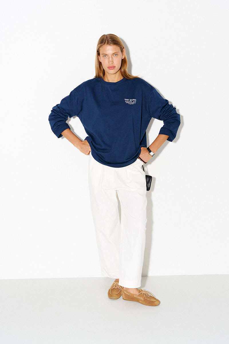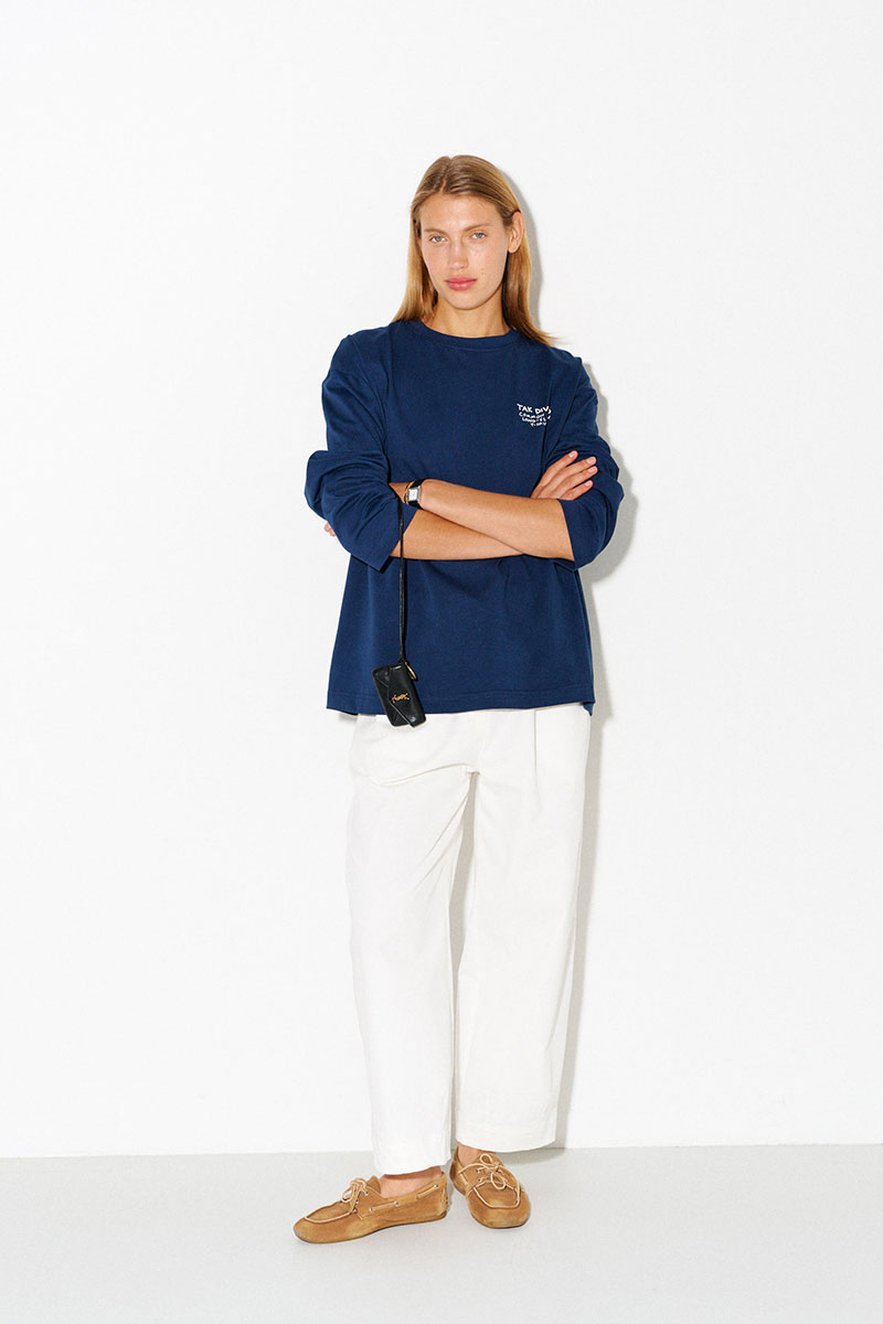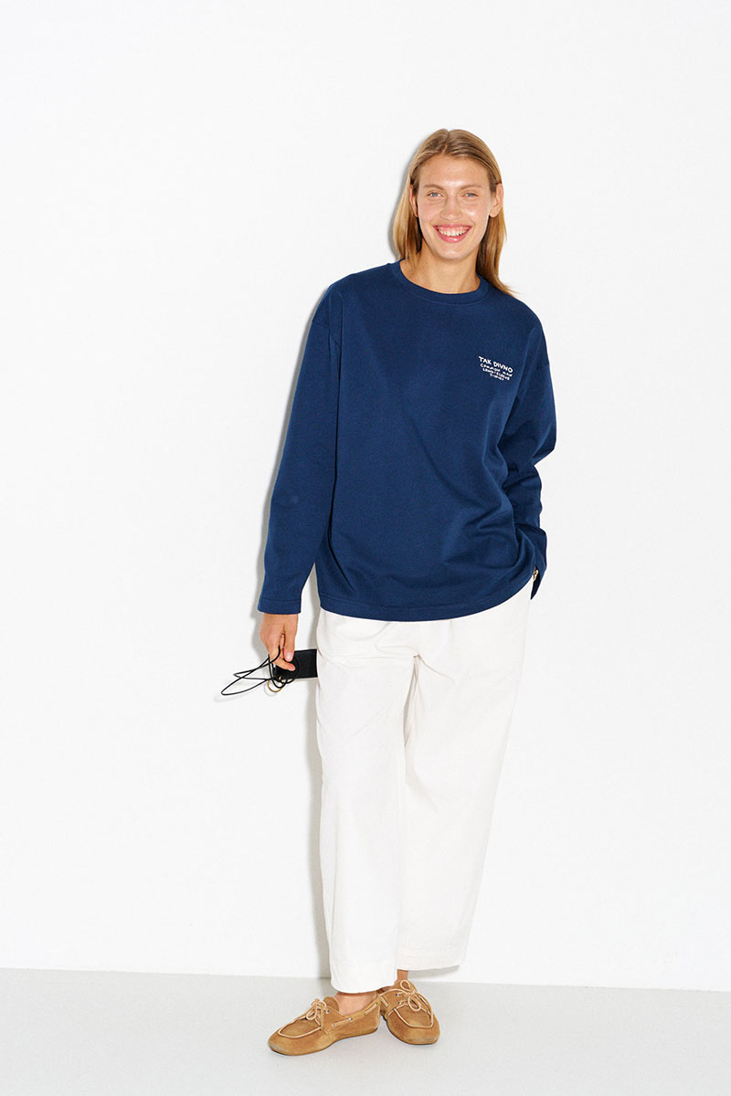 Базовый лонгслив из 100% хлопка в синем цвете с надписью «Сommon man long-sleeve t-shirt» («Лонгслив простого человека»).