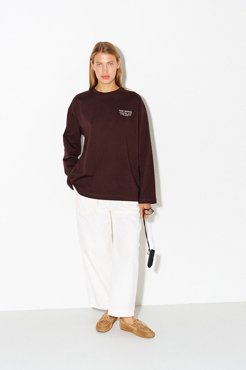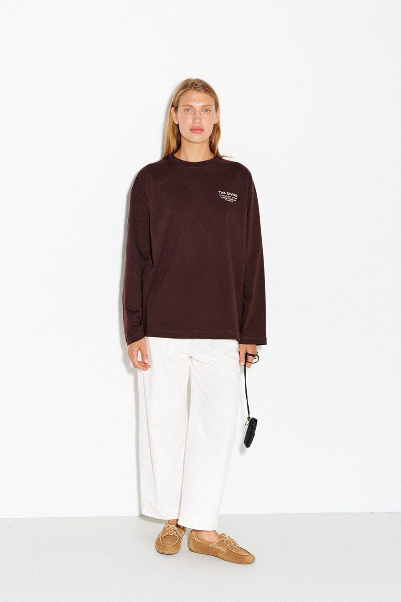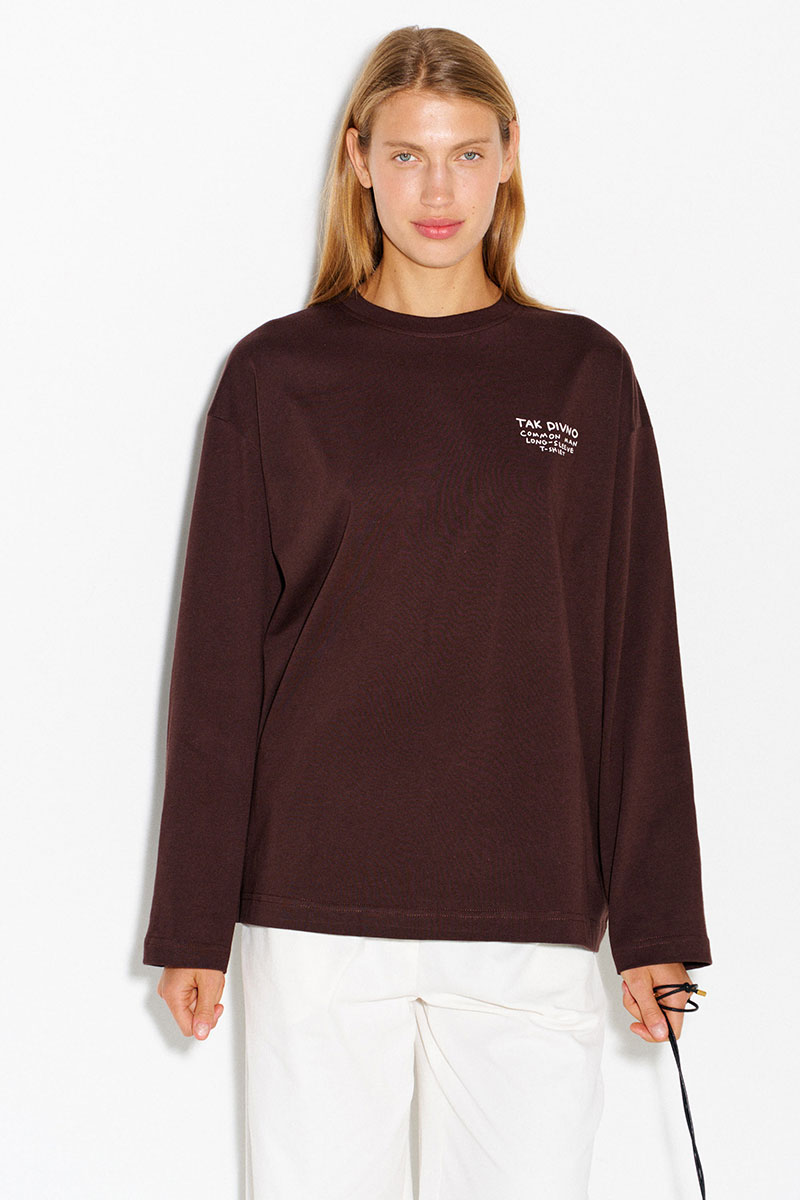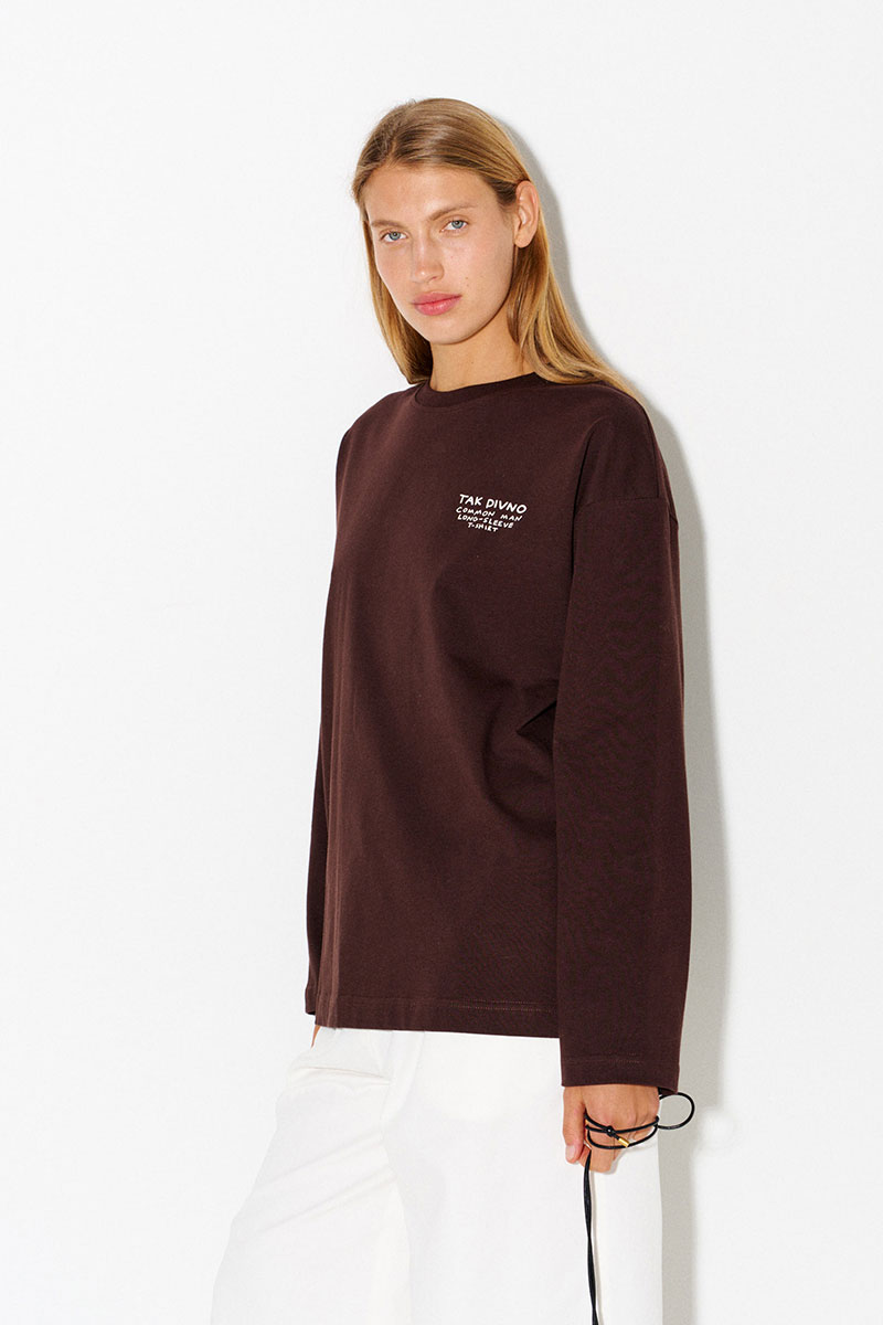 Базовый лонгслив из 100% хлопка в шоколадном цвете с надписью «Сommon man long-sleeve t-shirt» («Лонгслив простого человека»).
