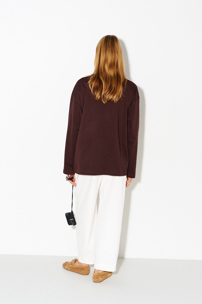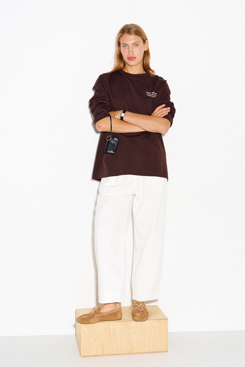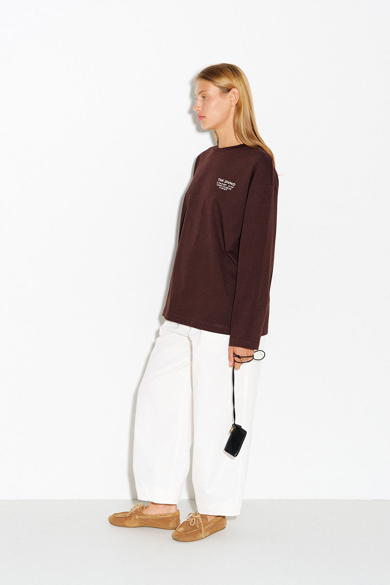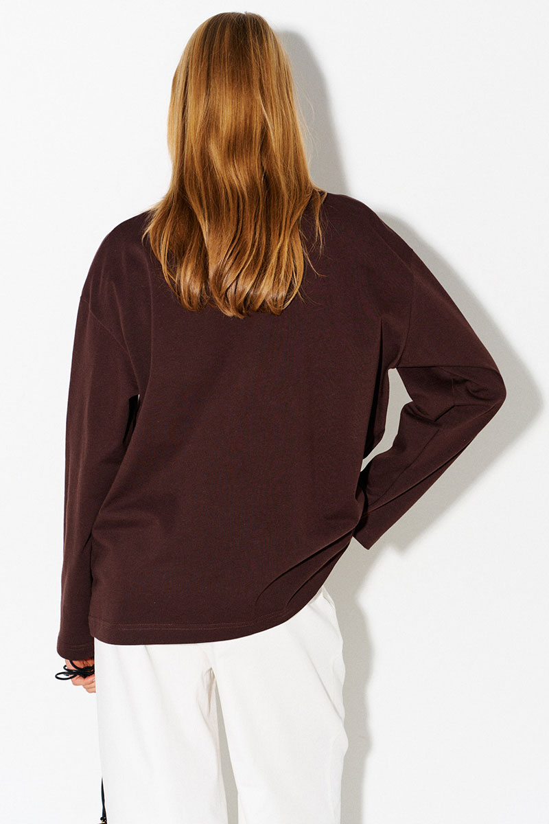 Базовый лонгслив из 100% хлопка в шоколадном цвете с надписью «Сommon man long-sleeve t-shirt» («Лонгслив простого человека»).