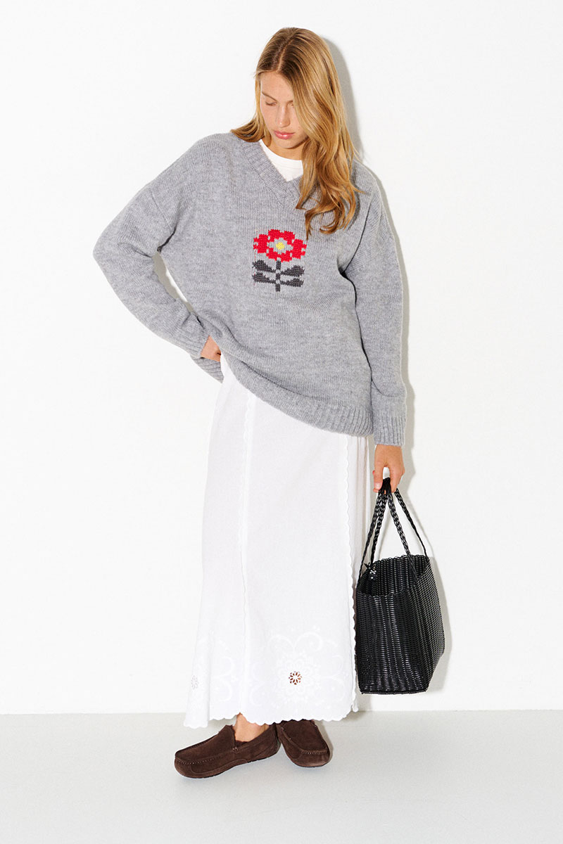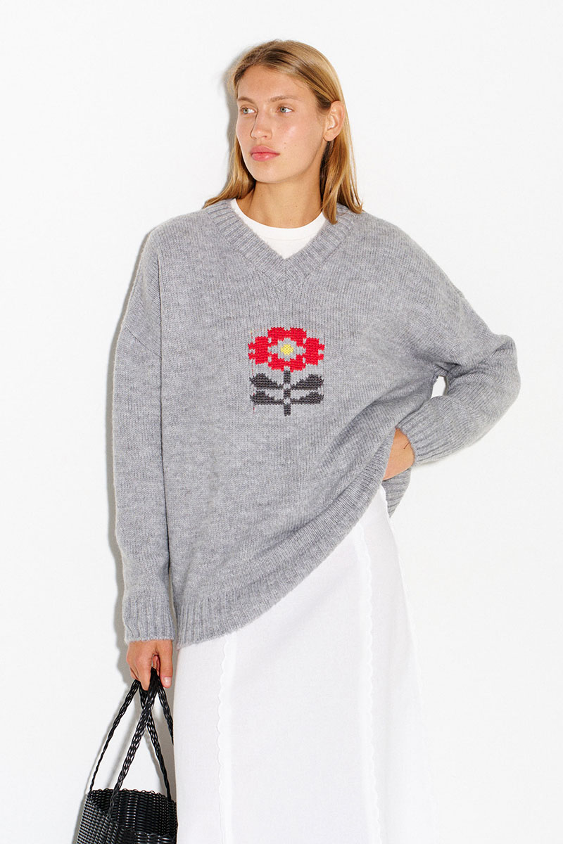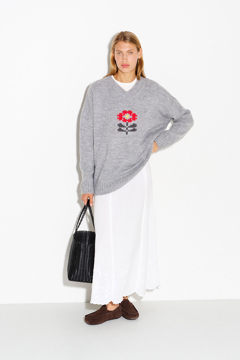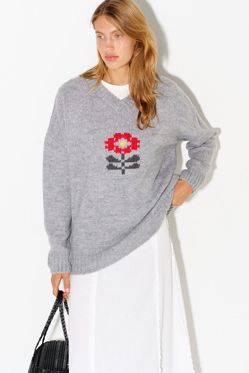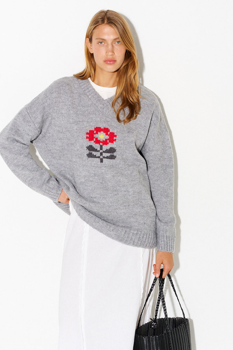 Модель свободного кроя, со спущенной линией плеча и удлиненным рукавом. V-образный вырез горловины визуально удлиняет шею и делает силуэт стройнее. По центру джемпера расположена ромашка.