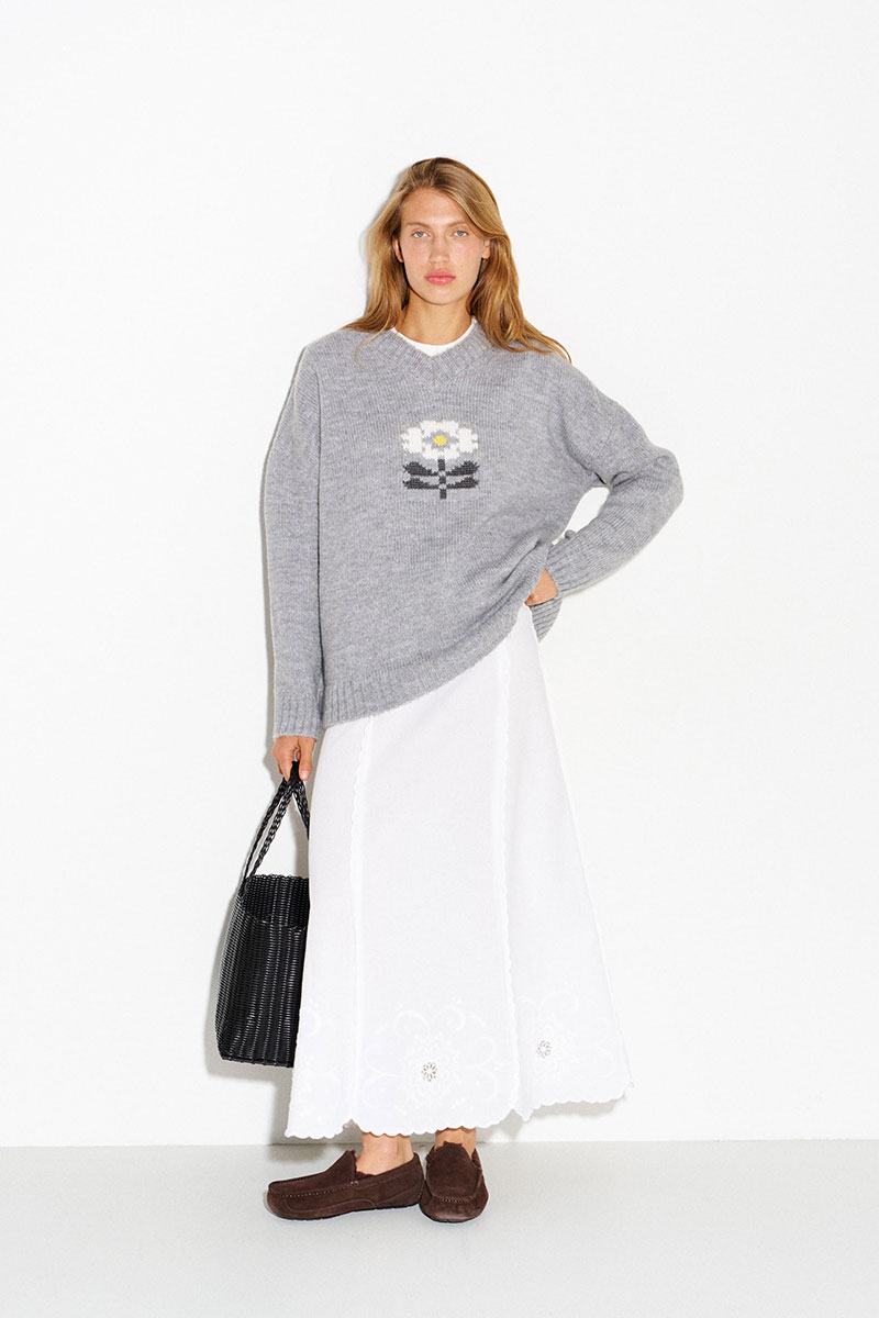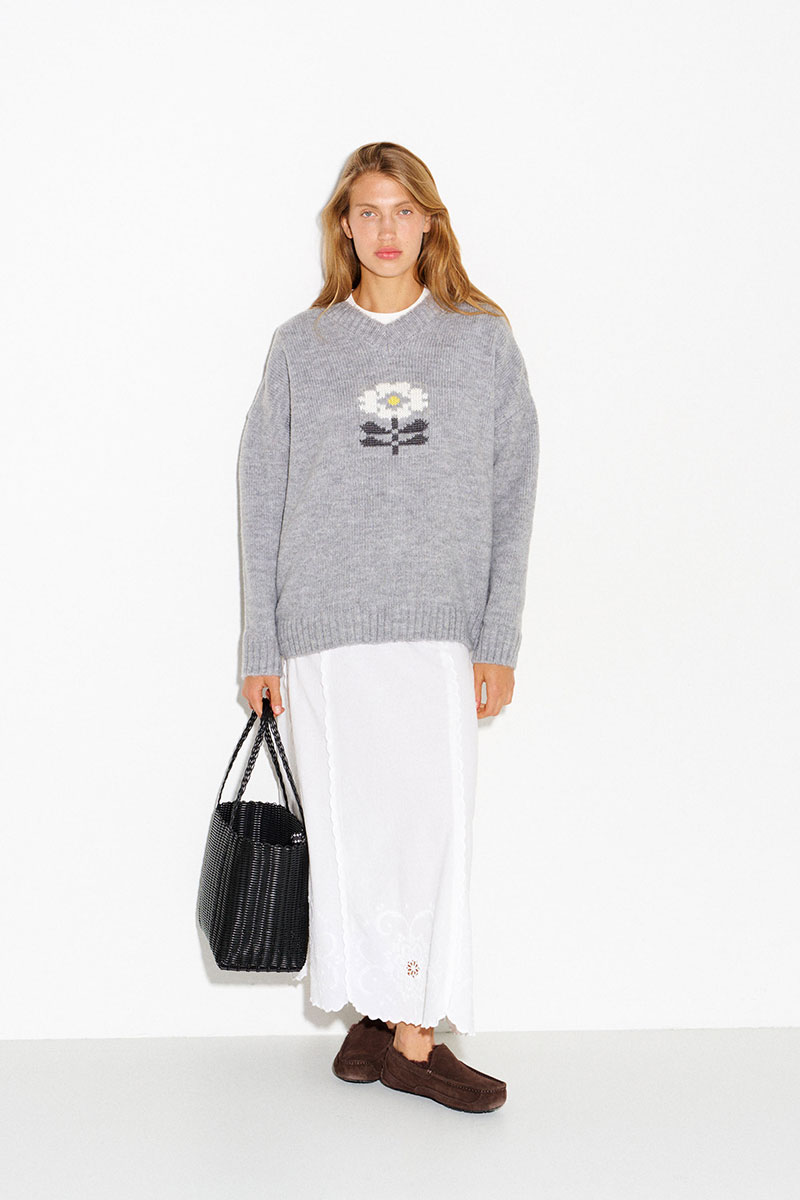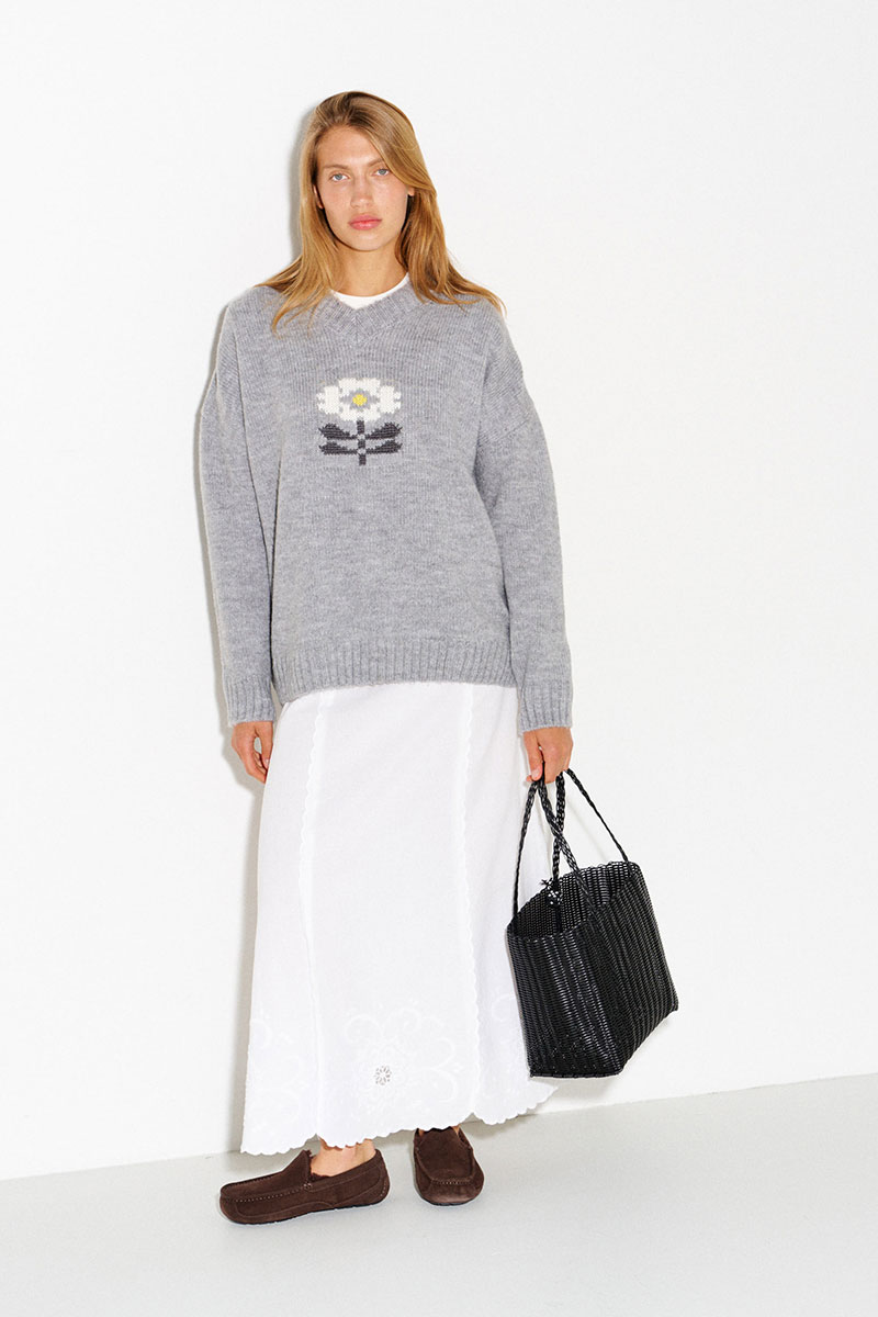 Модель свободного кроя, со спущенной линией плеча и удлиненным рукавом. V-образный вырез горловины визуально удлиняет шею и делает силуэт стройнее. По центру джемпера расположена ромашка.
