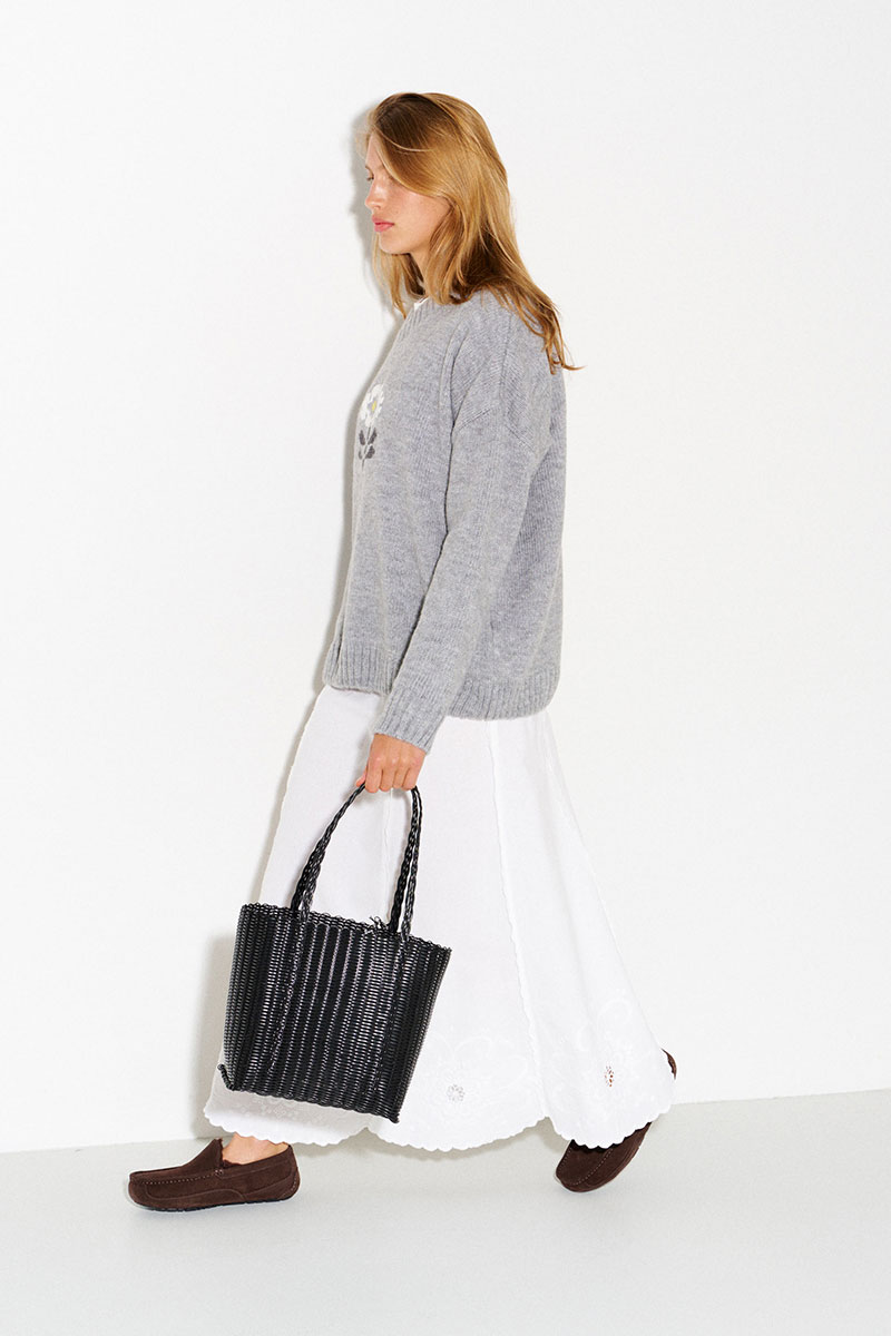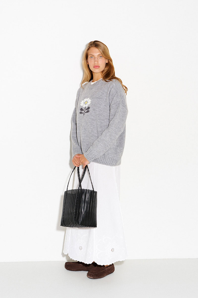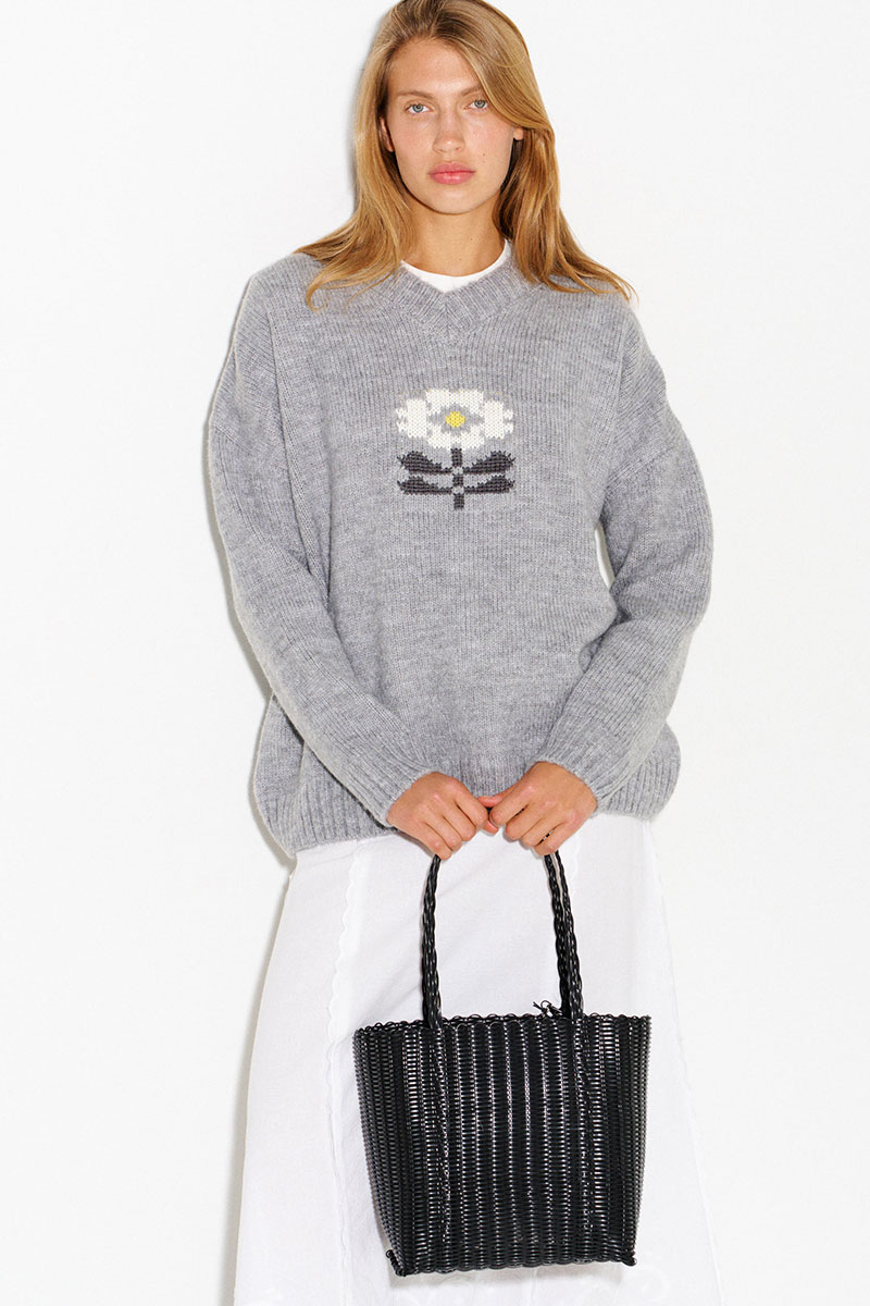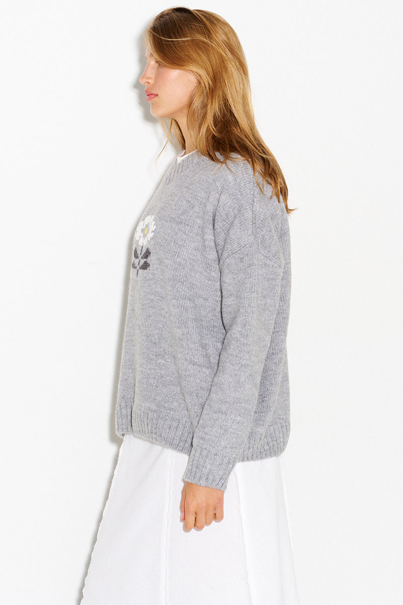 Модель свободного кроя, со спущенной линией плеча и удлиненным рукавом. V-образный вырез горловины визуально удлиняет шею и делает силуэт стройнее. По центру джемпера расположена ромашка.