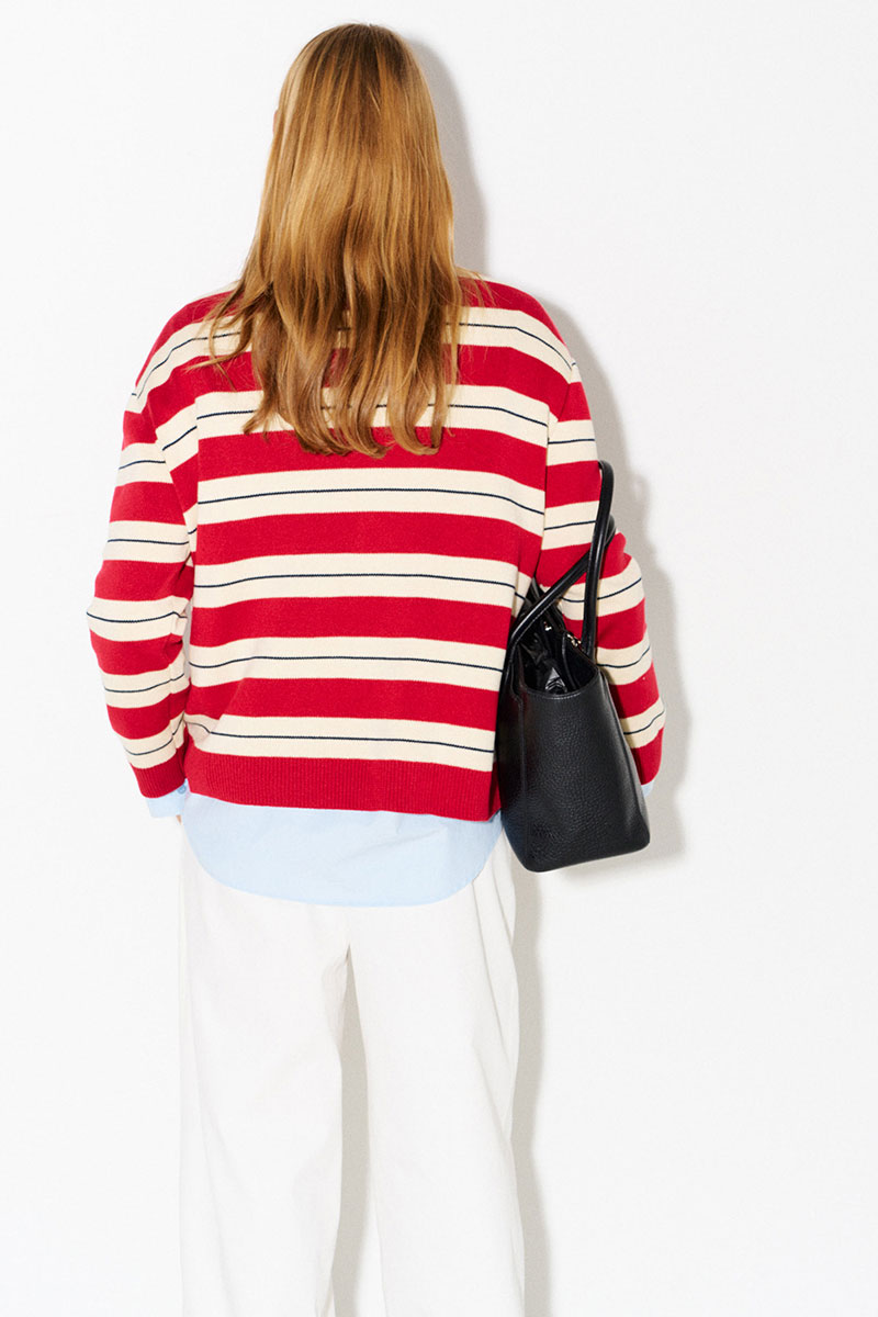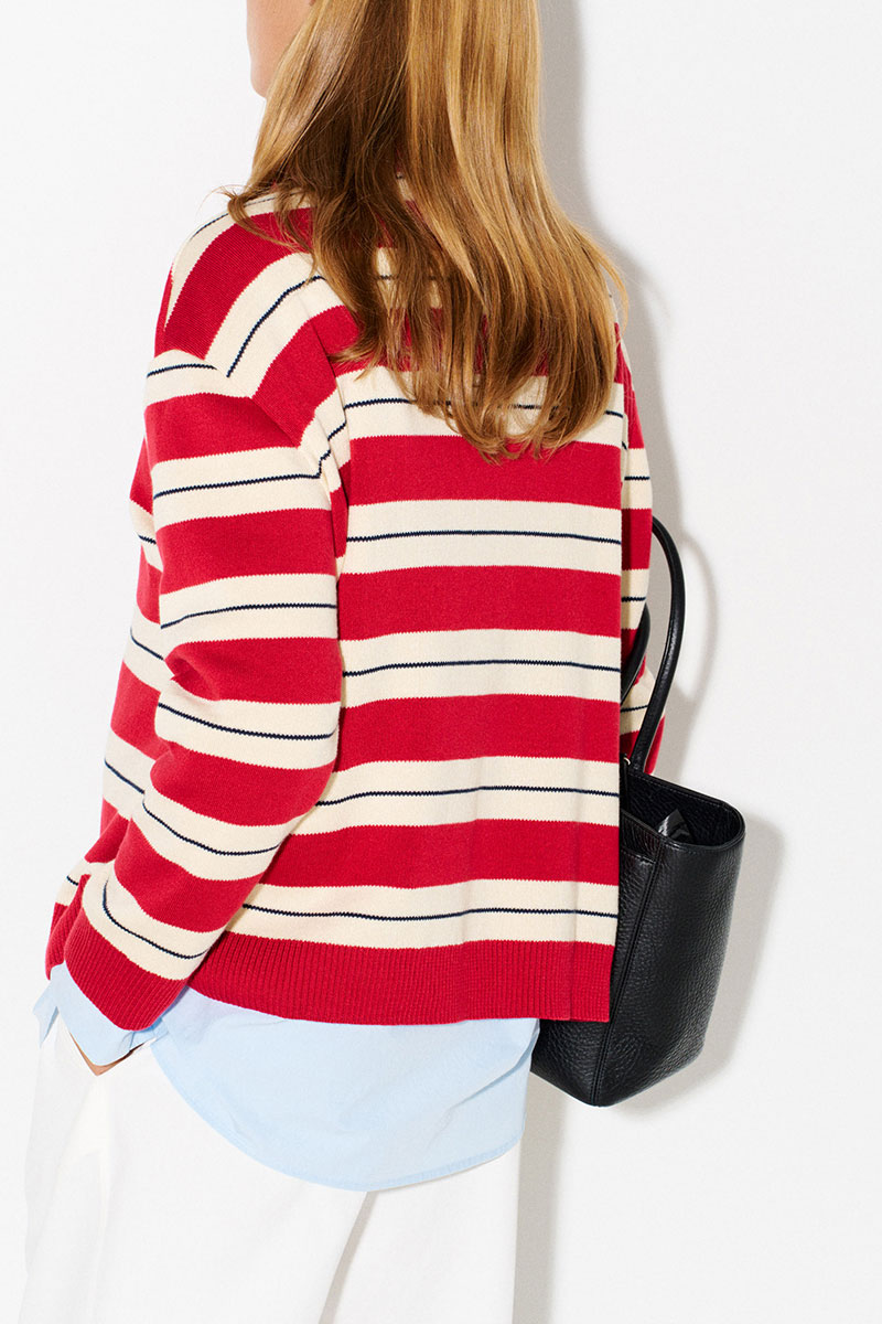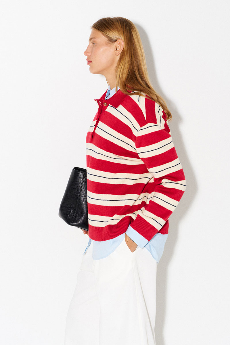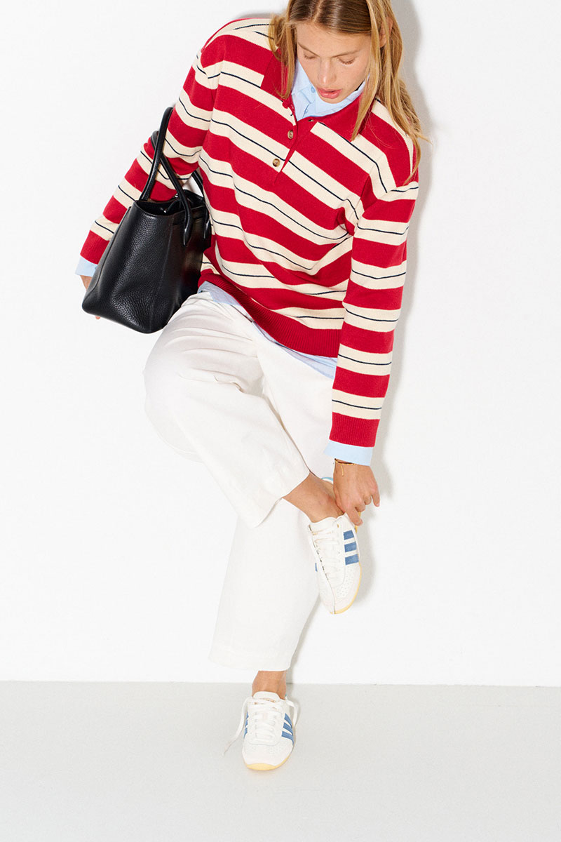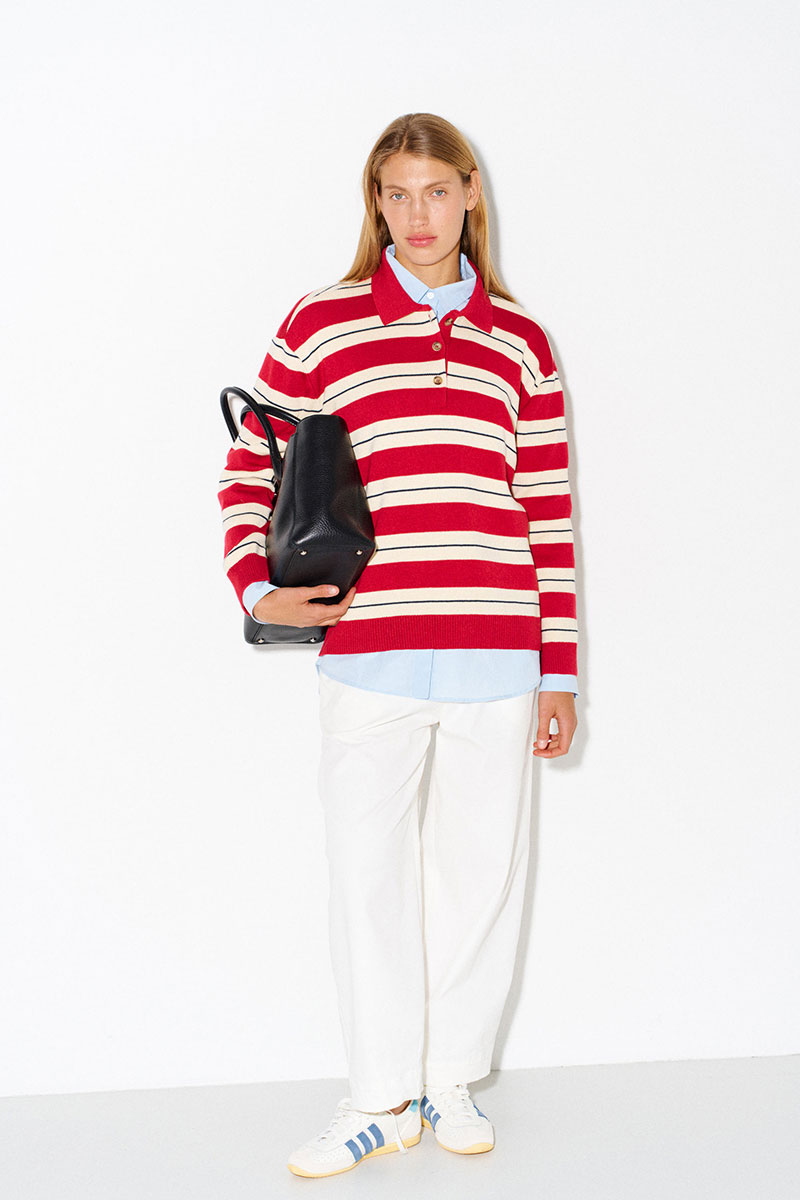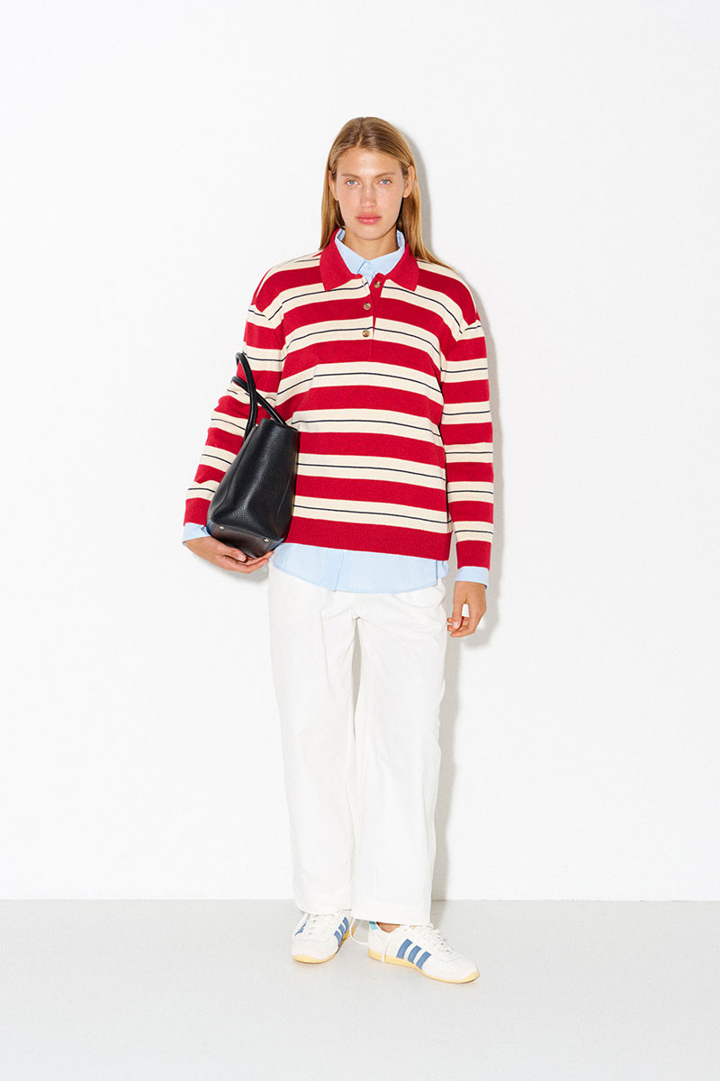 Поло в полоску – тот самый джемпер, который идеально впишется в повседневный гардероб. Легко комбинируется с рубашкой или футболкой в многослойных образах.