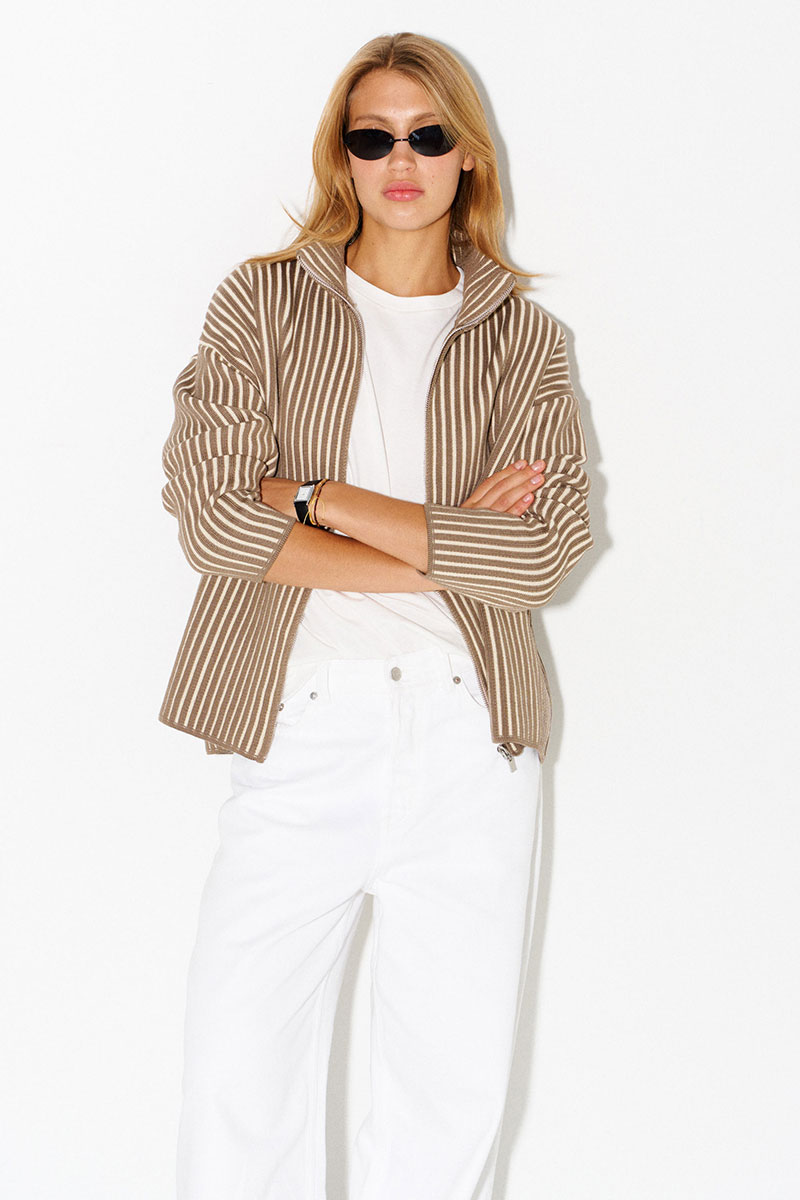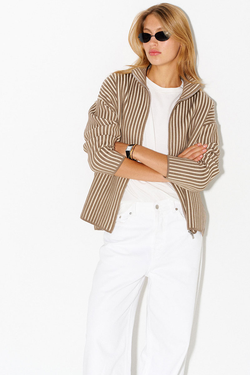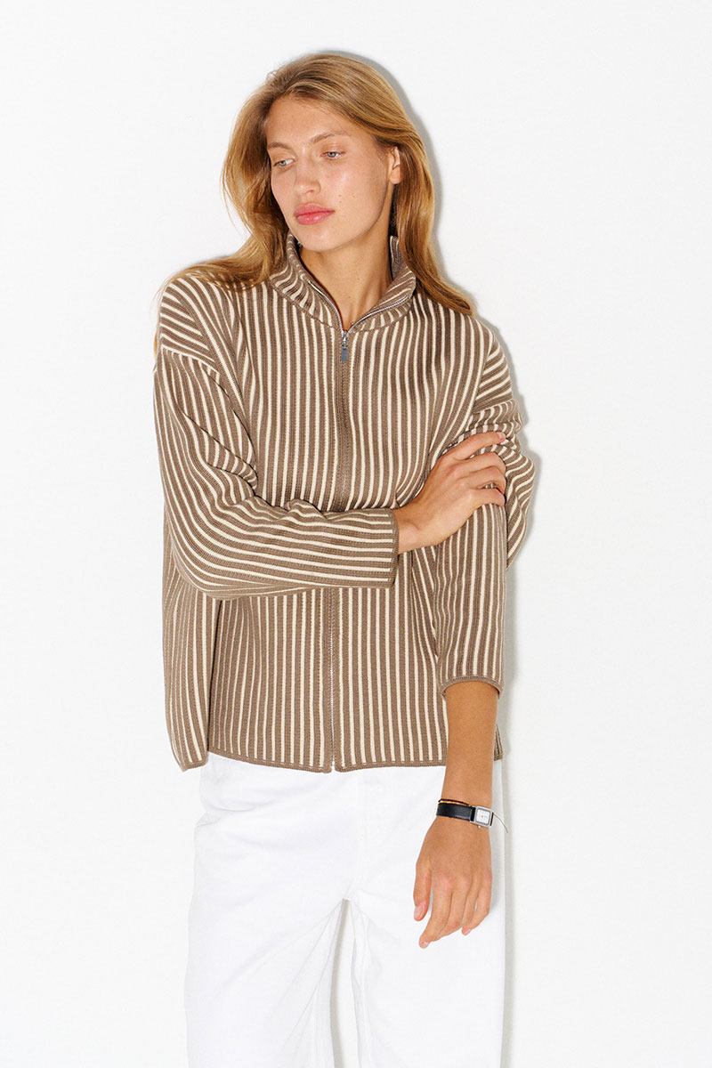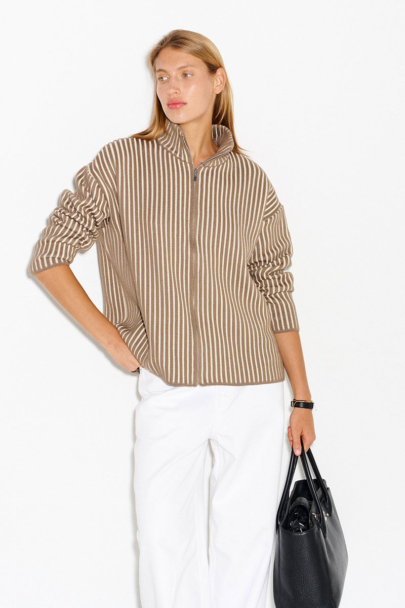 Джемпер на молнии в вертикальную полоску. Изготовлен из плотного, но мягкого материала с рельефной текстурой.