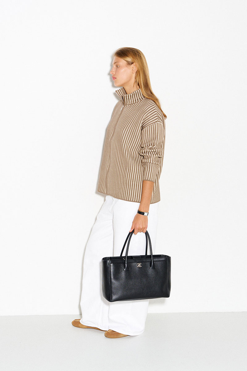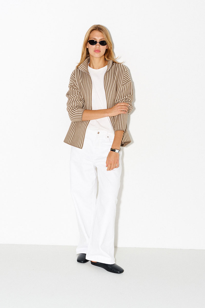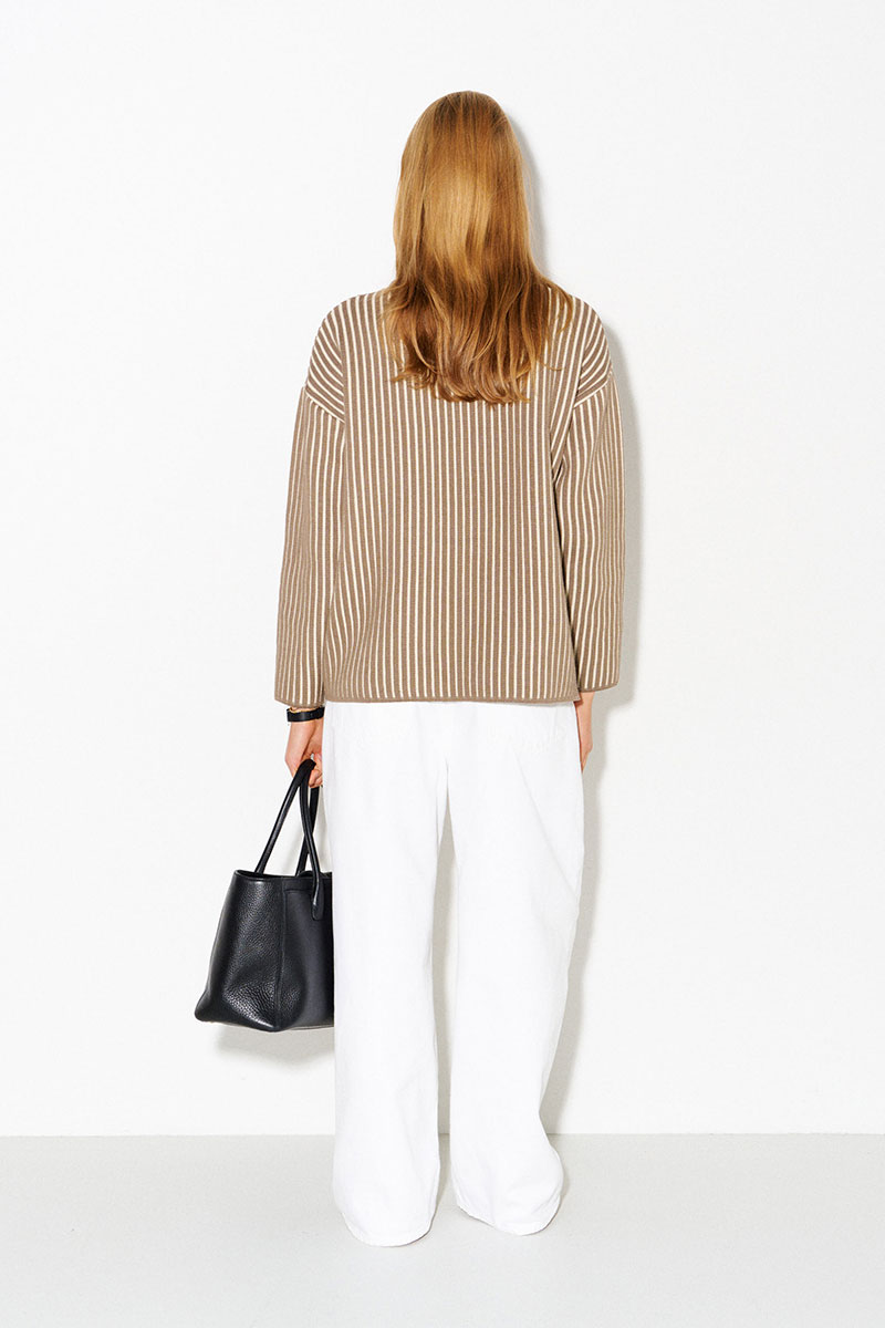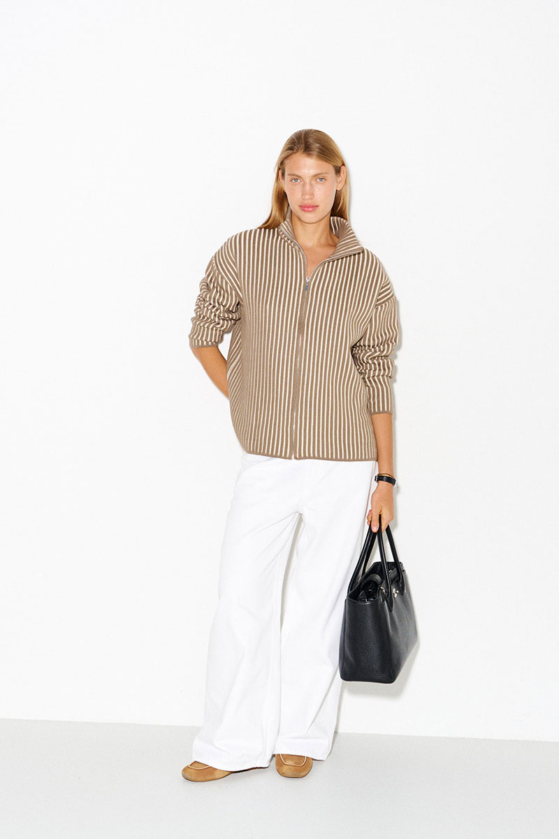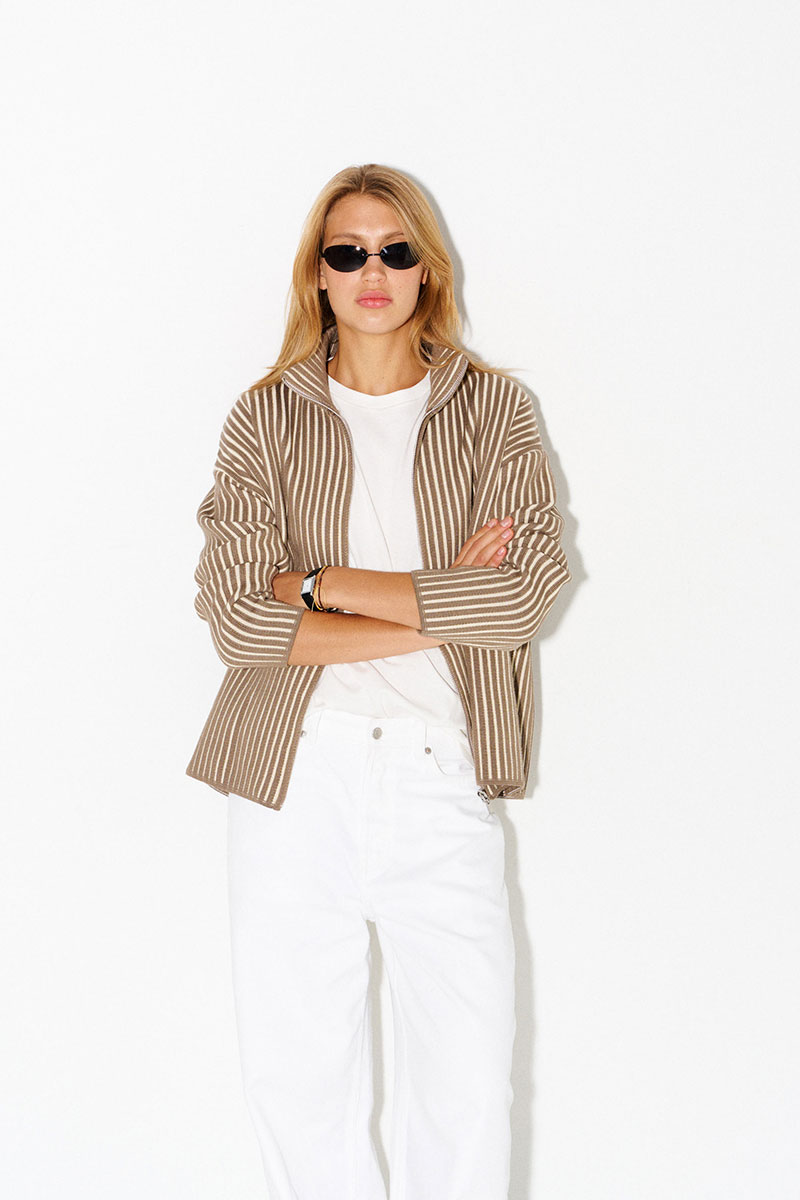 Джемпер на молнии в вертикальную полоску. Изготовлен из плотного, но мягкого материала с рельефной текстурой.