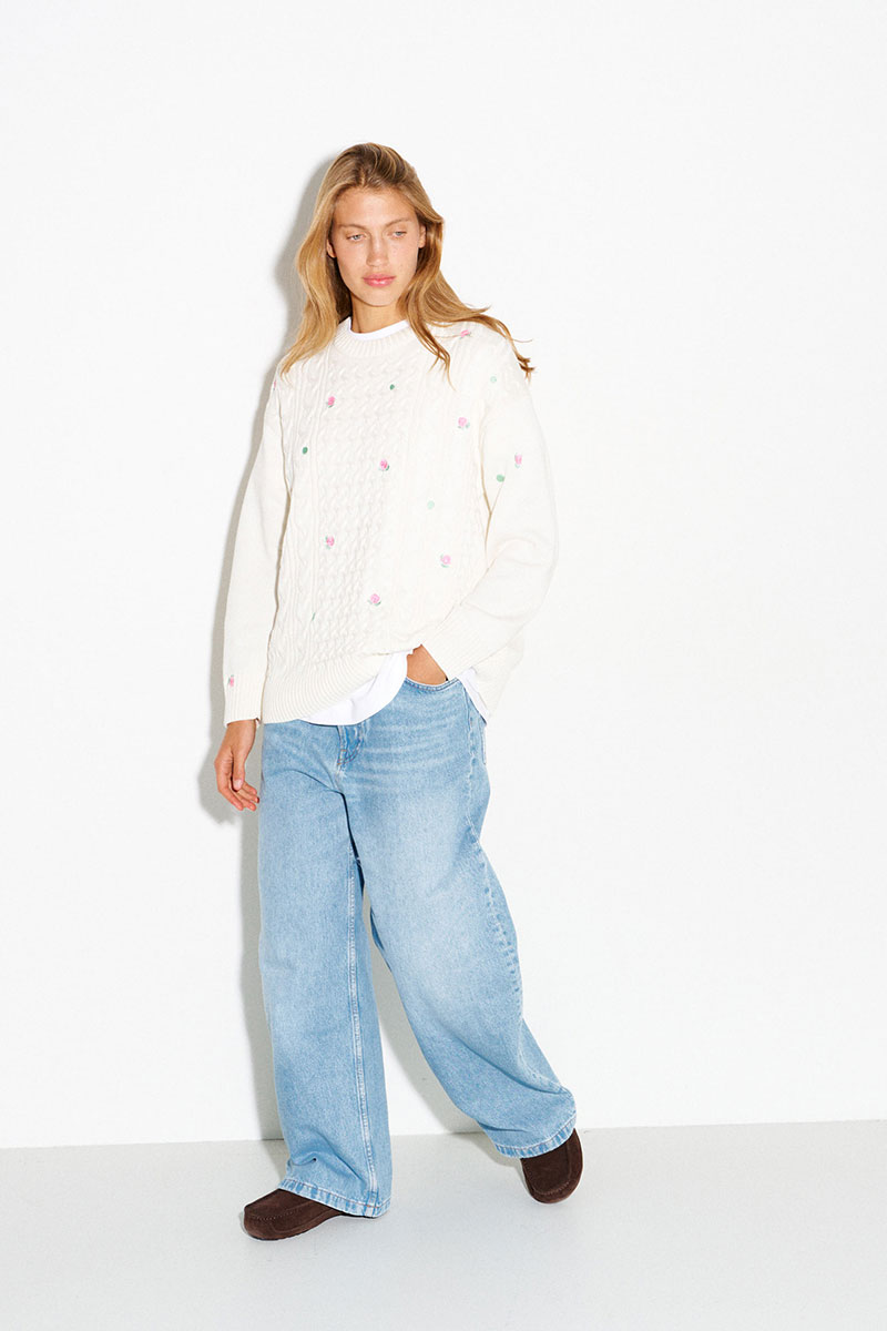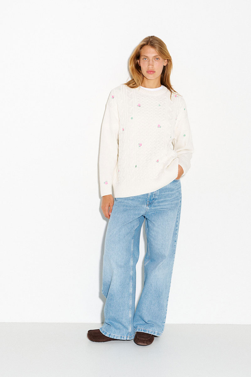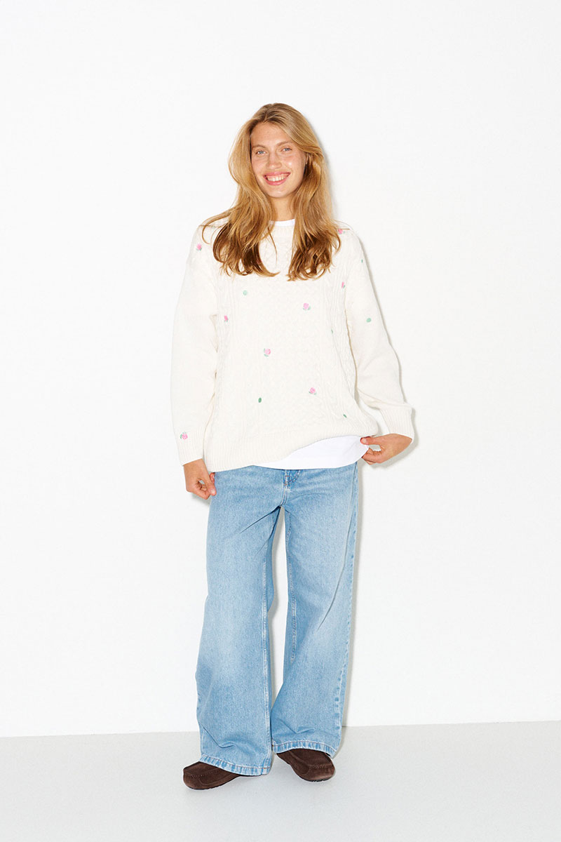 Молочный джемпер с косами и вышитыми розами. Цветы на джемпере выполнены гладью.