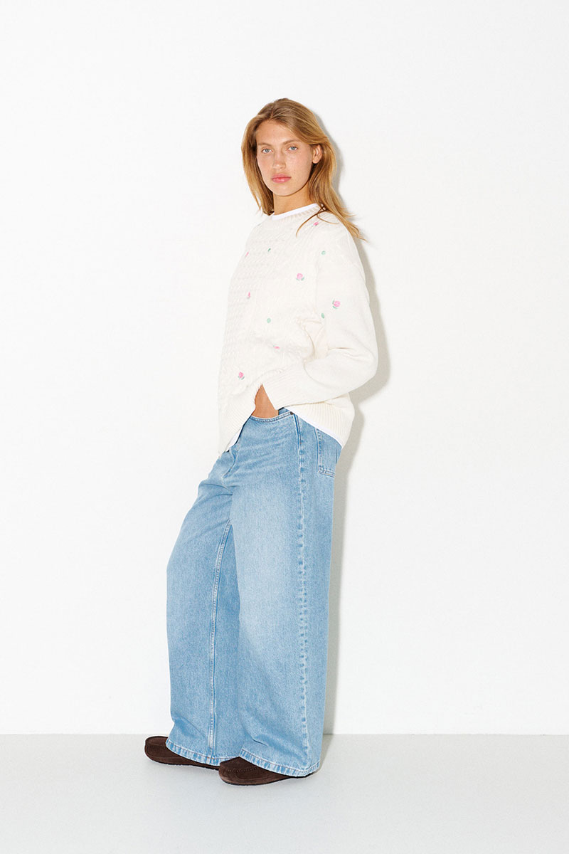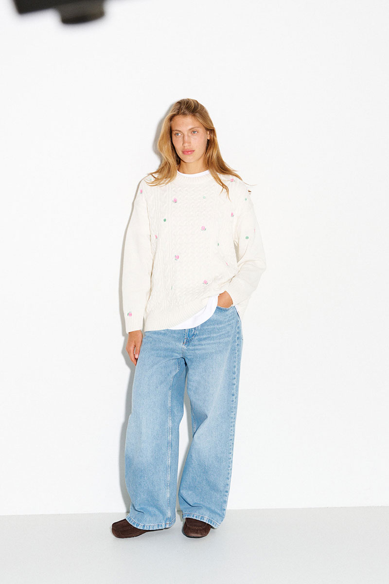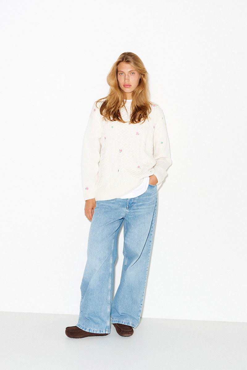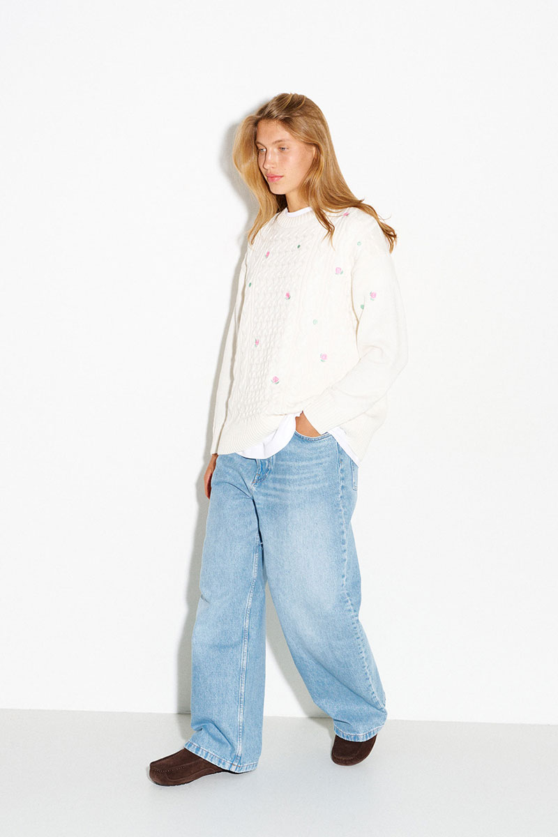 Молочный джемпер с косами и вышитыми розами. Цветы на джемпере выполнены гладью.