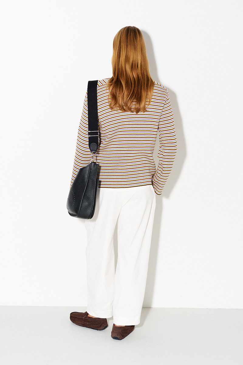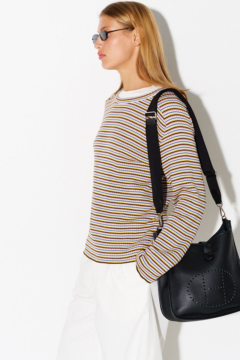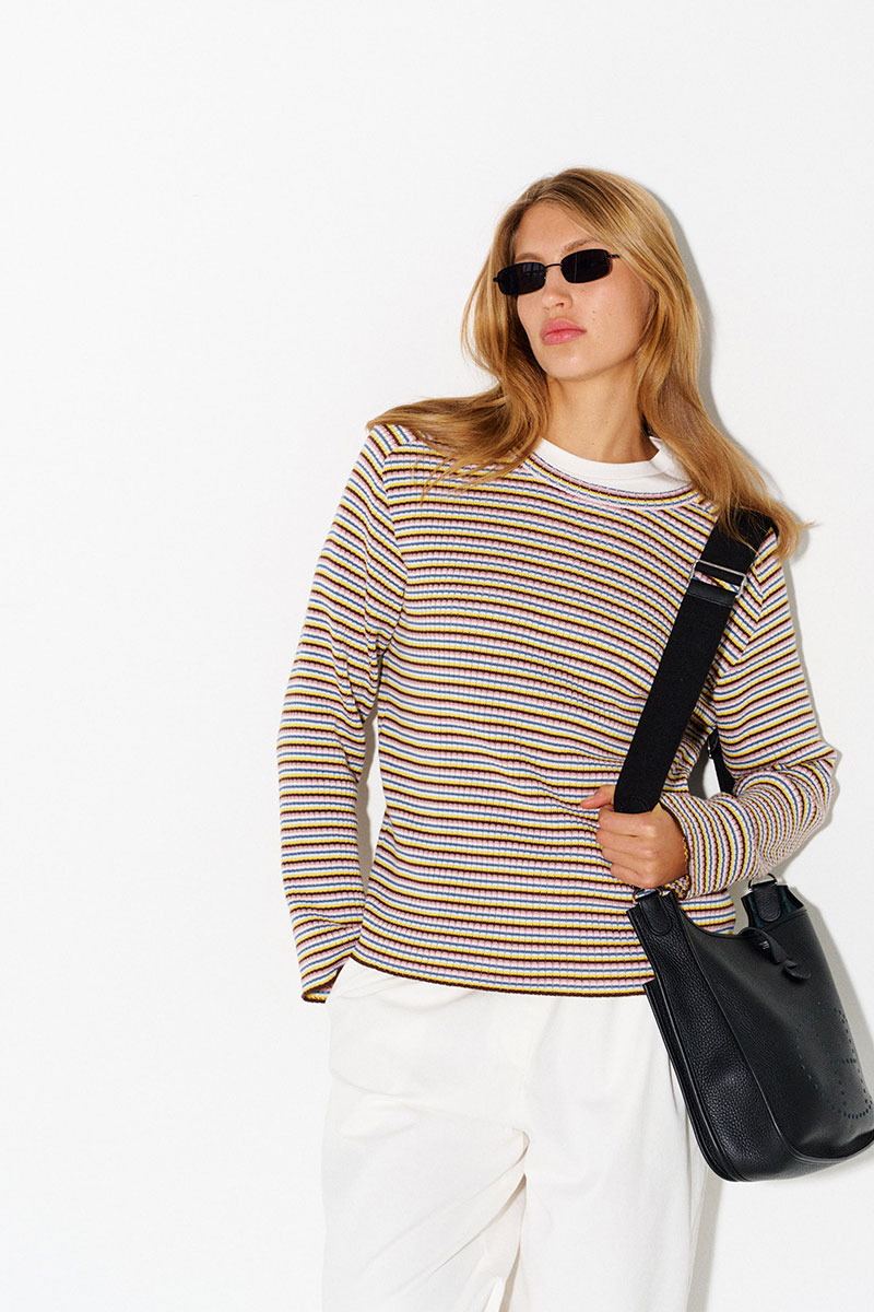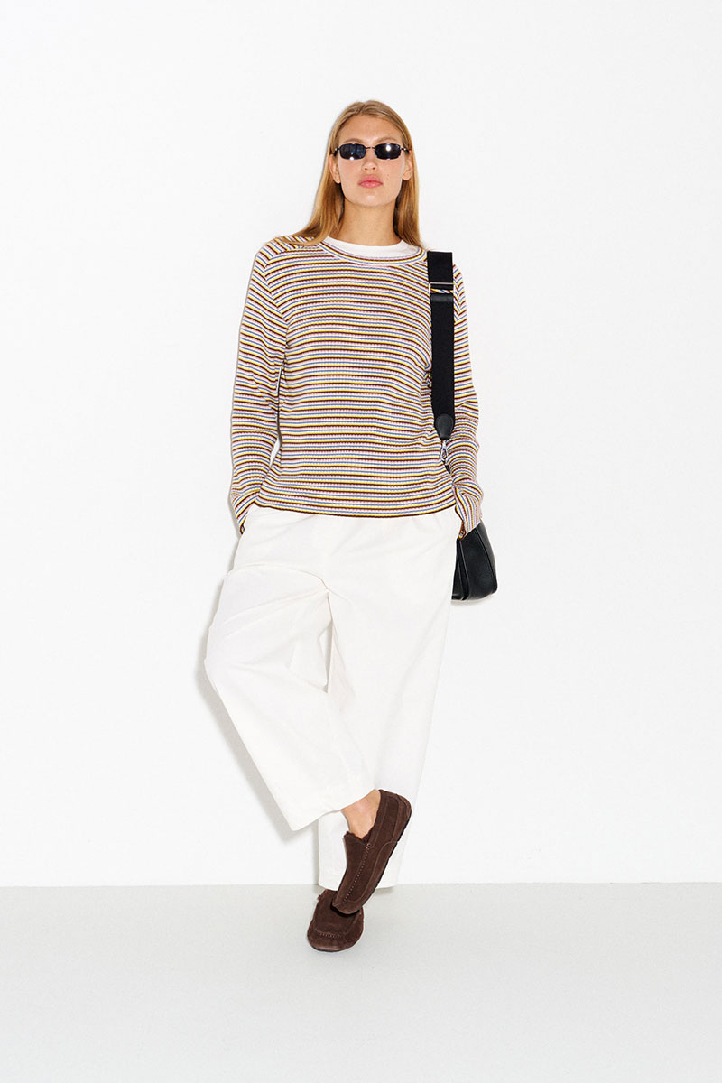 Джемпер в разноцветную тонкую полоску. Легкий, комфортный, приятный к телу. Имеет вырез «лодочка». Легко и интересно стилизуется в многослойных образах.