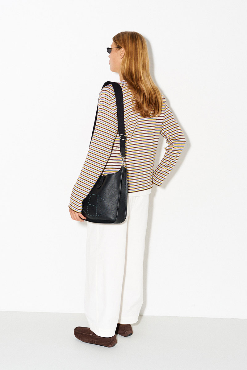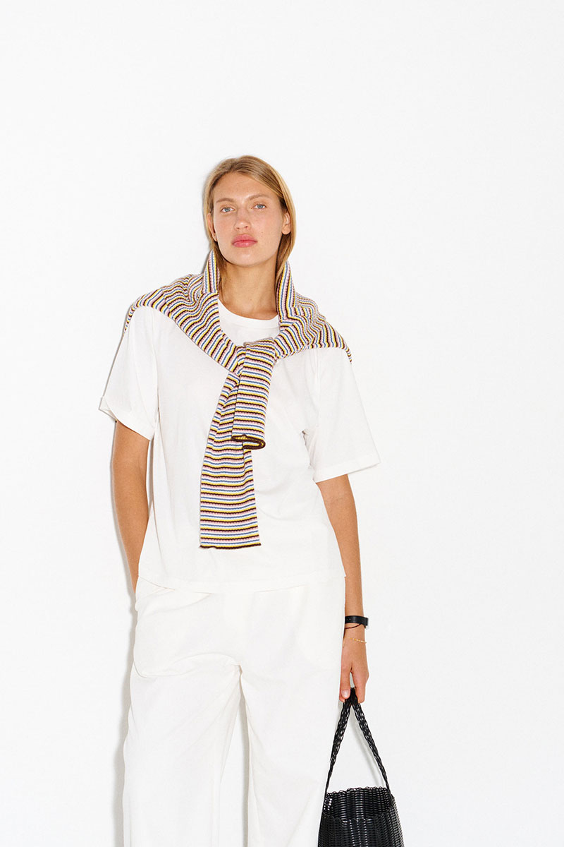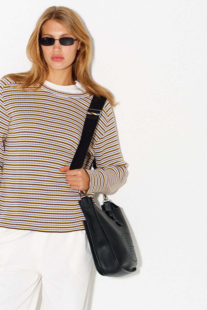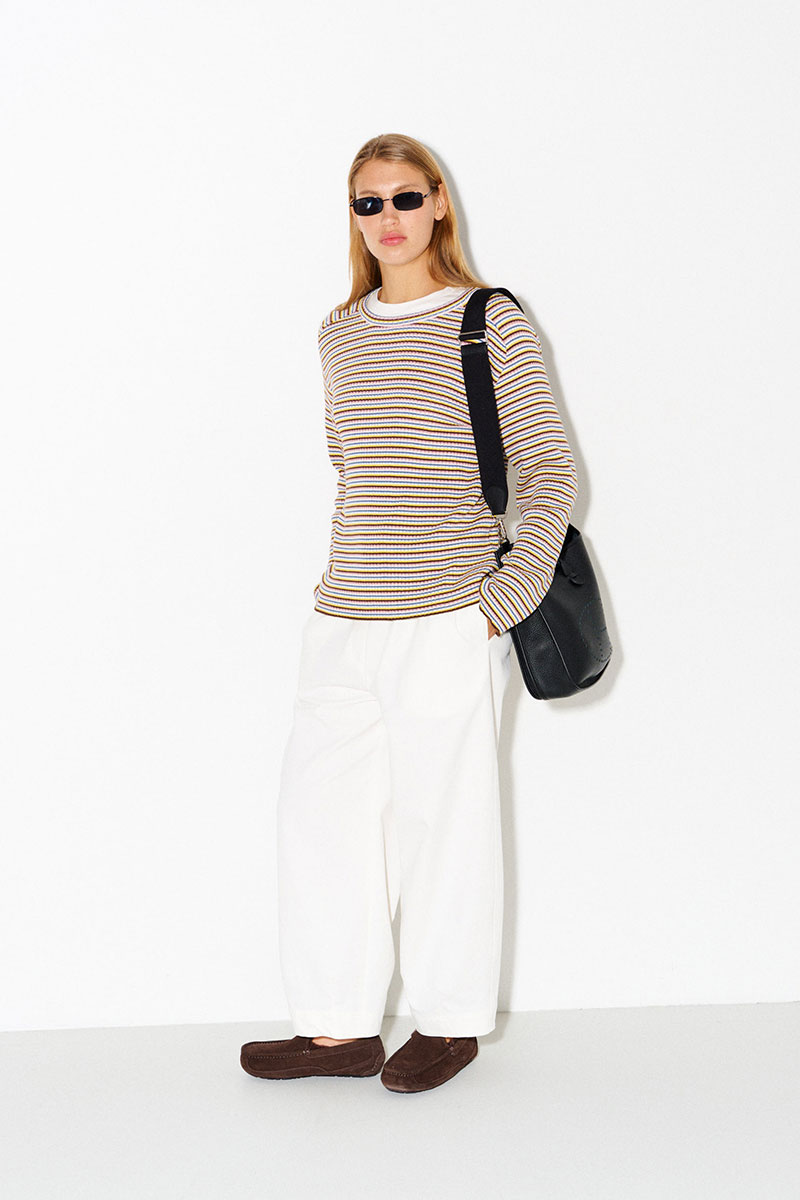 Джемпер в разноцветную тонкую полоску. Легкий, комфортный, приятный к телу. Имеет вырез «лодочка». Легко и интересно стилизуется в многослойных образах.