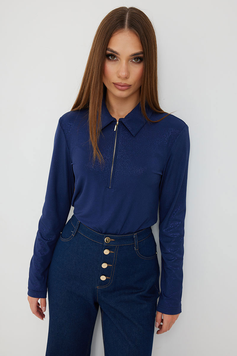 Джемпер женский трикотажный с воротником и молнией по переду. Рукав втачной длинный. Полуприлегающий силуэт придает стильный образ.