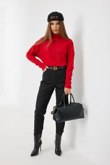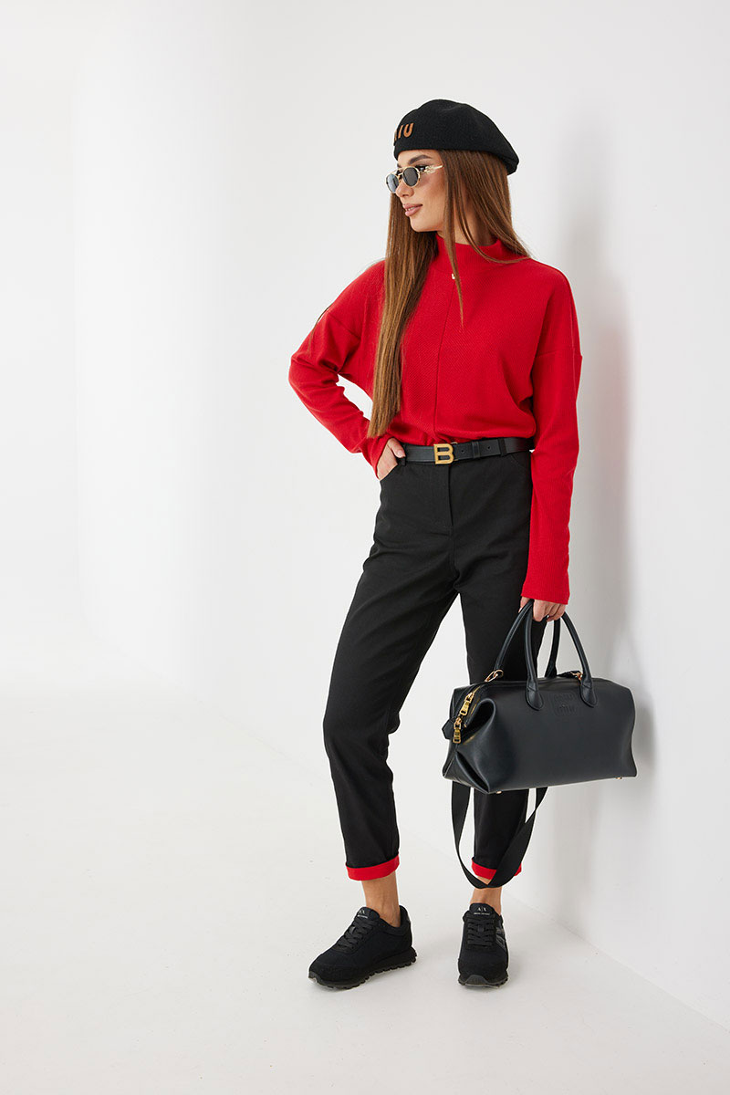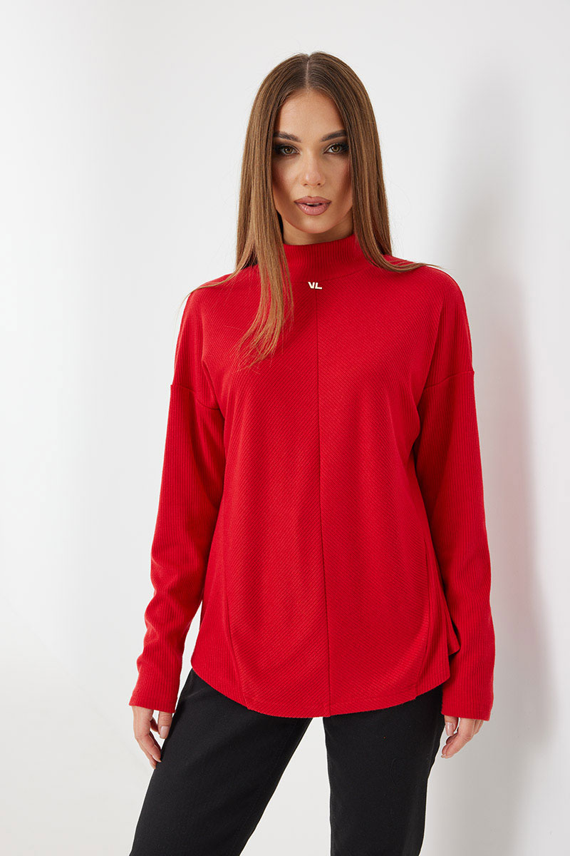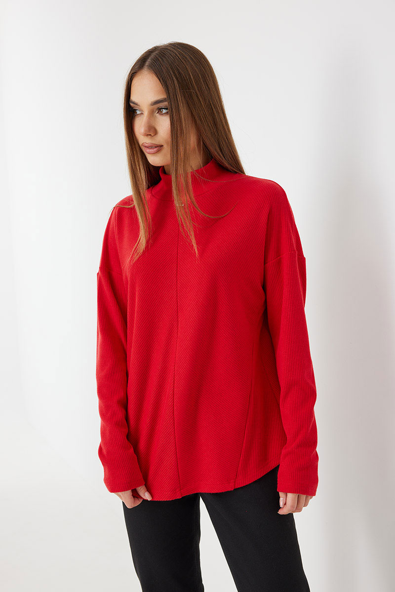 Джемпер свободного силуэта со спущенной на руку проймой. По горловине притачная стойка. По бокам джемпера фигурные подрезы. Рукав полной длины, зауженный к низу.