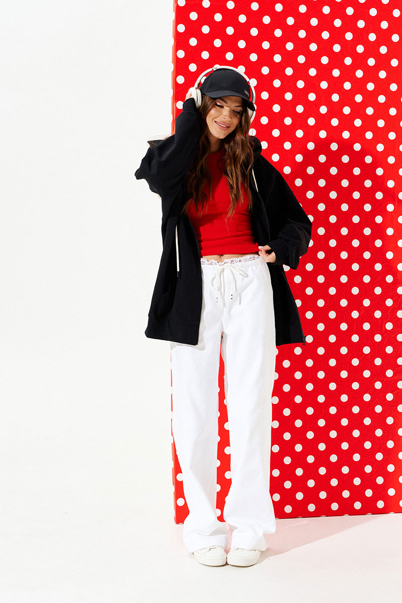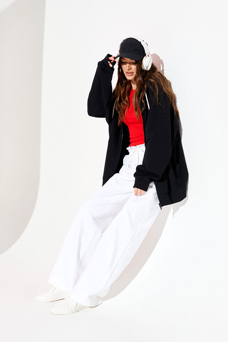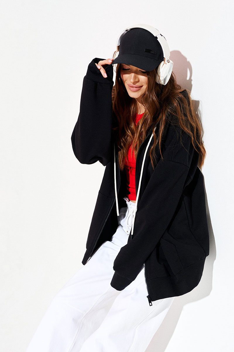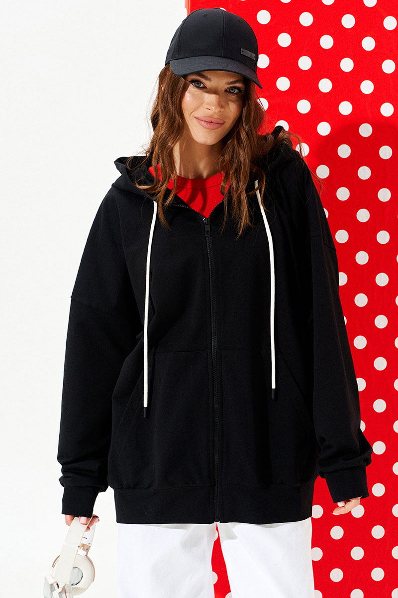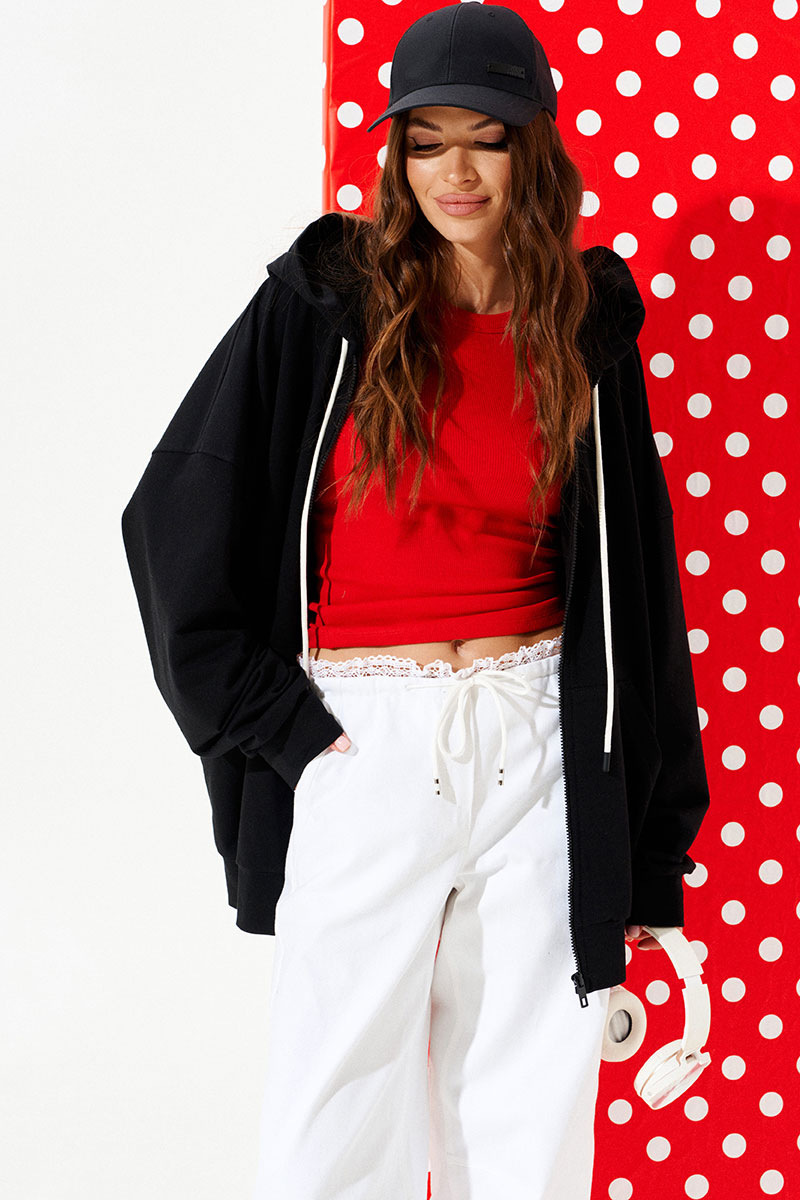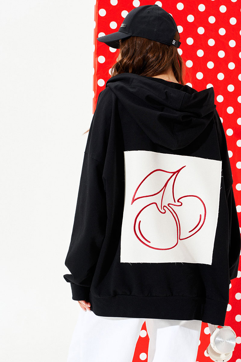 Толстовка из трикотажного полотна свободного объема, прямого силуэта, с капюшоном и центральной застежкой на тесьму-молнию. Детали переда с накладными карманами. Спинка цельная с настрочной деталью с вышивкой «Вишня». Рукав втачной, одношовный, длинный. Низ изделия и рукава обработаны притачной манжетой. Капюшон на обтачке, одношовный, через обметанные петли в кулиску продет декоративный шнур с металлическими наконечниками.
