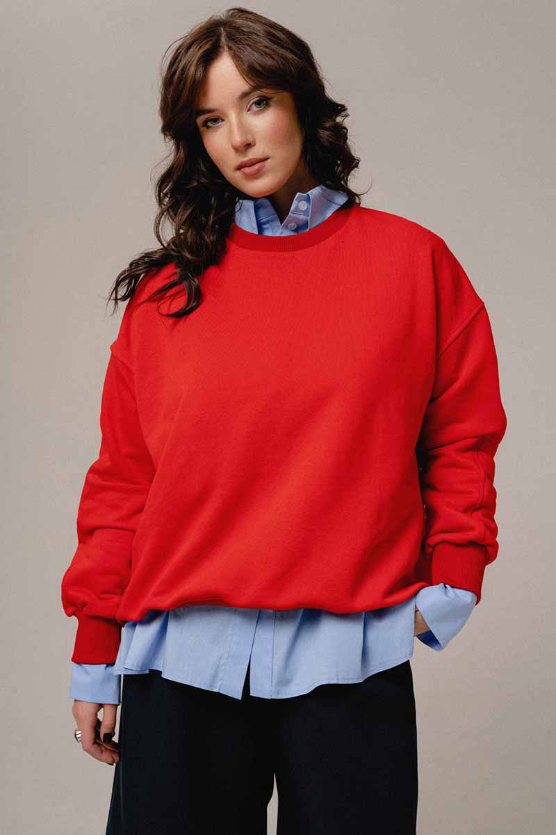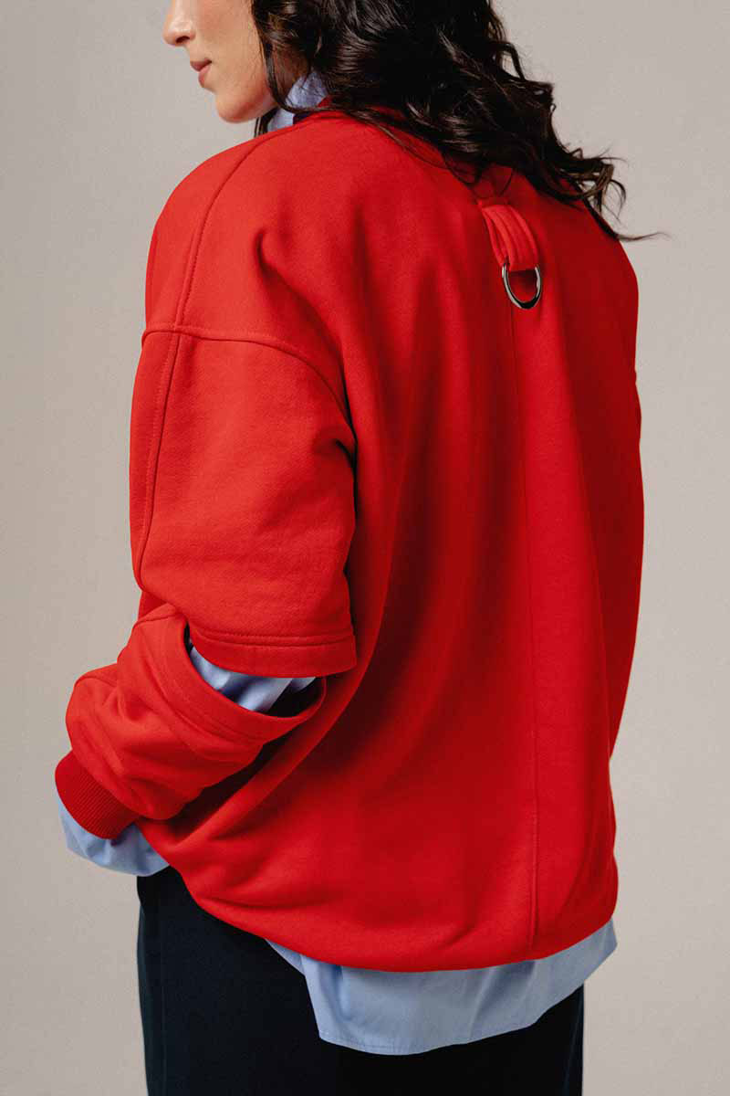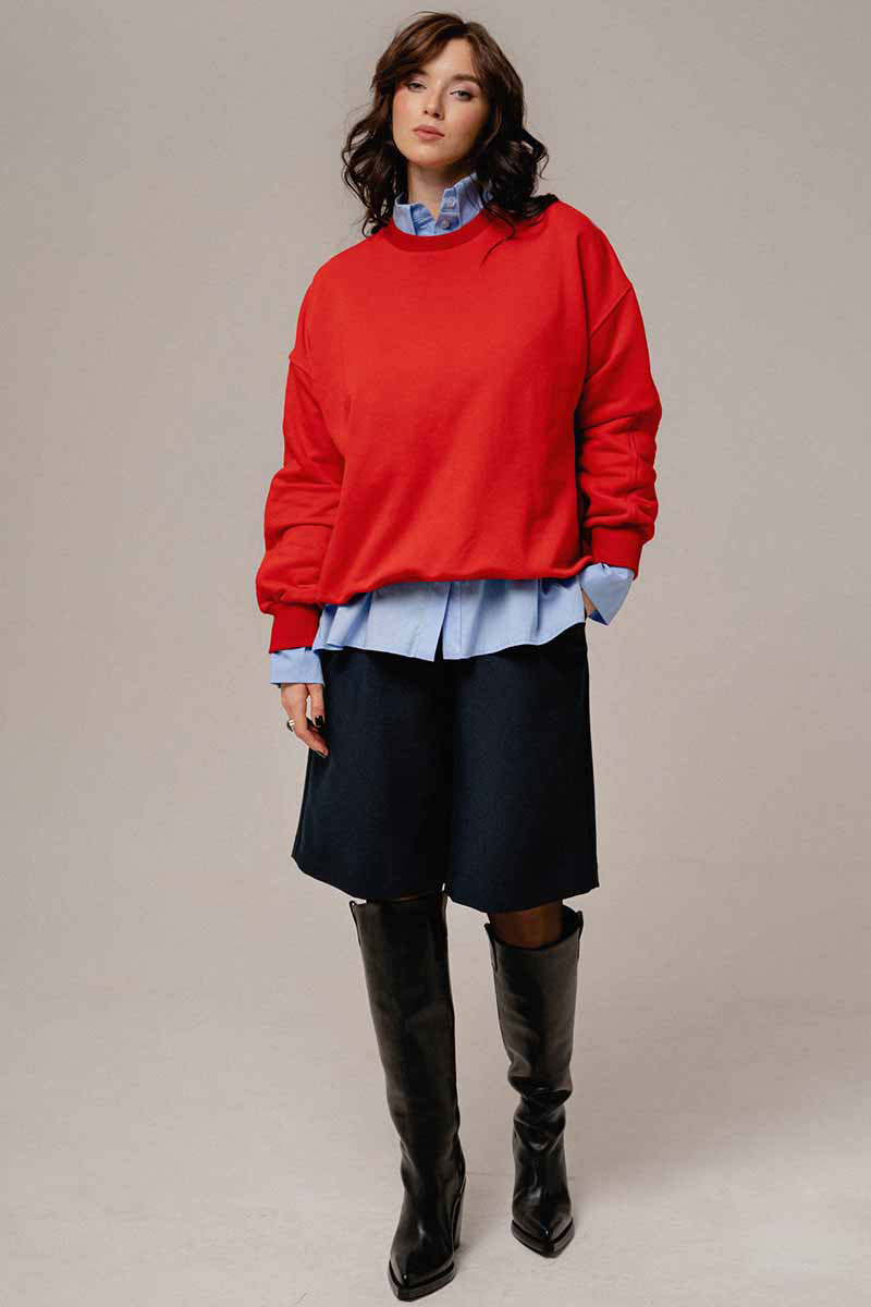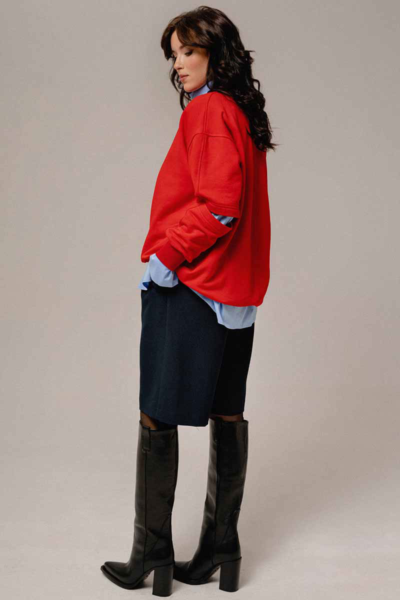 Джемпер молодежный из трикотажного полотна прямого объемного силуэта, со спущенной линией плеча, с довязами по горловине, рукавам и низу изделия. Рукав с разрезом по линии локтя. Декор - пата по спинке на уровне лопаток и кольцом в ней.