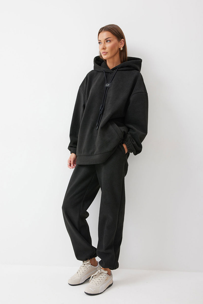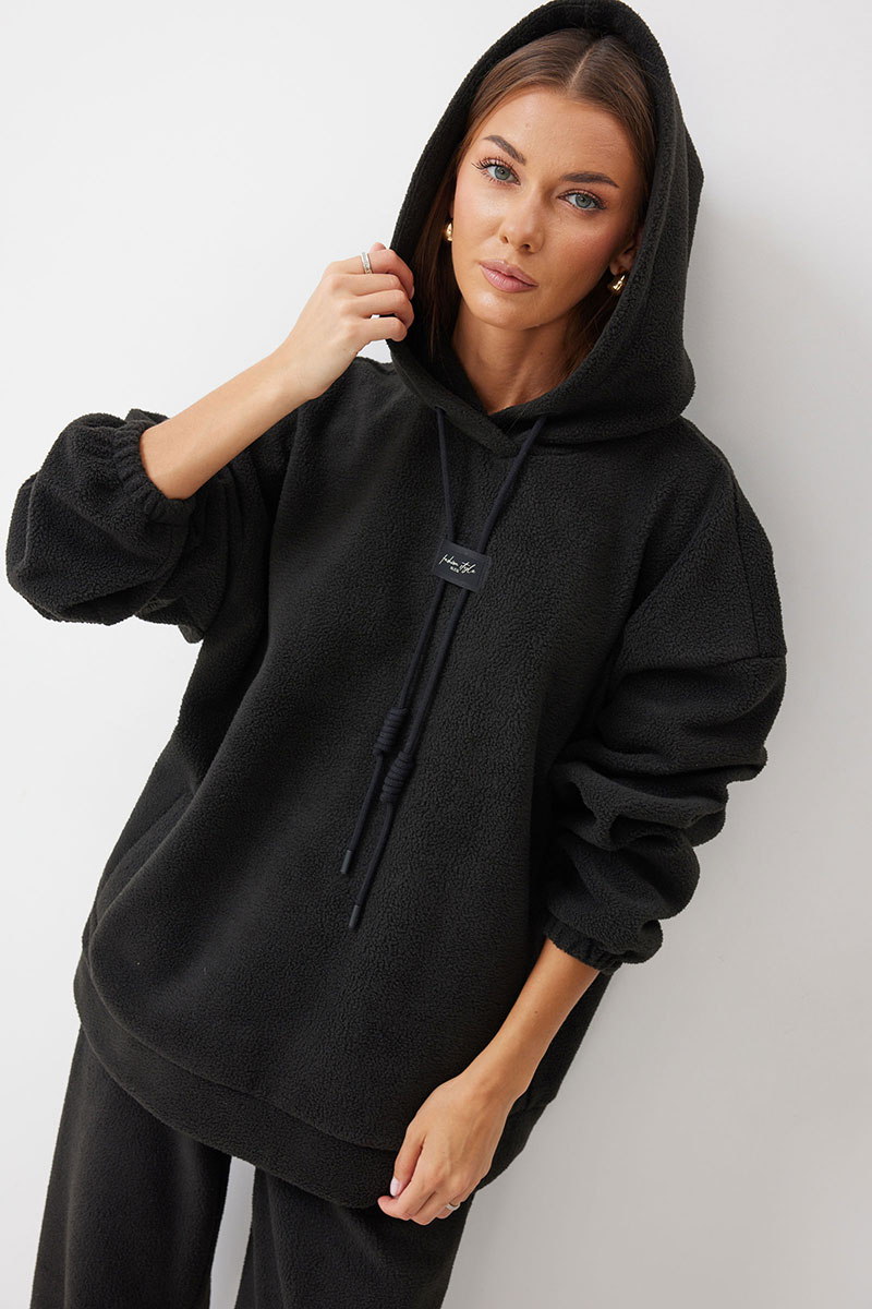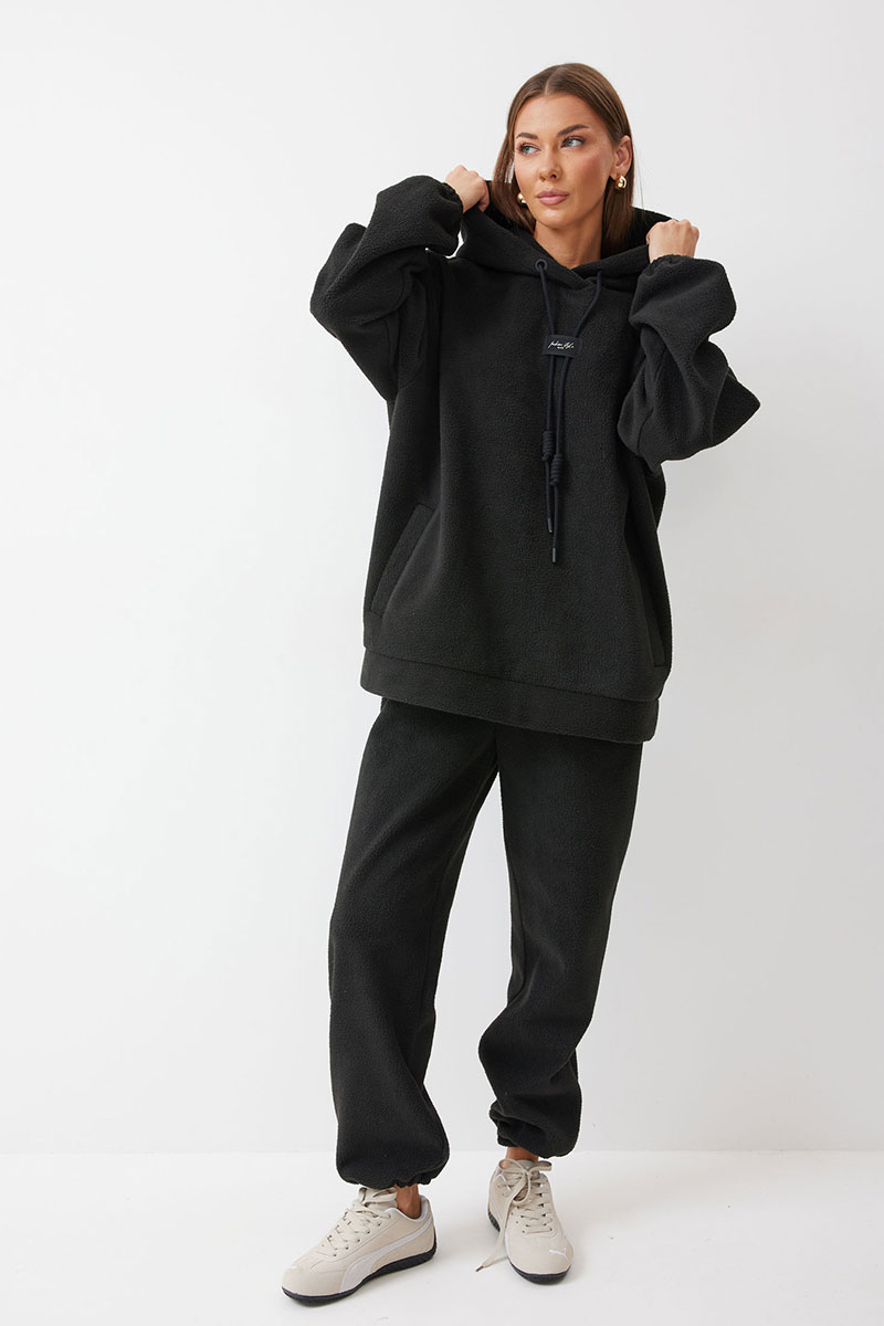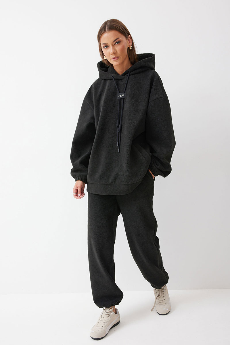 Джемпер прямого силуэта из комфортного трикотажного полотна. Горловина обработана капюшоном. Рукав со спущенной линией плеча, по низу на резинке. По низу джемпера притачной пояс. По переду декоративная нашивка и шнур.