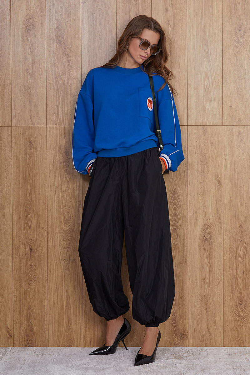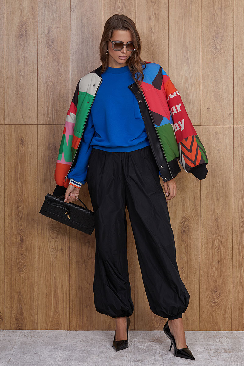 Объемный свитшот из плотного премиального трикотажного полотна. Изделие прямое. Горловина круглая с притачной планкой из отделочной ткани. Рукав спущенный, длинный, объемный. Низ рукава на манжете из отделочной ткани. Низ изделия на планке из отделочной ткани. Перед и спинка изделия прямые. На передней половинке джемпера накладной карман и авторская вышивка. По плечевому шву изделия и рукаву вставлен декоративный кант из отделочной ткани.