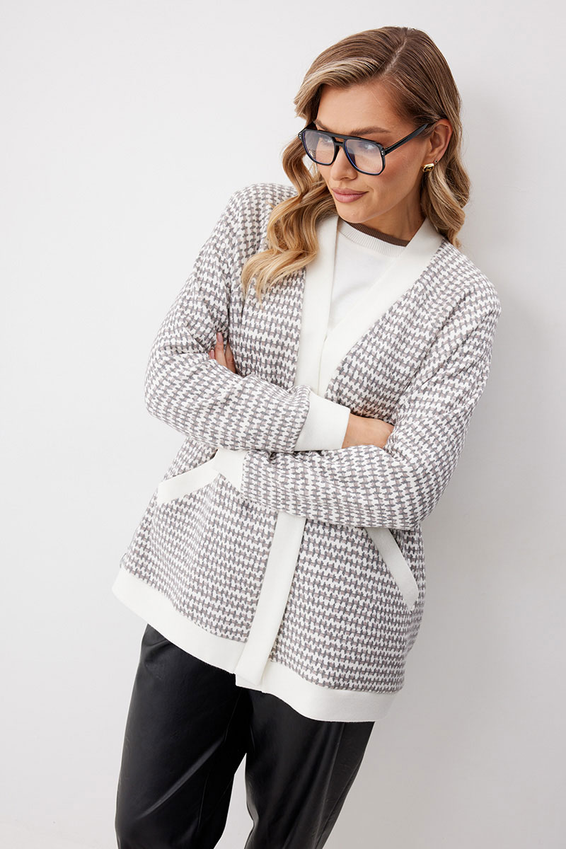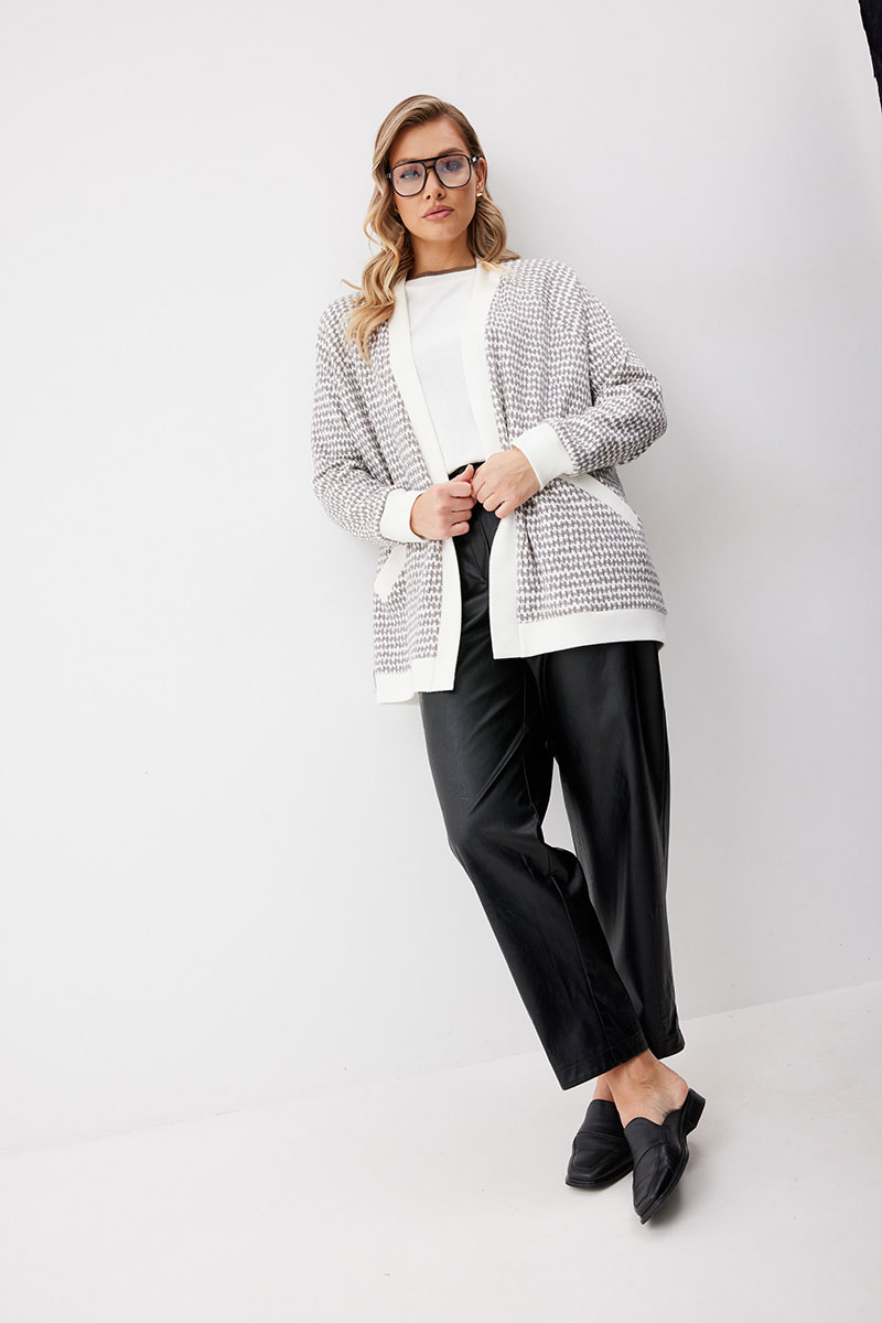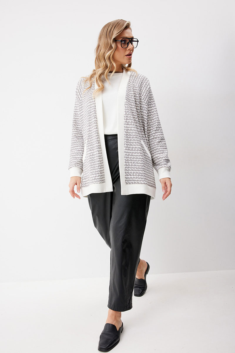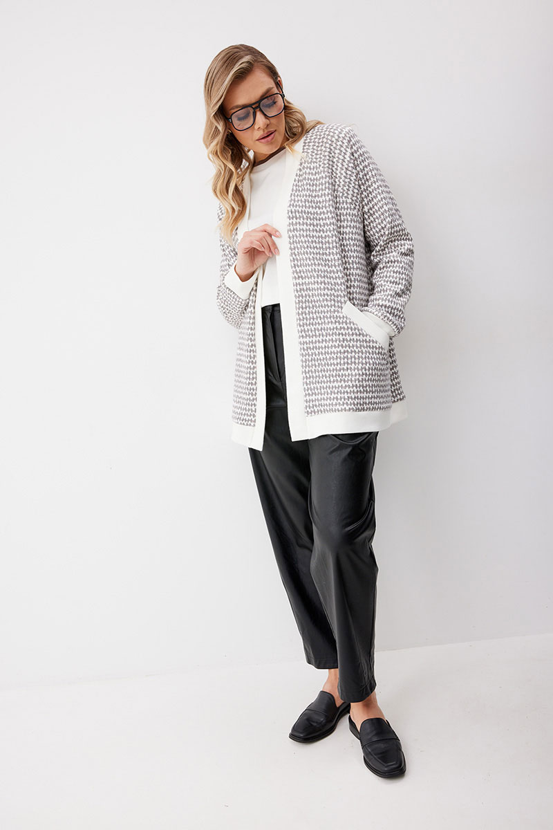 Кардиган женский прямого силуэта без подкладки из трикотажной ткани. По передним деталям кардигана располагаются прорезные карманы с листочкой из отделочной ткани. Спинка прямая. Рукав - реглан. По низу рукава пришита манжета из отделочной ткани. Линия борта, низа и горловины кардигана обработана притачными отделочными деталями.