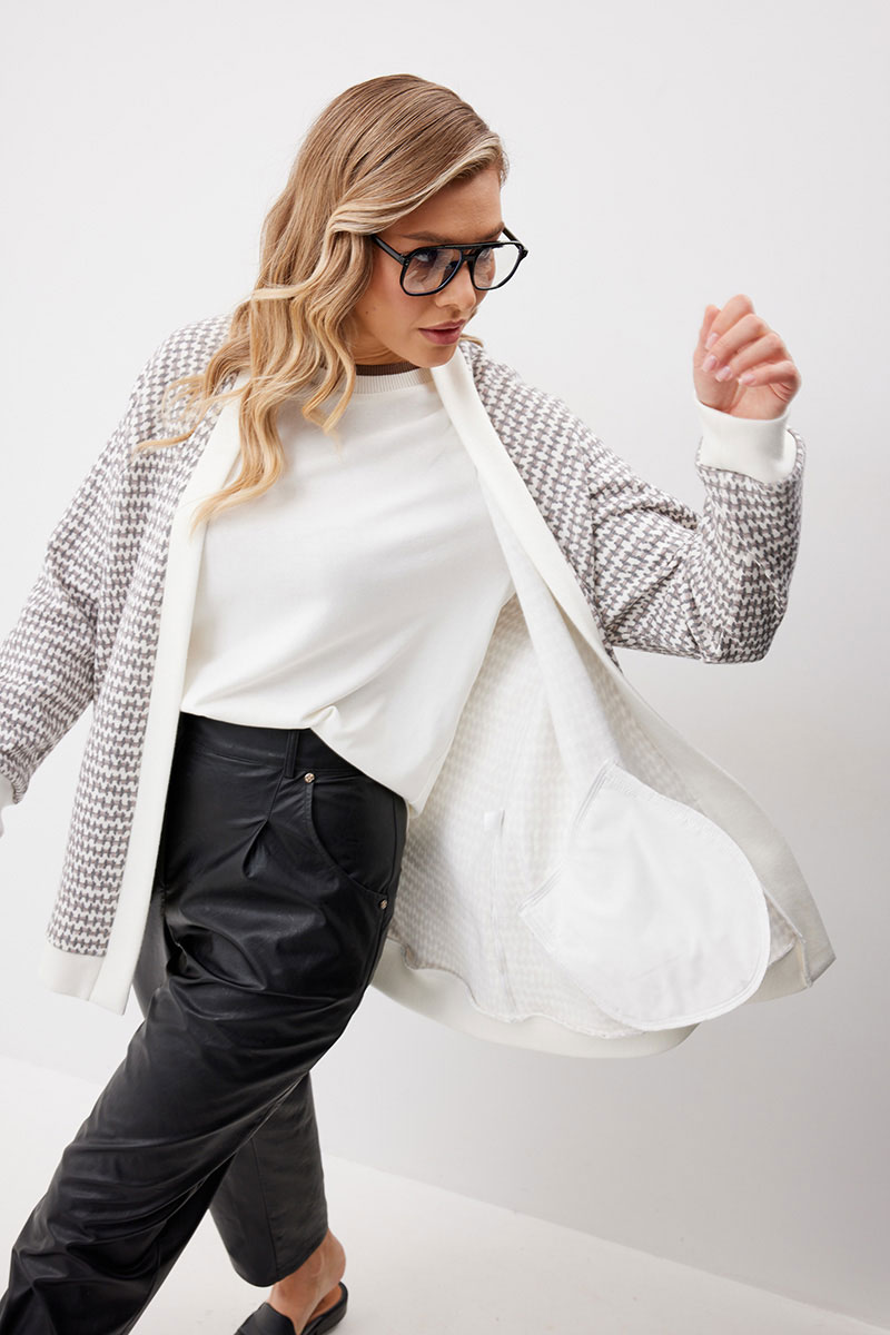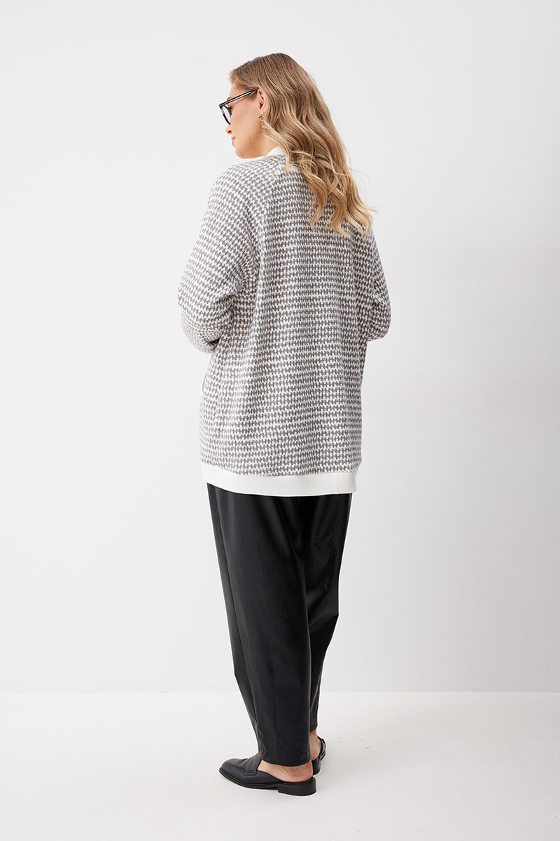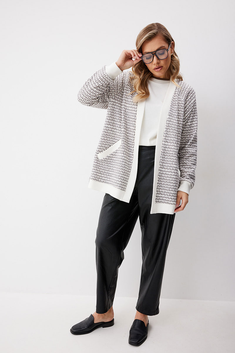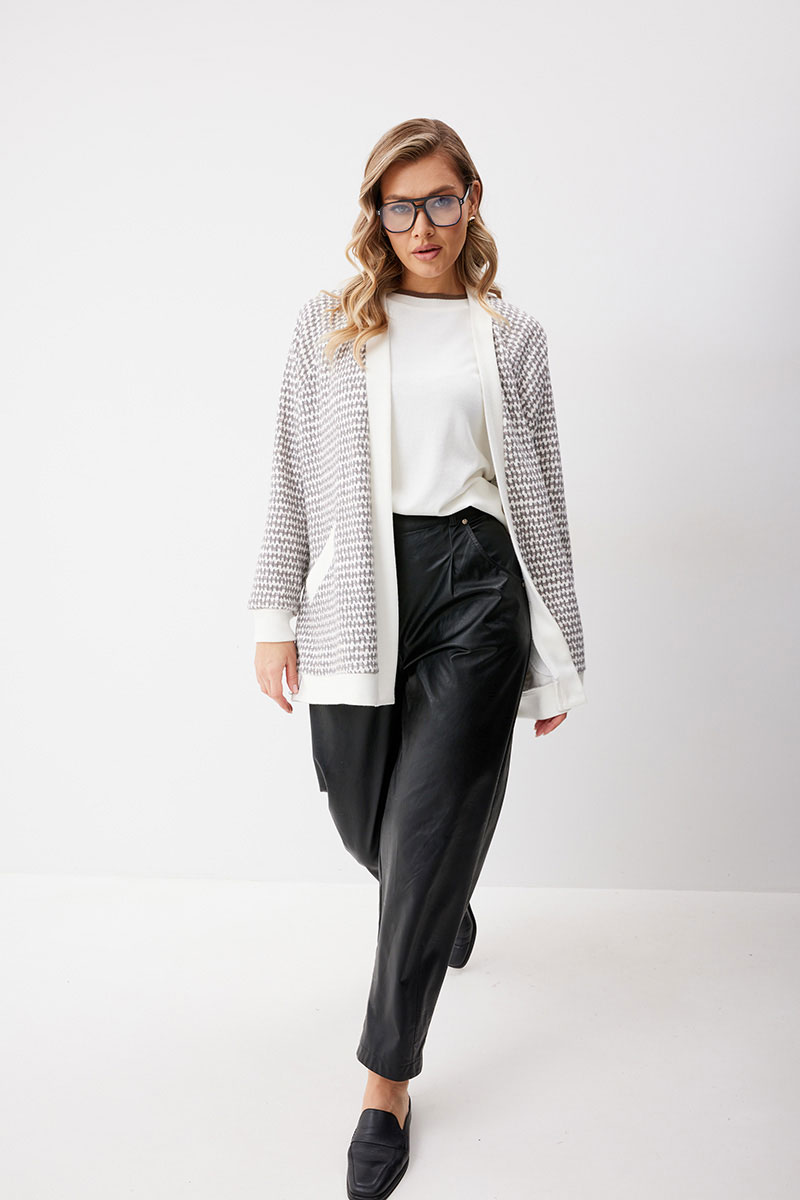 Кардиган женский прямого силуэта без подкладки из трикотажной ткани. По передним деталям кардигана располагаются прорезные карманы с листочкой из отделочной ткани. Спинка прямая. Рукав - реглан. По низу рукава пришита манжета из отделочной ткани. Линия борта, низа и горловины кардигана обработана притачными отделочными деталями.