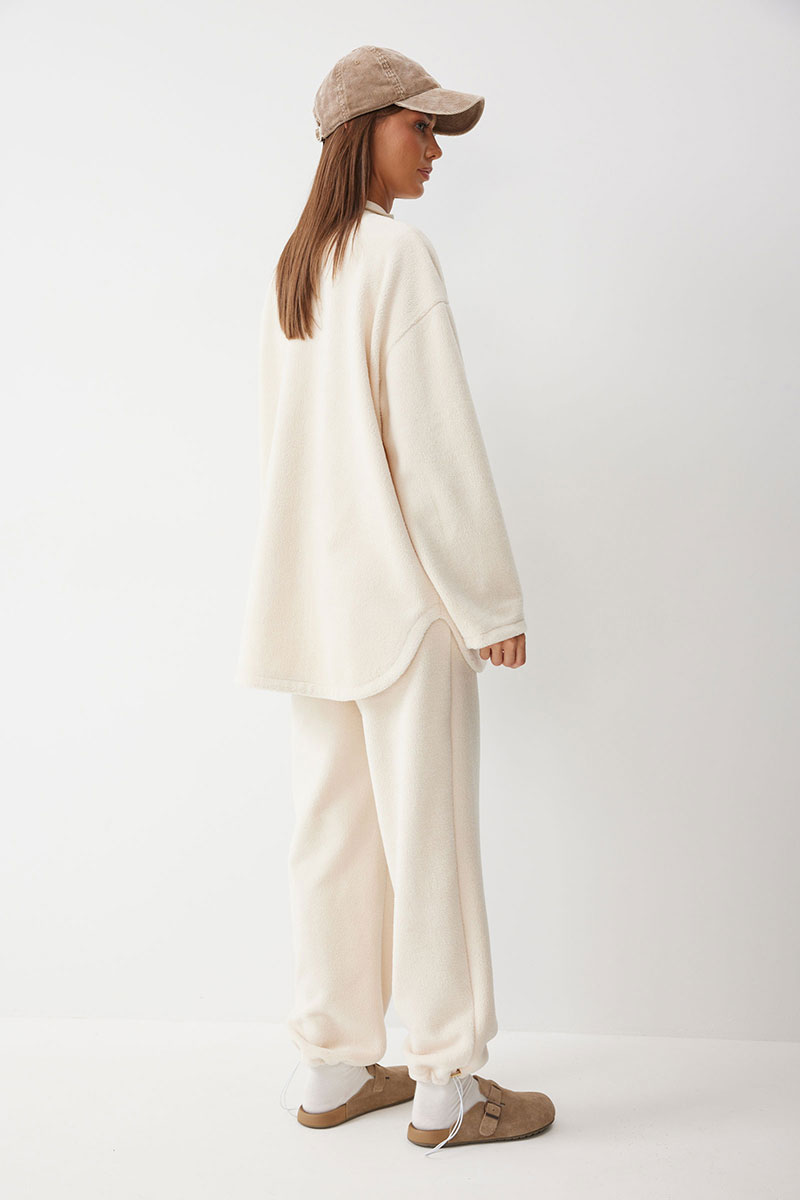 Жакет прямого силуэта с фигурным низом из трикотажного полотна. Горловина округлая, по центру застежка на кнопки. Рукав со спущенной линией плеча. По переду накладные карманы. Жакет без подкладки.
