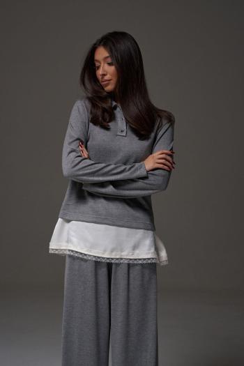 Джемпер прилегающего силуэта, выполнен из трикотажного полотна серого цвета. Характеристики: прилегающий силуэт, овальная горловина, рукав втачной, по переду изделия декоративный узел.