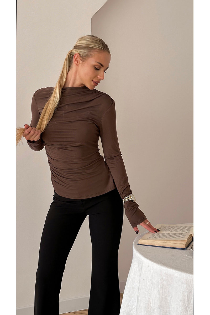 Блузка приталенного кроя, с элементами сборки на линии талии и плеча. Рост модели 168 см.