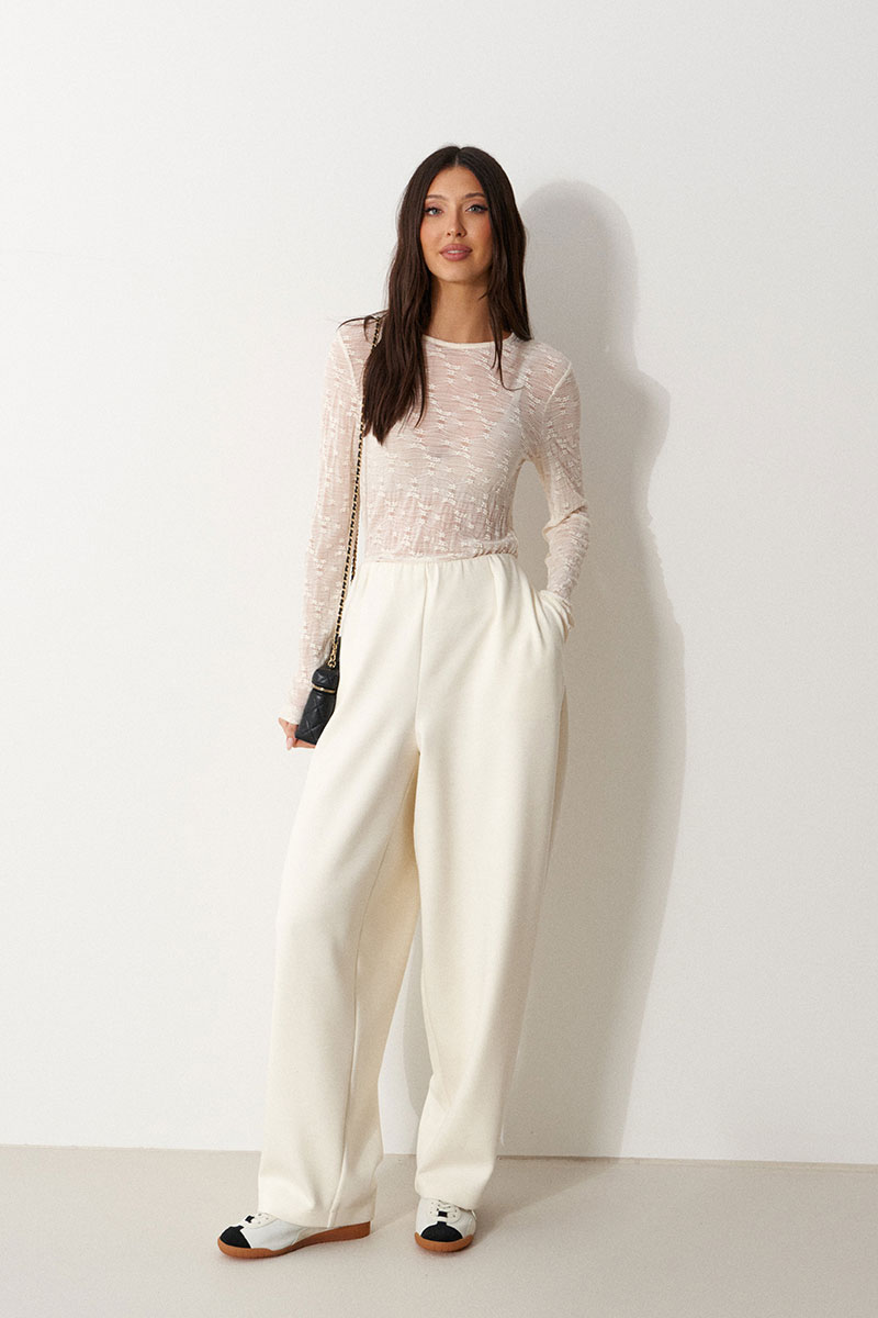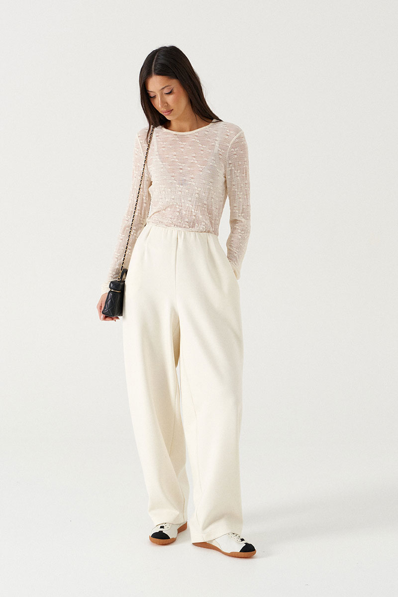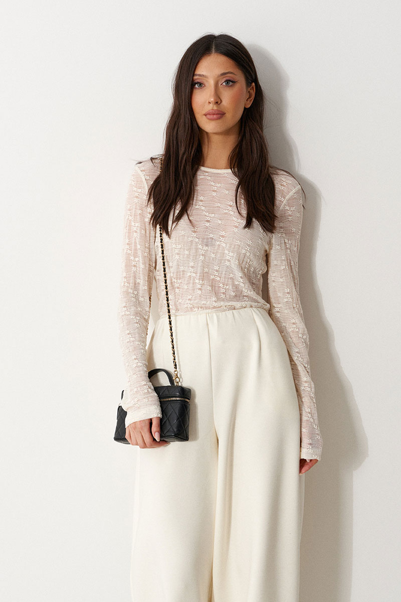 Джемпер прилегающего силуэта. Выполнен из кружевного полотна цвета шампанского. Характеристика: горловина обработана косой бейкой. Рукав одношовный втачной. Низ рукава и низ изделия обработаны в подгибку с открытым срезом.