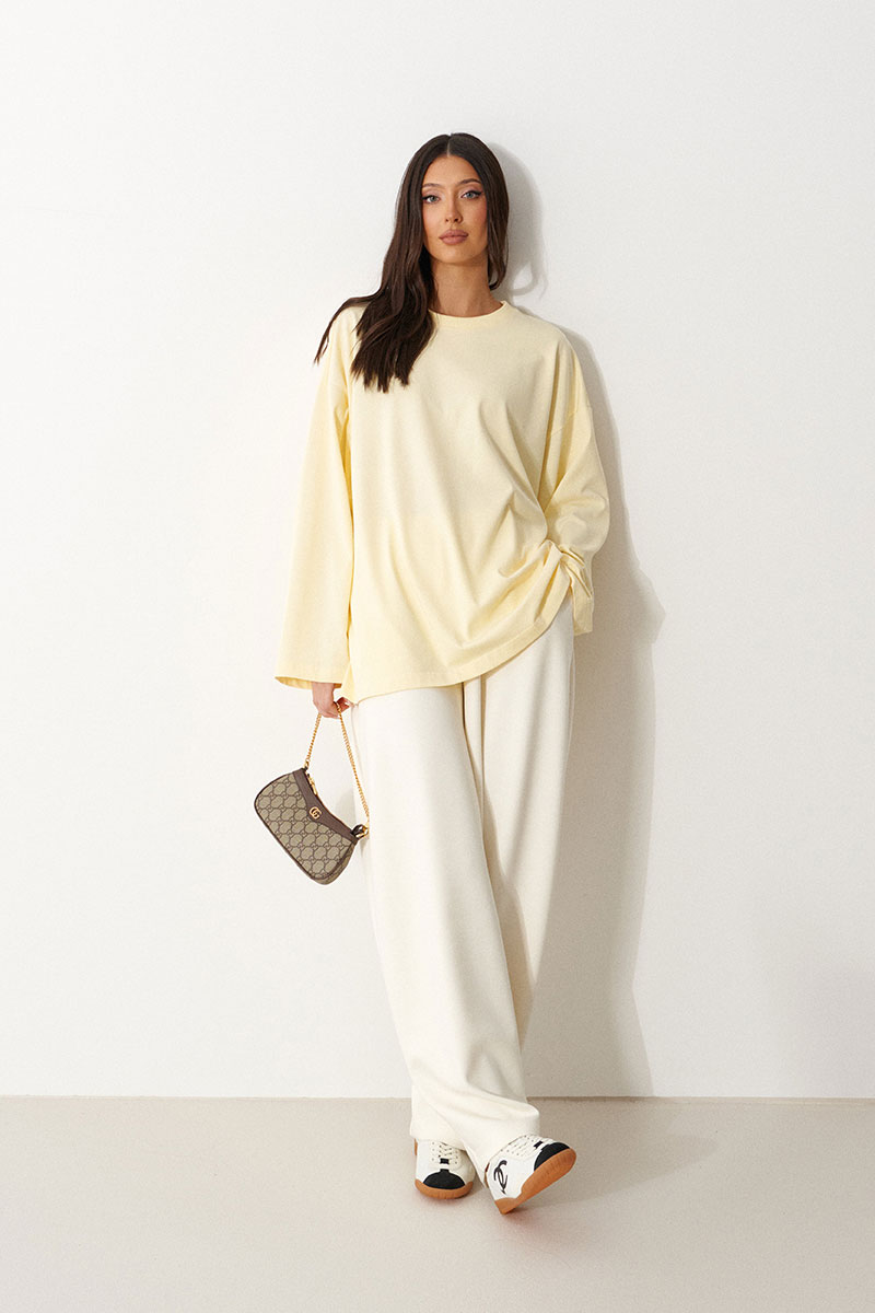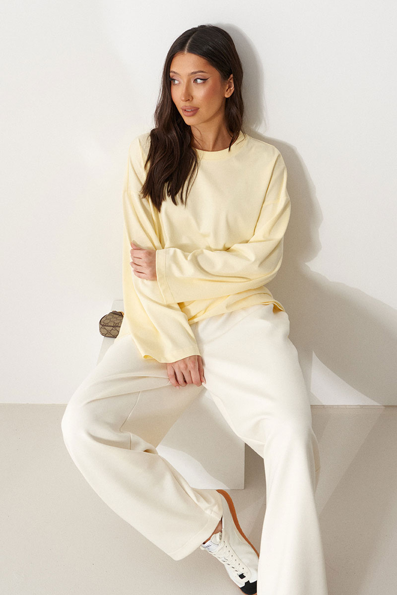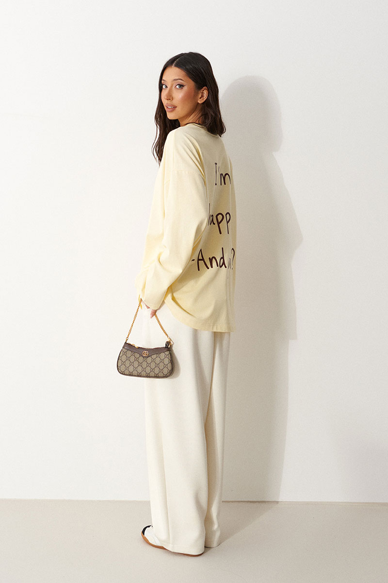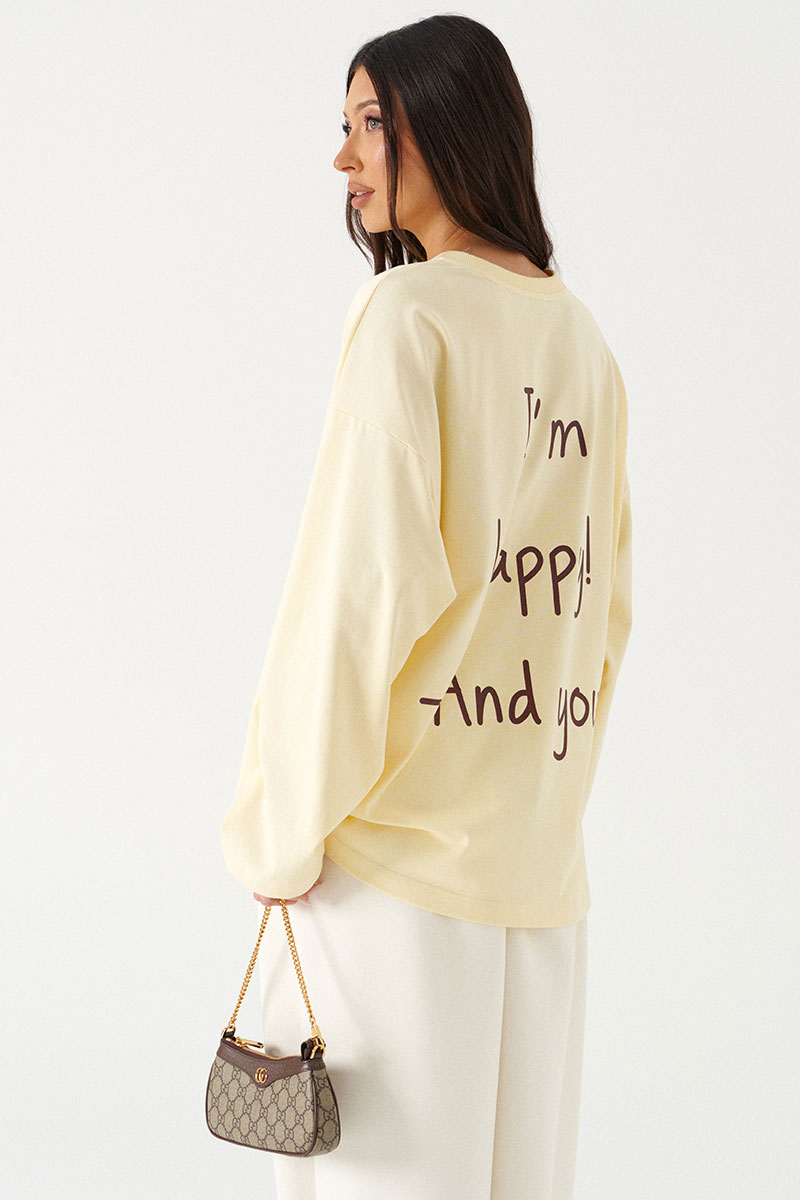 Джемпер прямого свободного кроя, выполнен из трикотажного полотна лимонного цвета. Характеристики: прямой крой, овальный вырез горловины, горловины из довяза, спинка цельнокроеная, Ппринт "I'm happy! And you?", спущенное плечо, вточной длинный рукав.