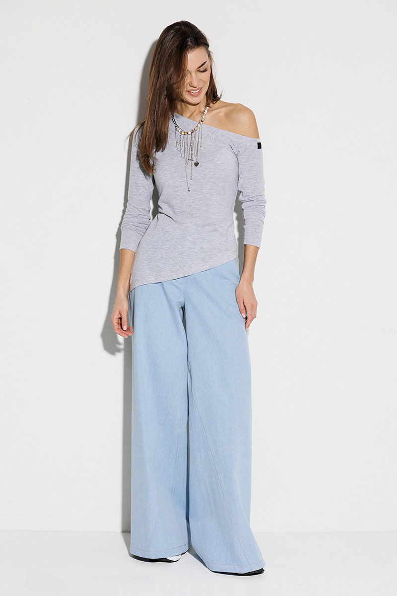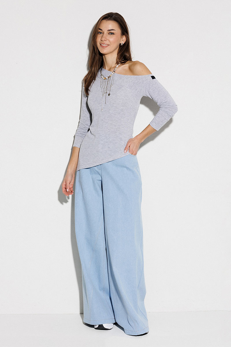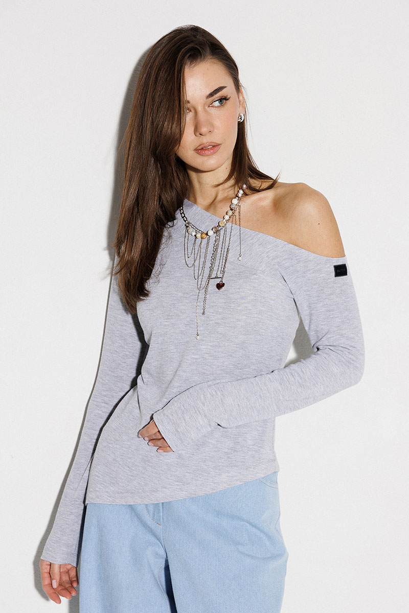 Джемпер асимметричный, прилегающего силуэта с втачным длинным рукавом. Джемпер со спущенной линией плеча на левом рукаве, который переходит в планку по горловине. На левом рукаве нашивка "BUTER". Полочка с фигурным низом.