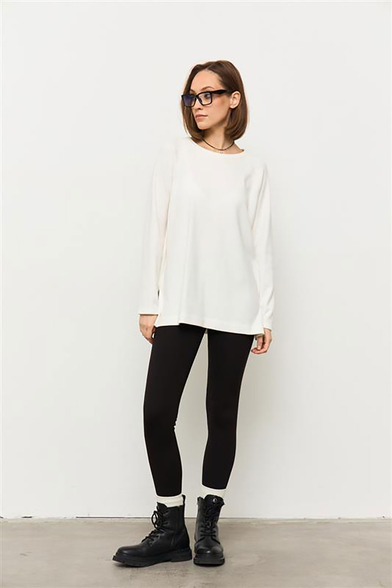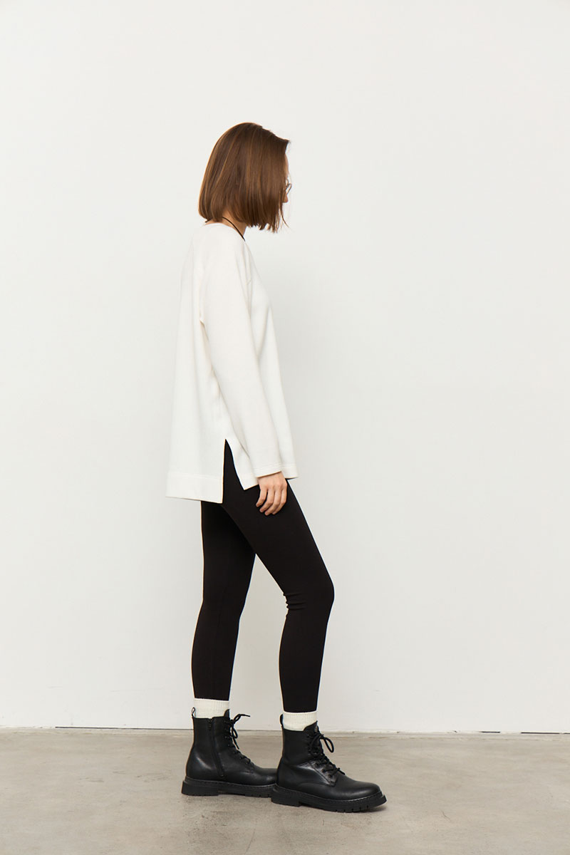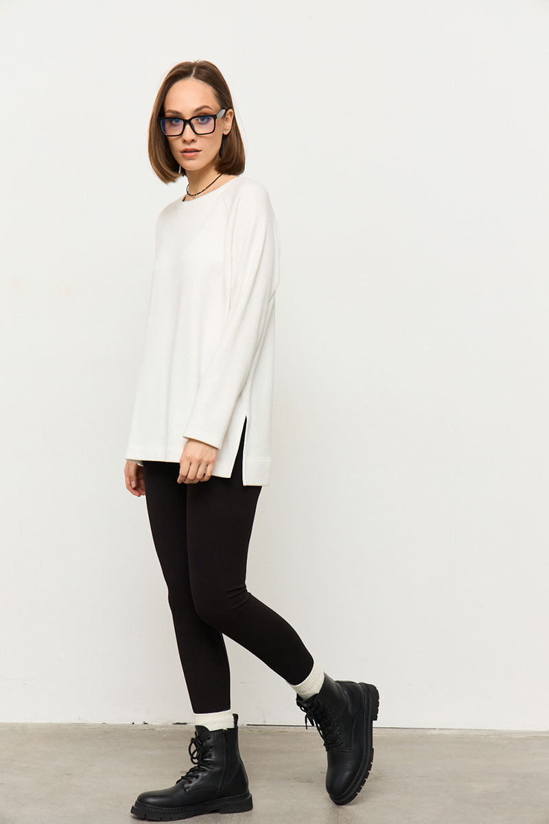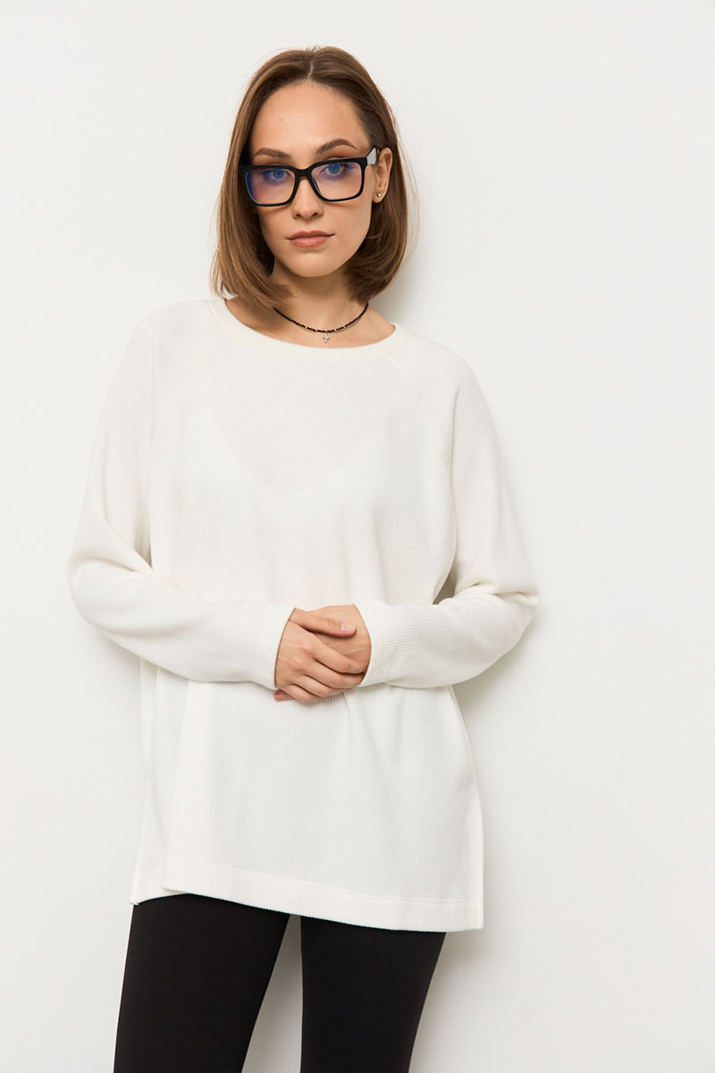 Джемпер прямого силуэта из мягкой трикотажной ткани в рубчик с велюровым эффектом с круглой горловиной и рукавами - реглан. В боковых швах разрезы. Спинка длиннее переда на 2 см по боковому шву.